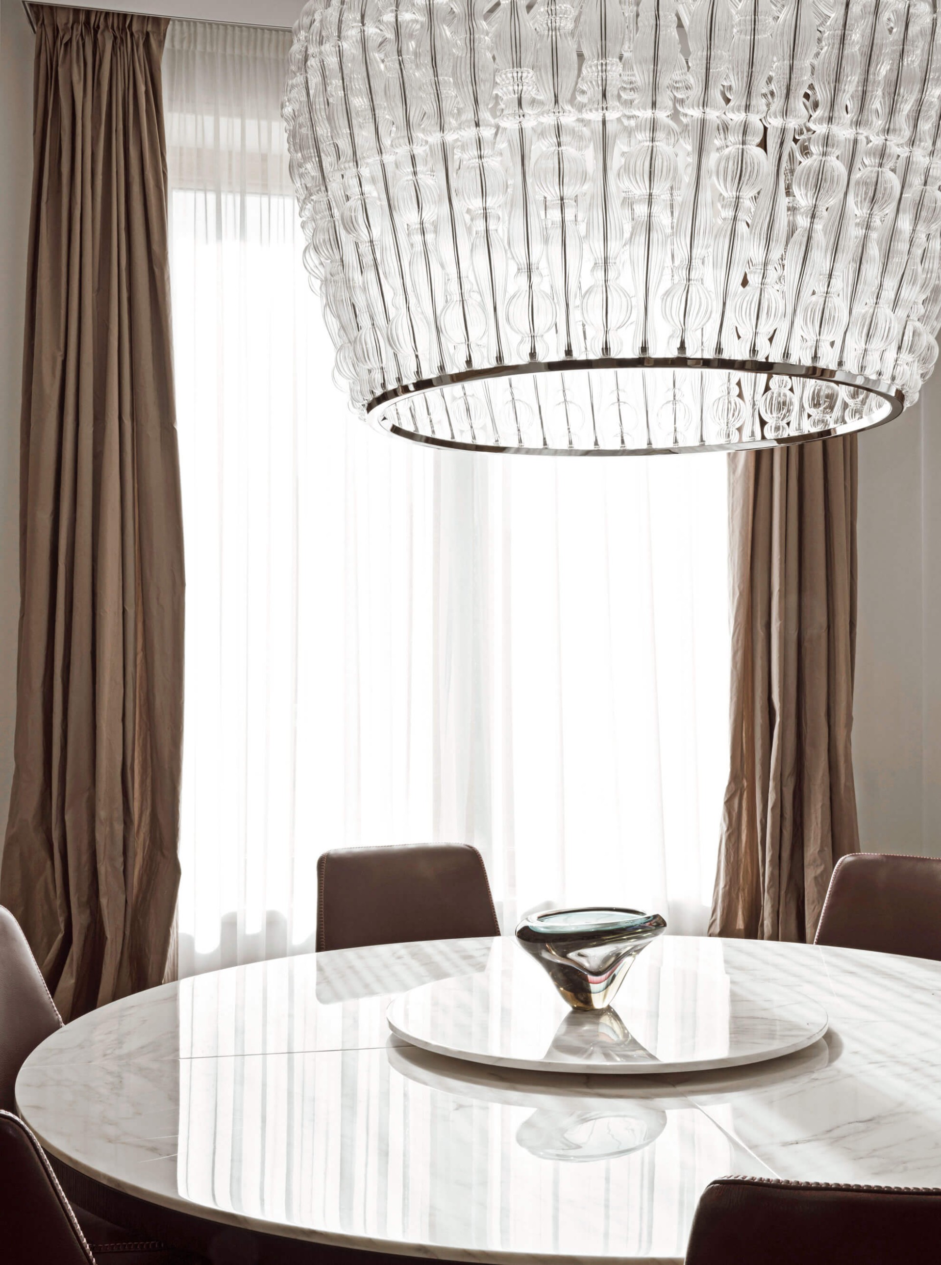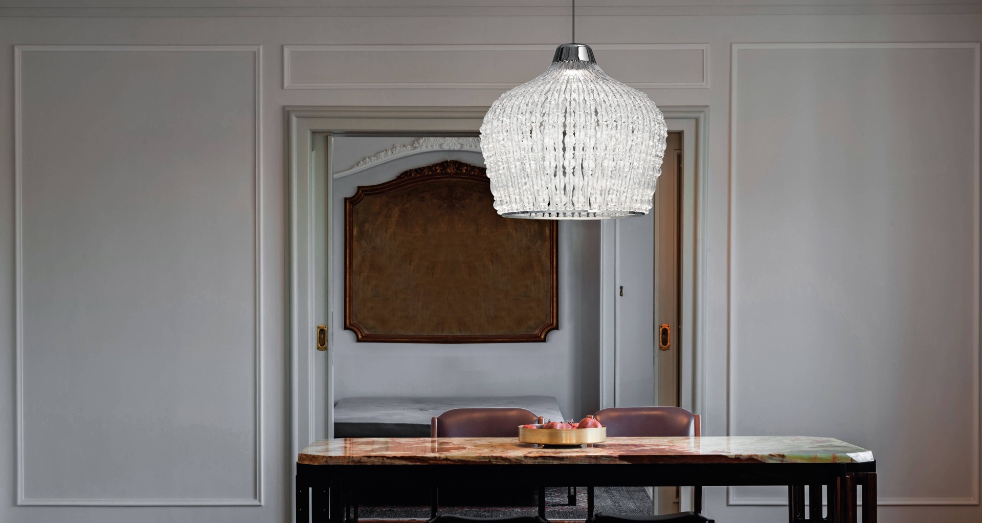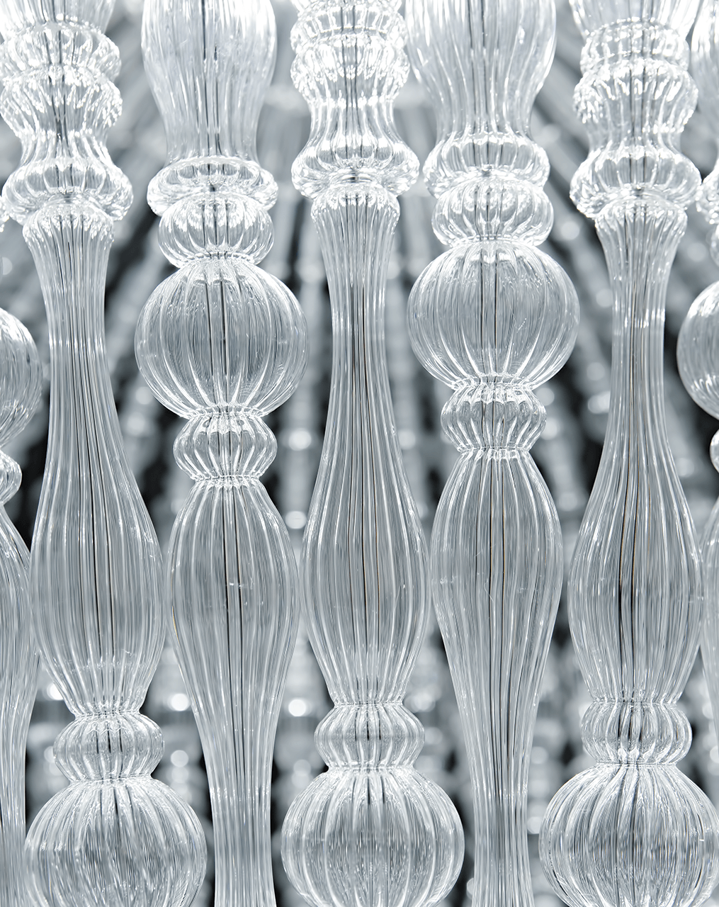 Подвесной светильник с хромированной металлической конструкцией и элементами из прозрачного дутого стекла.
