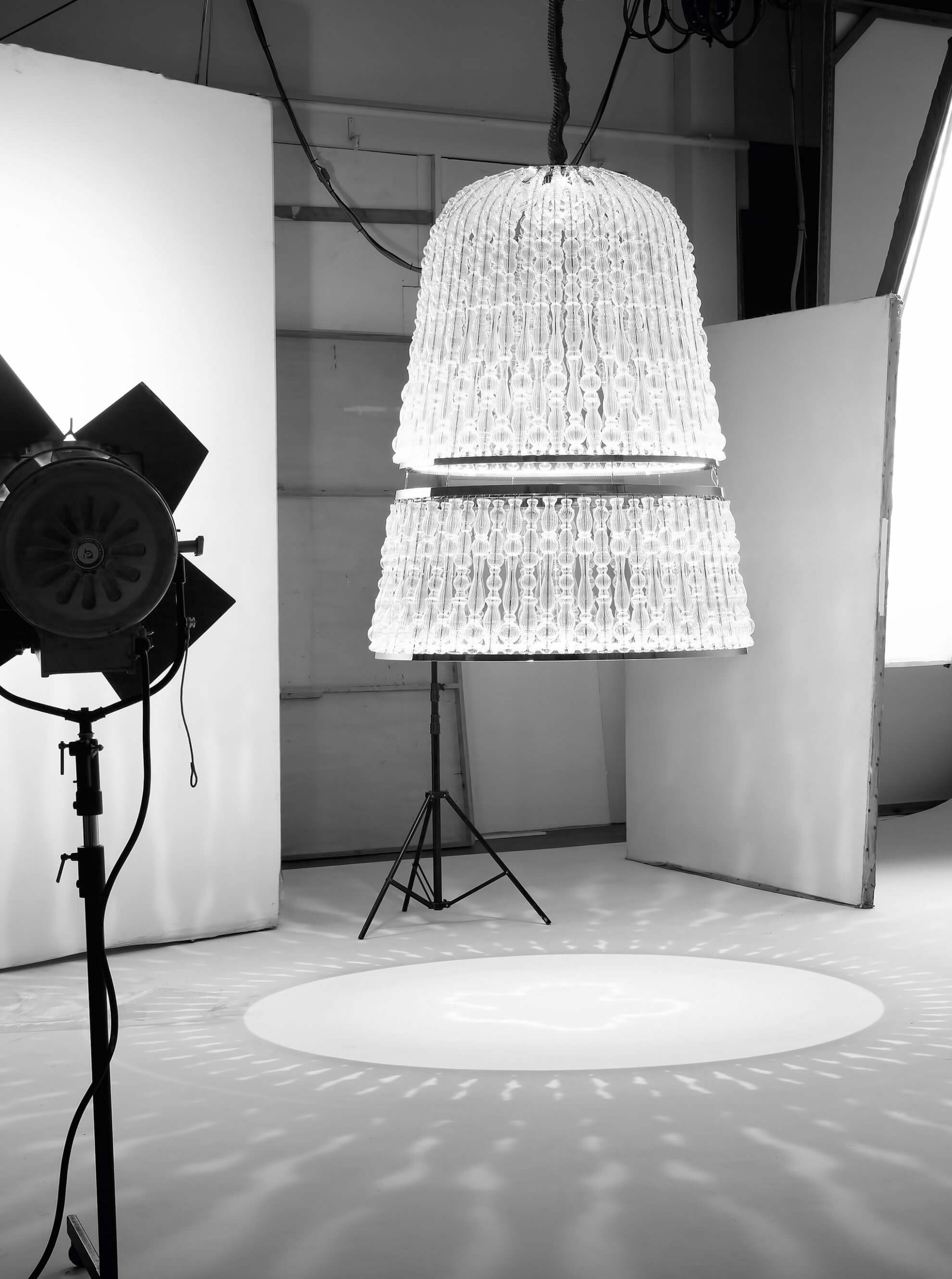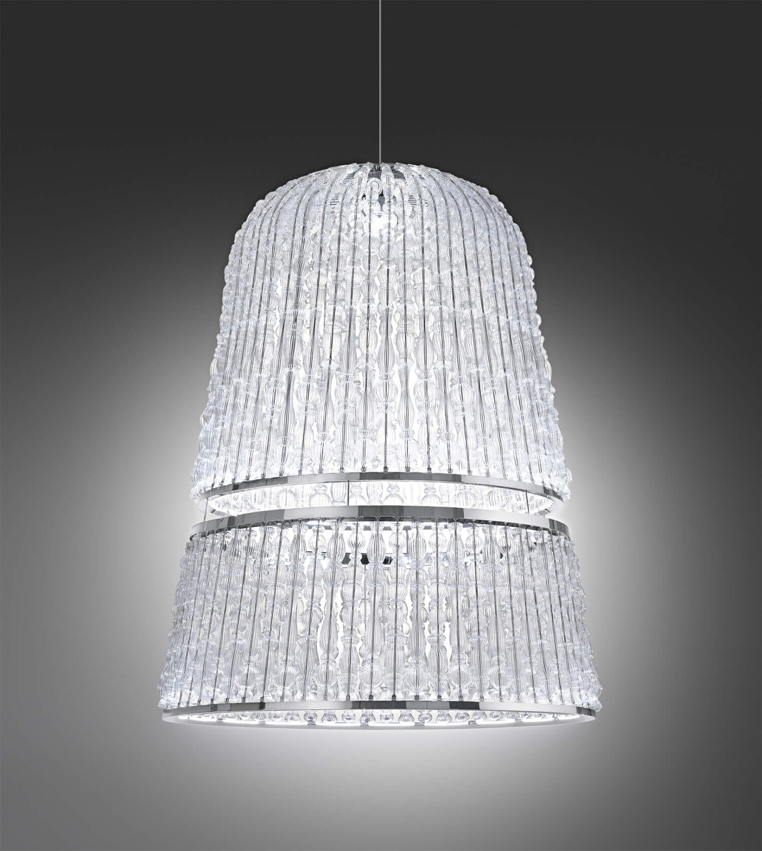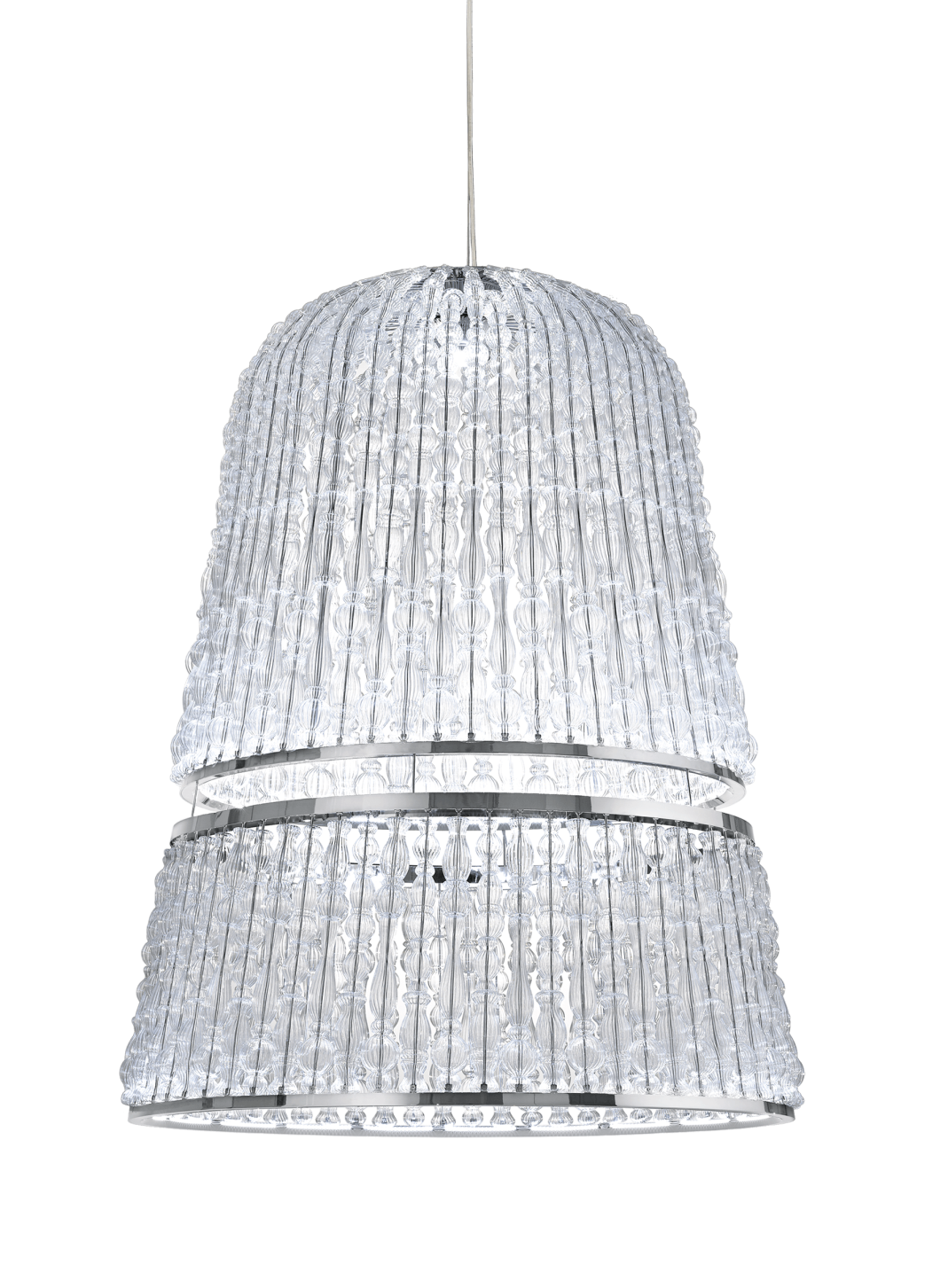 Подвесной светильник с хромированной металлической конструкцией и элементами из прозрачного дутого стекла.