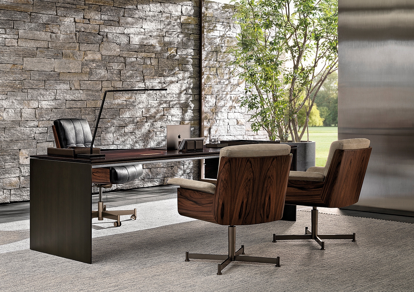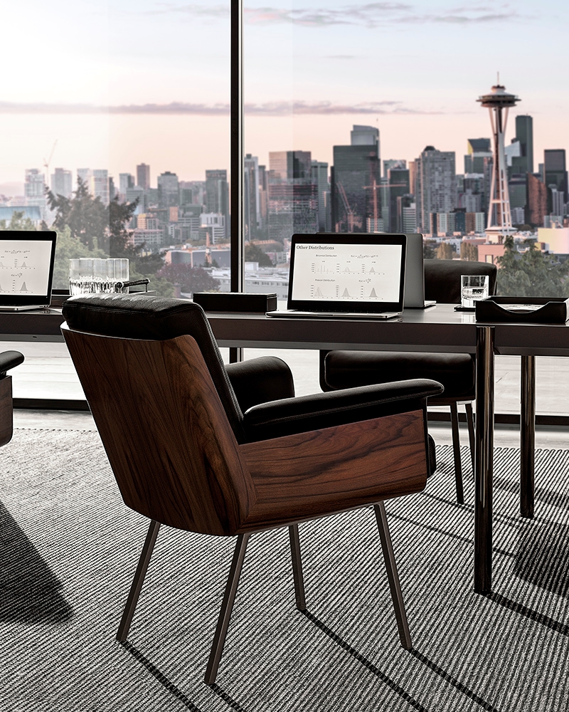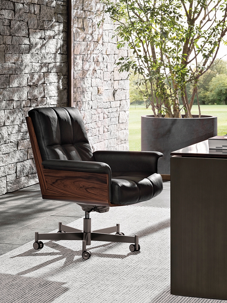 Особенности: эргономичная посадка, поворотная база, благородные материалы, строгий, но тёплый визуальный образ.