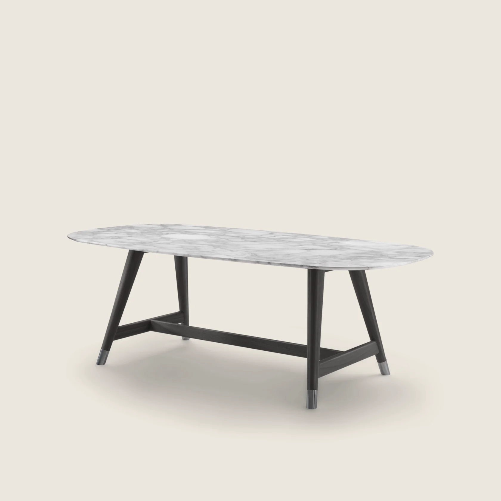 Стол с мягко скруглённой прямоугольной или круглой столешницей. Основание из массива дерева в виде изящно расходящихся ножек, напоминающих классику 60-х годов. Эстетика лаконична, но благородна.