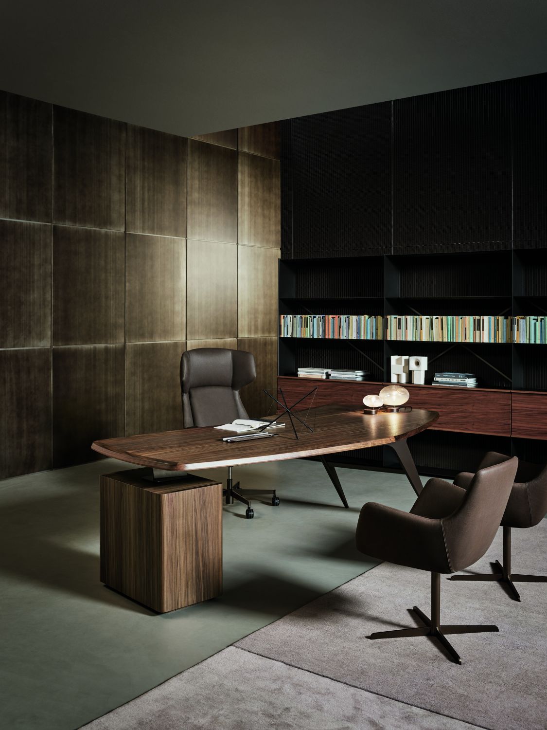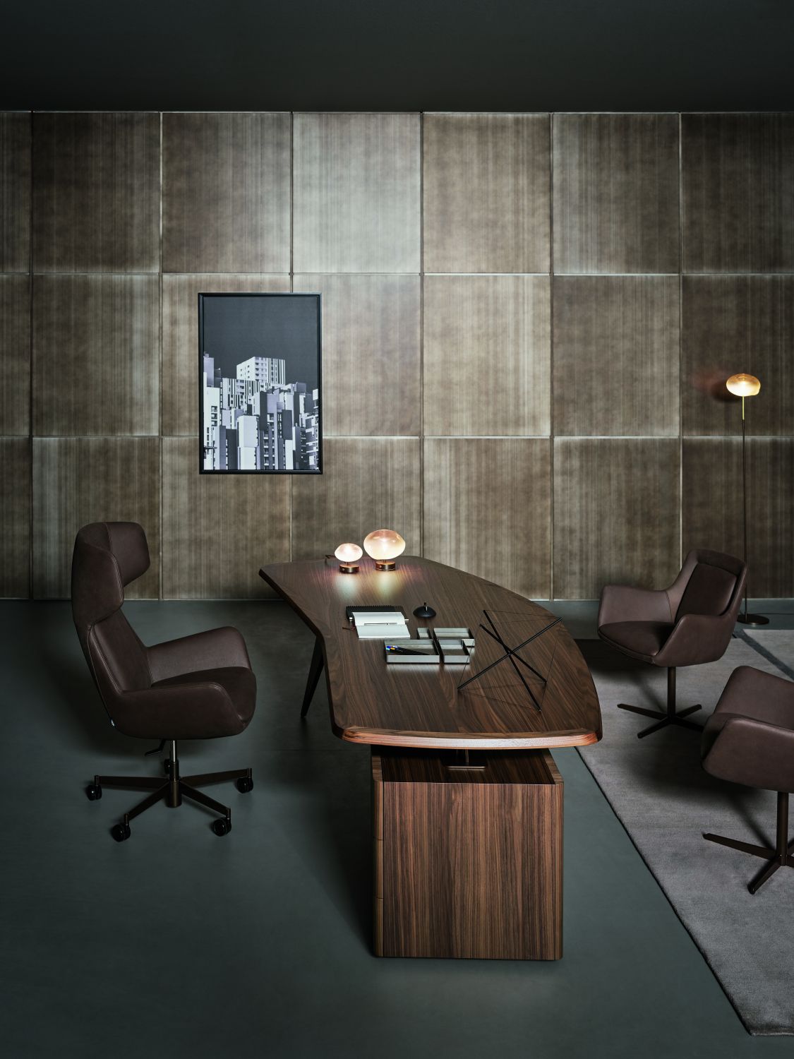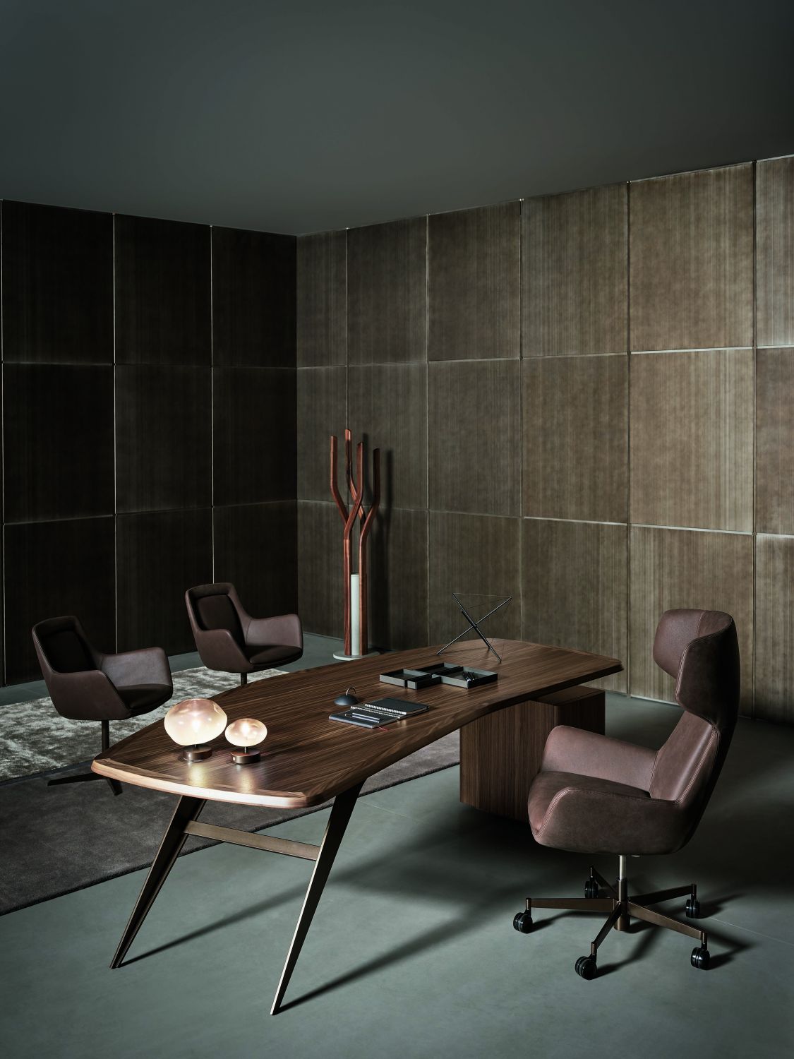 Diver — это представительский стол для руководителя, в котором сочетаются динамика и утончённая архитектурная выразительность. Его образ навеян плавным, контролируемым движением водолаза, что отражается в сбалансированной конструкции, отсылающей к эстетике конструктивизма.