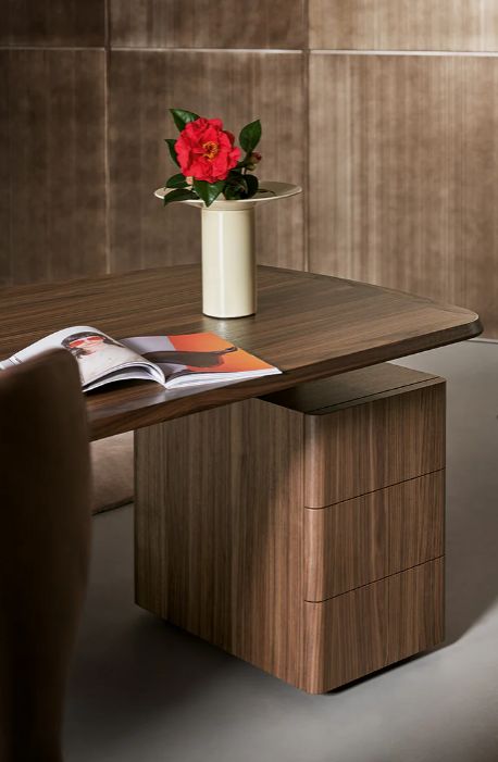 Чёткая геометрия, плавные линии и контраст наполненных и пустых форм создают визуальный ритм, где строгость встречается с мягкостью. Столешница с деликатно изогнутым периметром обеспечивает комфорт и расширяет рабочее пространство. Компактная, скруглённая тумба выступает устойчивой опорой всей композиции.