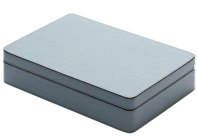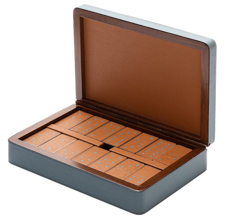 Классическая настольная игра «Домино» представлена в роскошном исполнении. Костяшки изготовлены из орехового дерева с кожаными вставками и размещены в эффектном футляре из ореха, покрытом кожей.