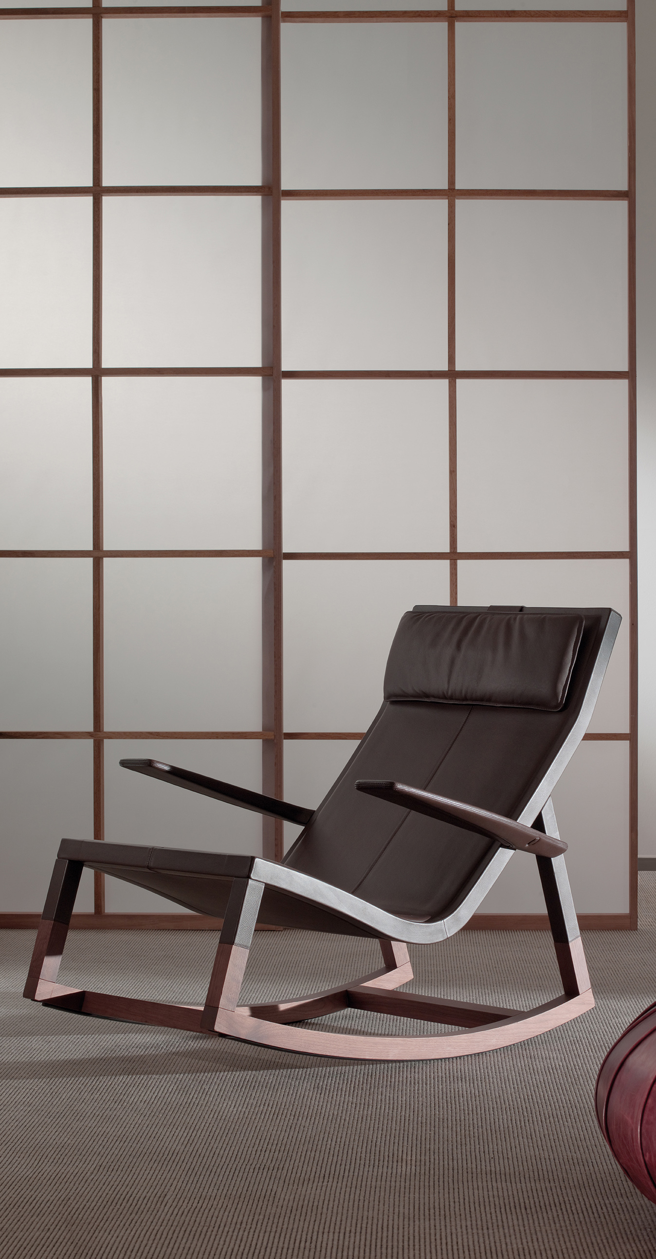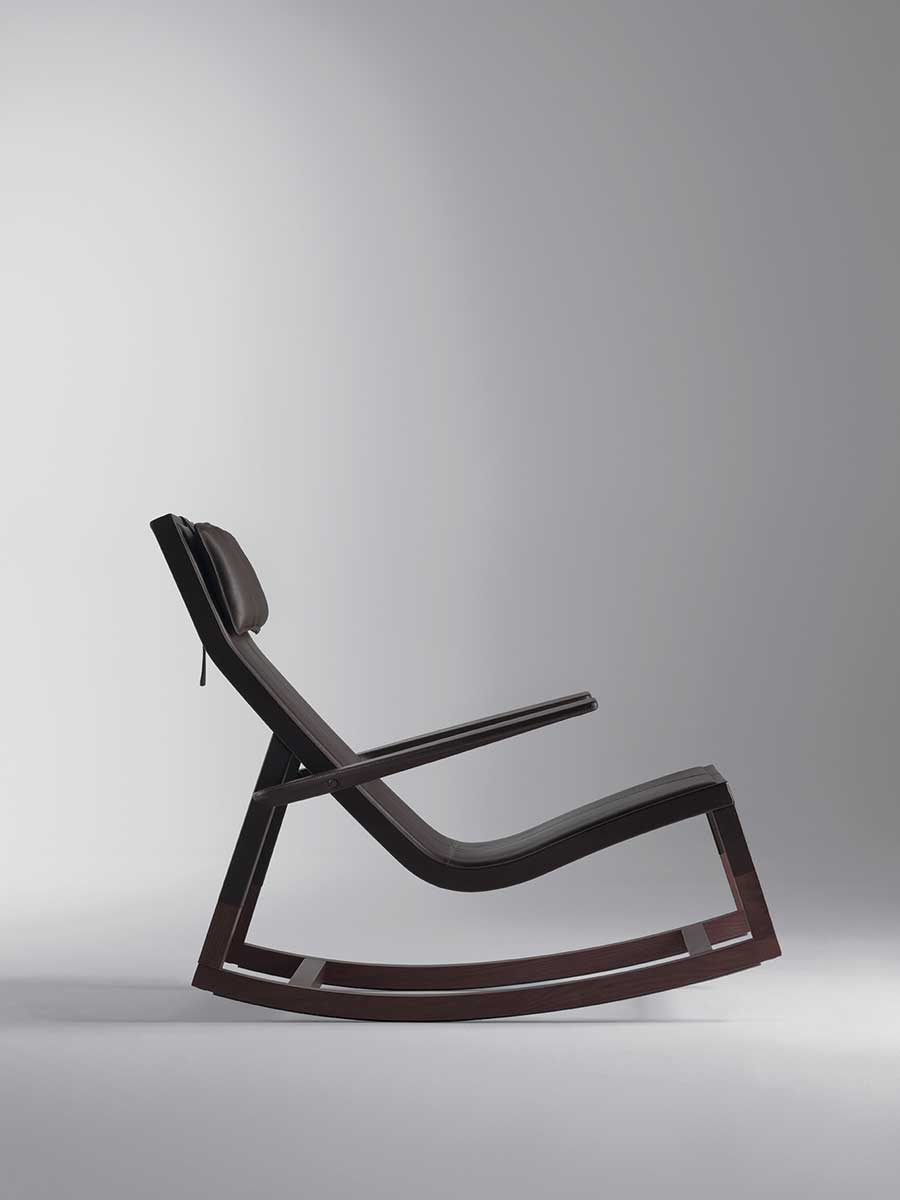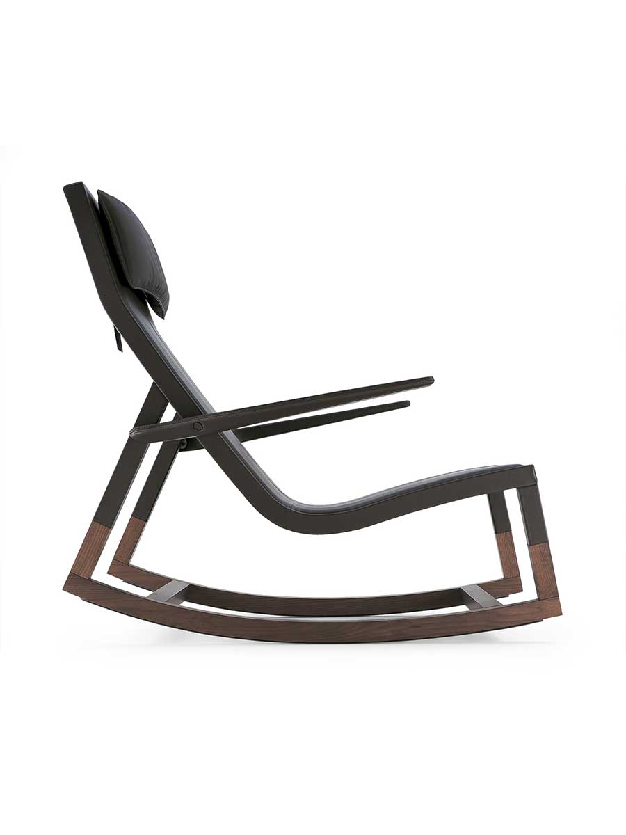 Корпус и подлокотники кресла-качалки Don’do изготовлены из формованного жёсткого полиуретана и усилены металлической вставкой. Ножки изготовлены из массива дуба, обработанного паром, с отделкой под состаренный орех. Обивка выполнена из кожи Pelle Frau®. Специальная продольная строчка украшает всю обивку кресла. Высоту подголовника можно регулировать с помощью ремня с перфорацией, расположенного на спинке кресла.