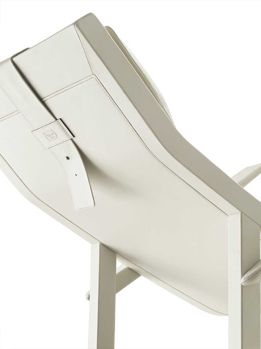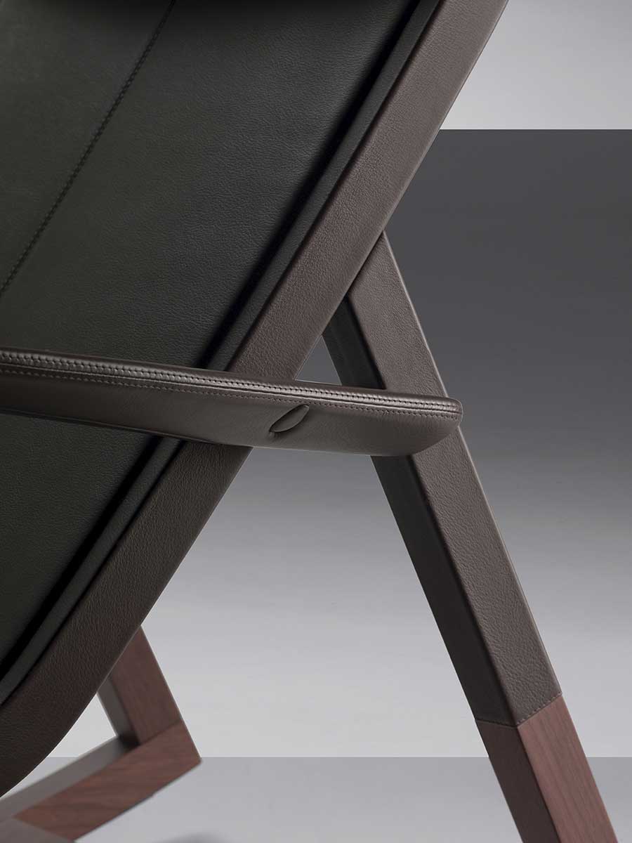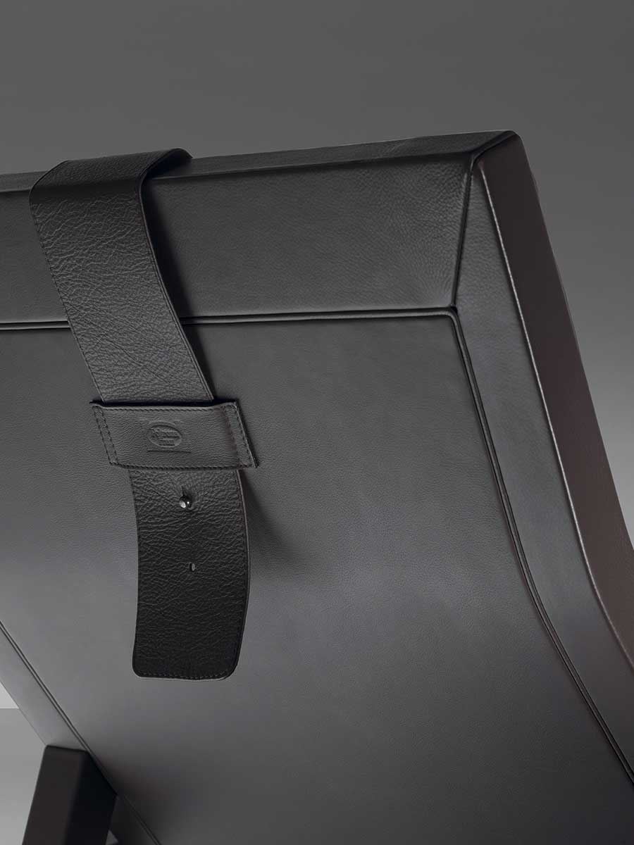 Корпус и подлокотники кресла-качалки Don’do изготовлены из формованного жёсткого полиуретана и усилены металлической вставкой. Ножки изготовлены из массива дуба, обработанного паром, с отделкой под состаренный орех. Обивка выполнена из кожи Pelle Frau®. Специальная продольная строчка украшает всю обивку кресла. Высоту подголовника можно регулировать с помощью ремня с перфорацией, расположенного на спинке кресла.