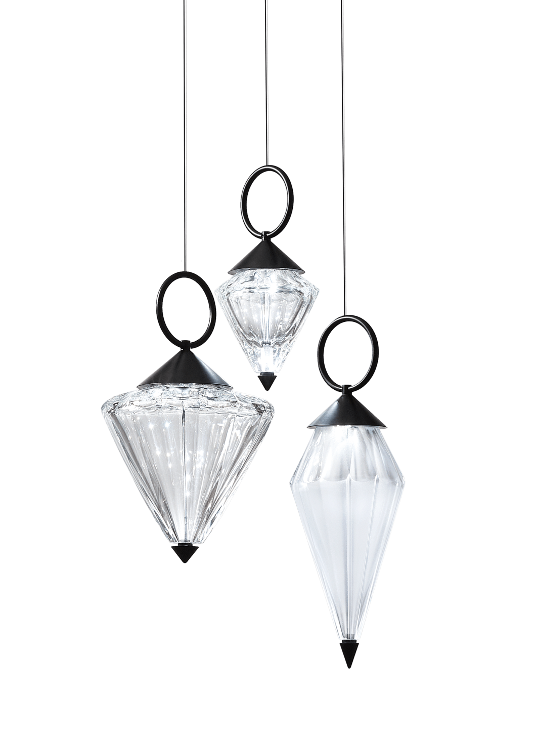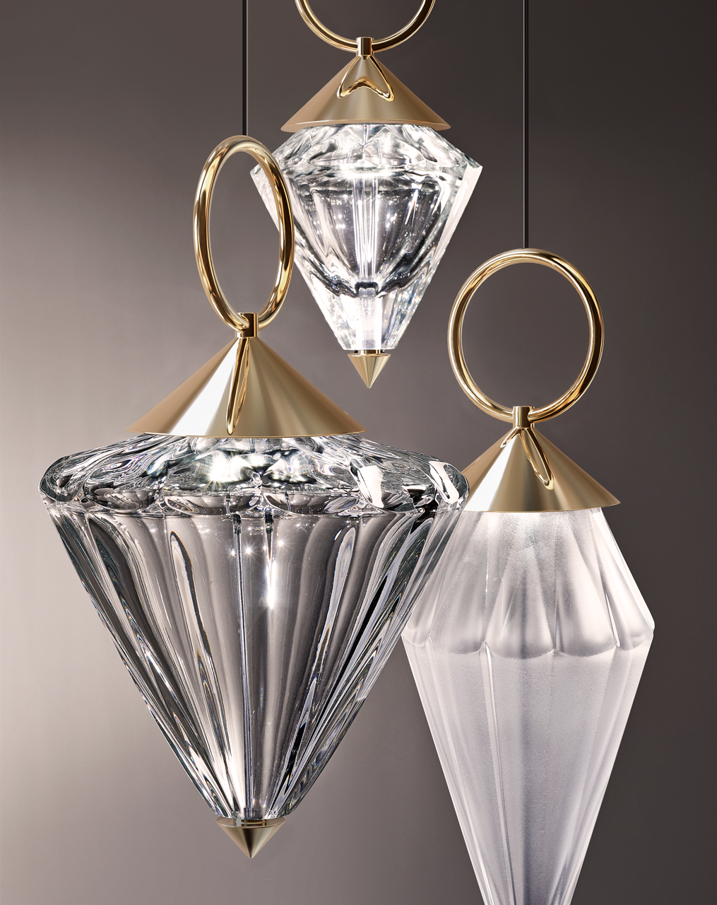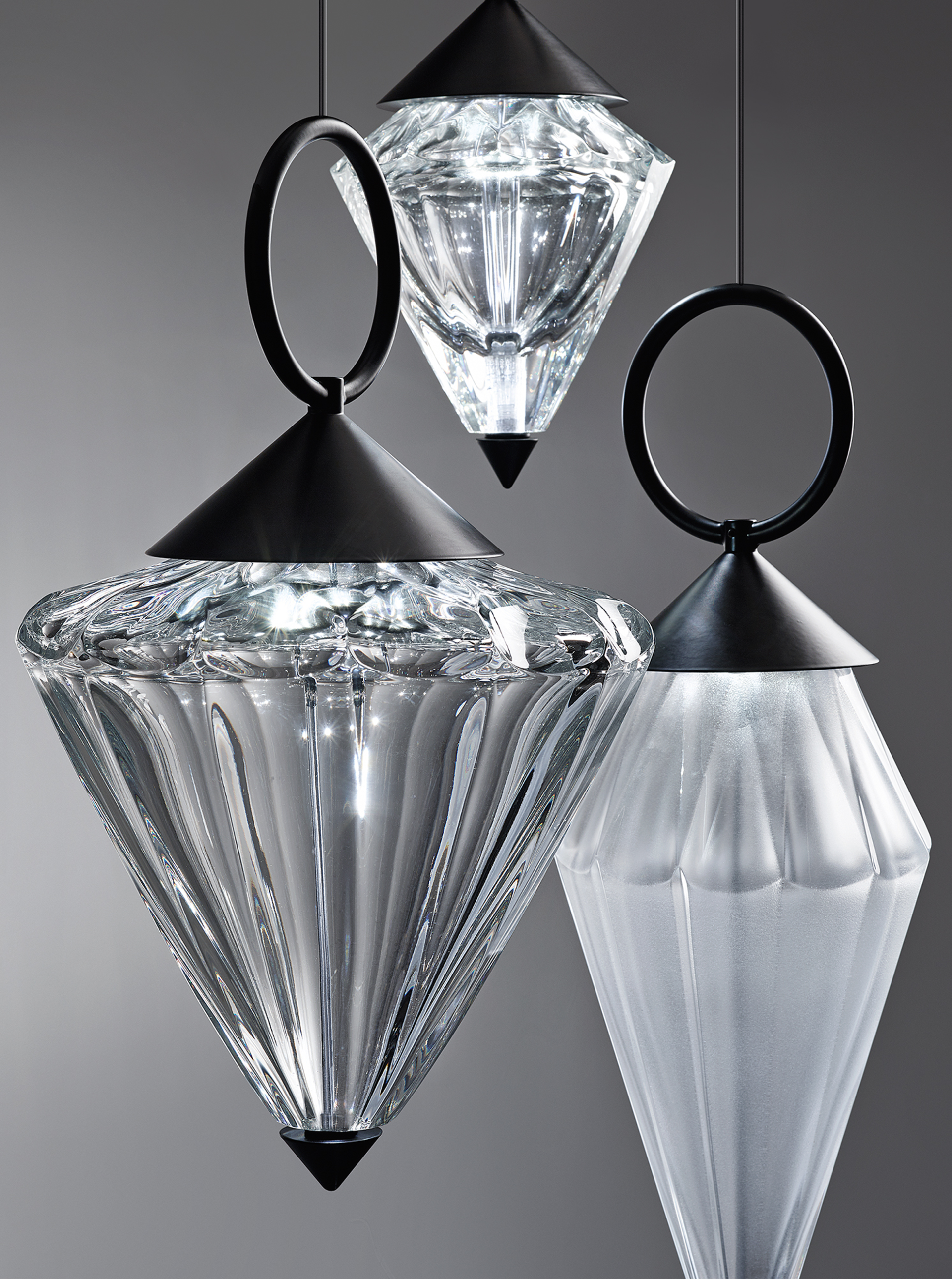Подвесной светильник с рассеивателем из прозрачного или травленого дутого хрусталя. Металлический каркас с матово-черной, стально-серой или светло-золотой отделкой.