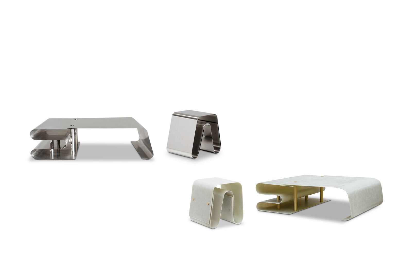 Модель доступна в двух вариантах: из нержавеющей стали или из натурального стеклопластика. Детали отделки могут быть выполнены из матовой латуни или хромированного металла, что позволяет подобрать столик под нужный стиль интерьера.