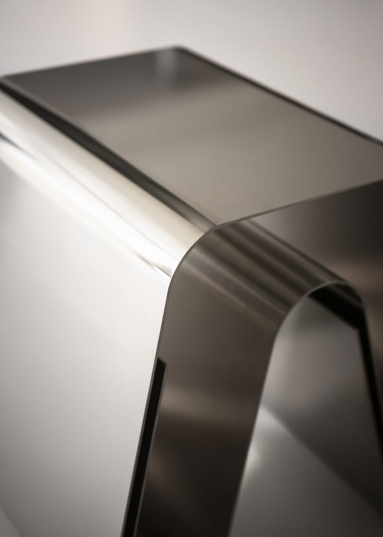 Dune — дизайнерский столик от Draga & Aurel для Baxter, сочетающий в себе скульптурную выразительность и функциональность. Его обтекаемая форма создана из изогнутого листа нержавеющей стали, который снаружи зеркально блестит, а изнутри имеет матовую текстуру. Такой контраст придаёт изделию архитектурную глубину и визуальную лёгкость.