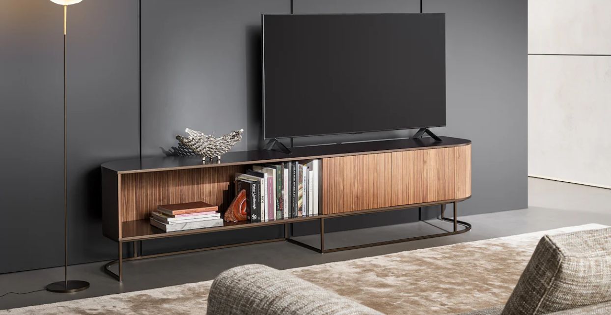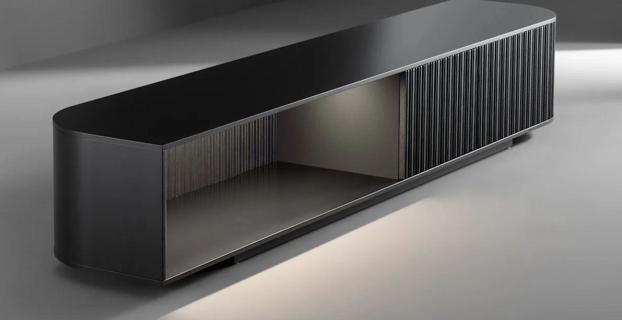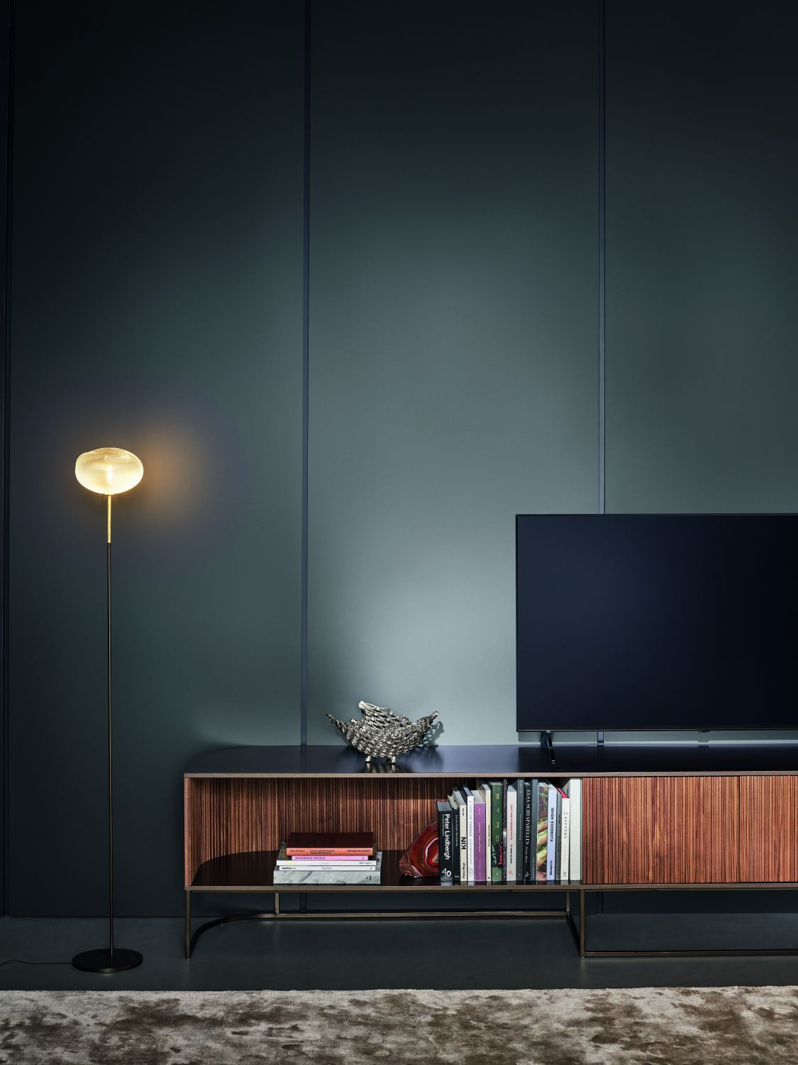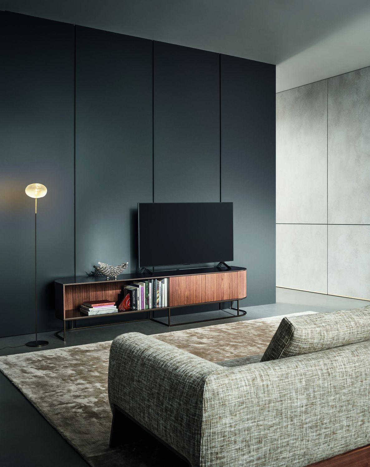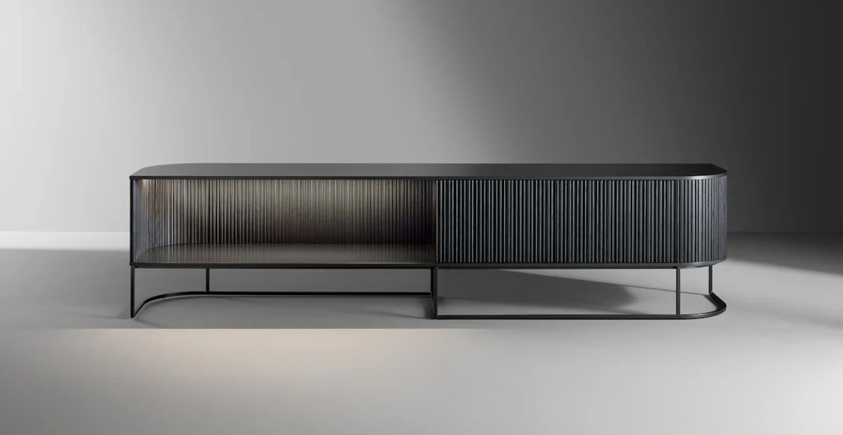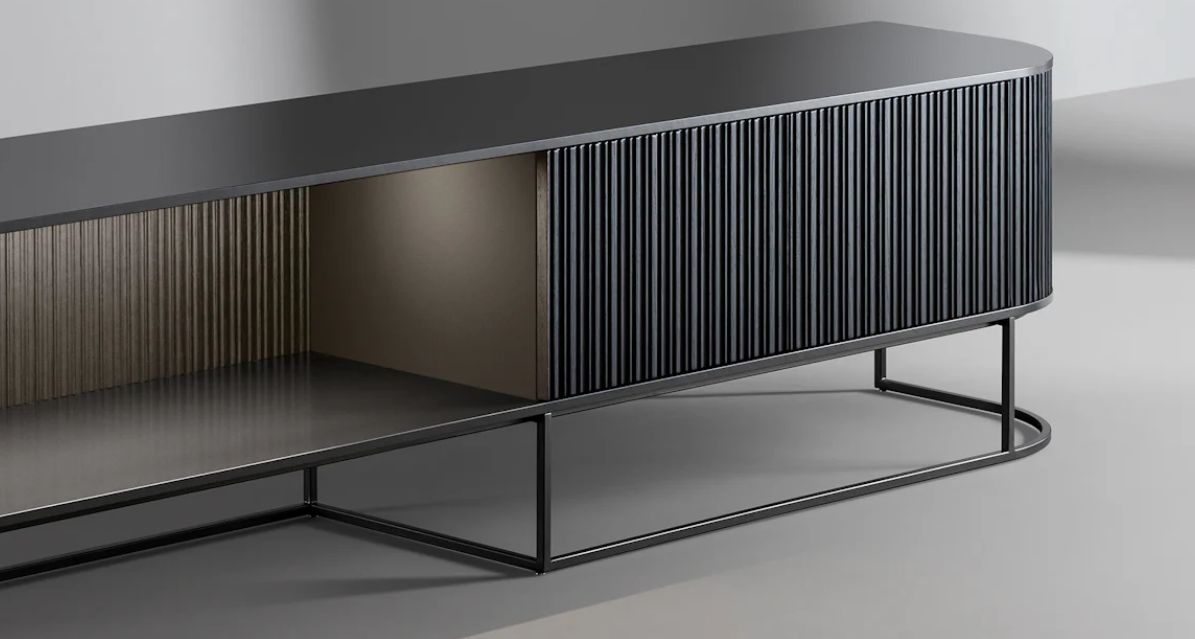 Тумба под телевизор Dune, как и сервант из одноимённой коллекции, выделяется волнообразной деревянной поверхностью, создающей выразительный светотеневой эффект. Конструкция сочетает открытую секцию для книг и декора с закрытым хранилищем. Модель доступна в двух фиксированных цветовых решениях — noce Canaletto / bronzo и rovere carbone / piombo — и может быть выполнена на металлическом основании или цоколе. В верхней части предусмотрена встроенная подсветка для дополнительного акцента.