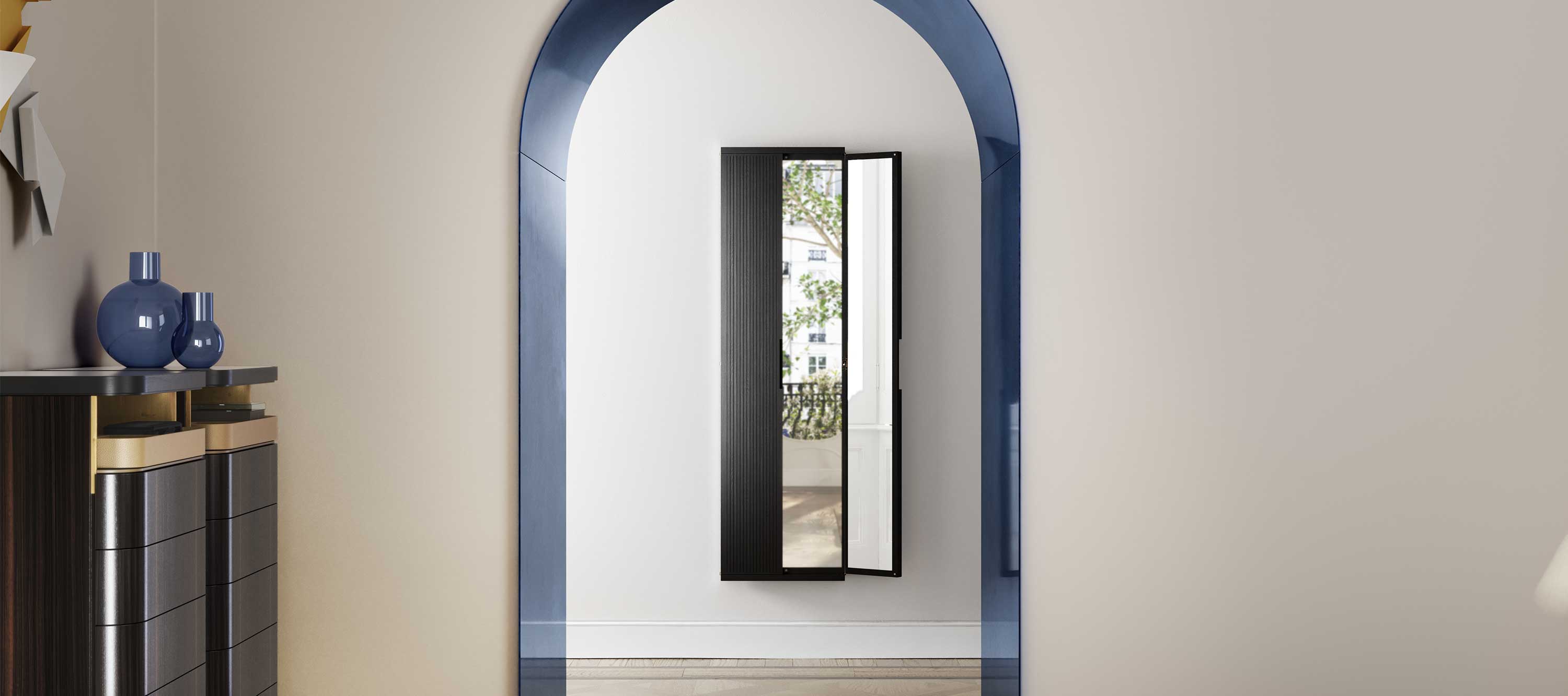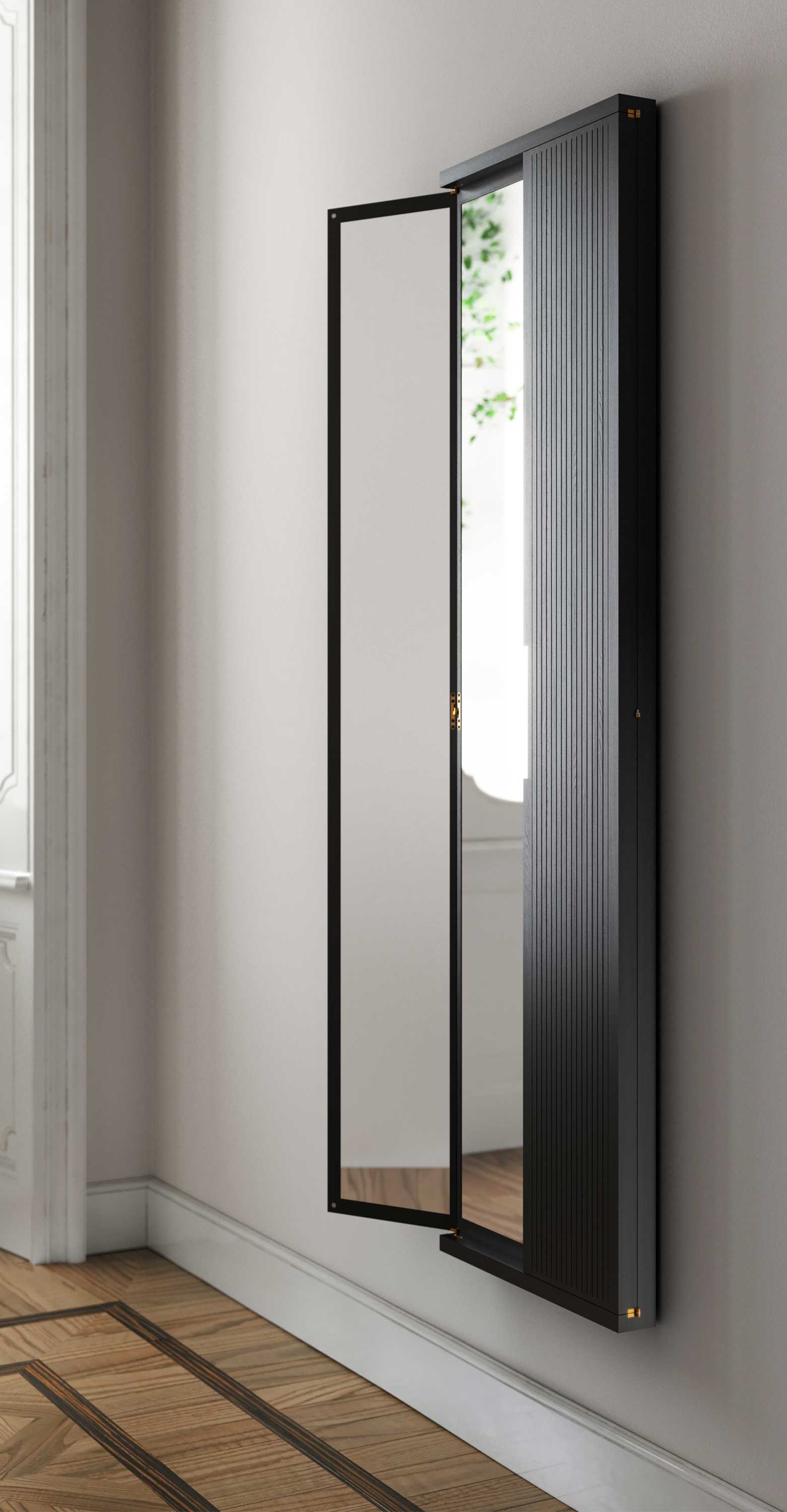 Настенное зеркало DUO — это высокофункциональное и в то же время поэтичное изделие, воссоздающее изысканную атмосферу ателье высокого класса. Зеркальные панели, заключенные в раму из массива ясеня, обеспечивают комфортный обзор с разных ракурсов в открытом положении. Когда зеркало не используется, обе боковые панели можно закрыть, а благодаря ребристому внешнему виду из ясеня зеркало напоминает закрытую дверь. Трёхсекционное настенное зеркало DUO крепится к стене с помощью байонетного крепления.
