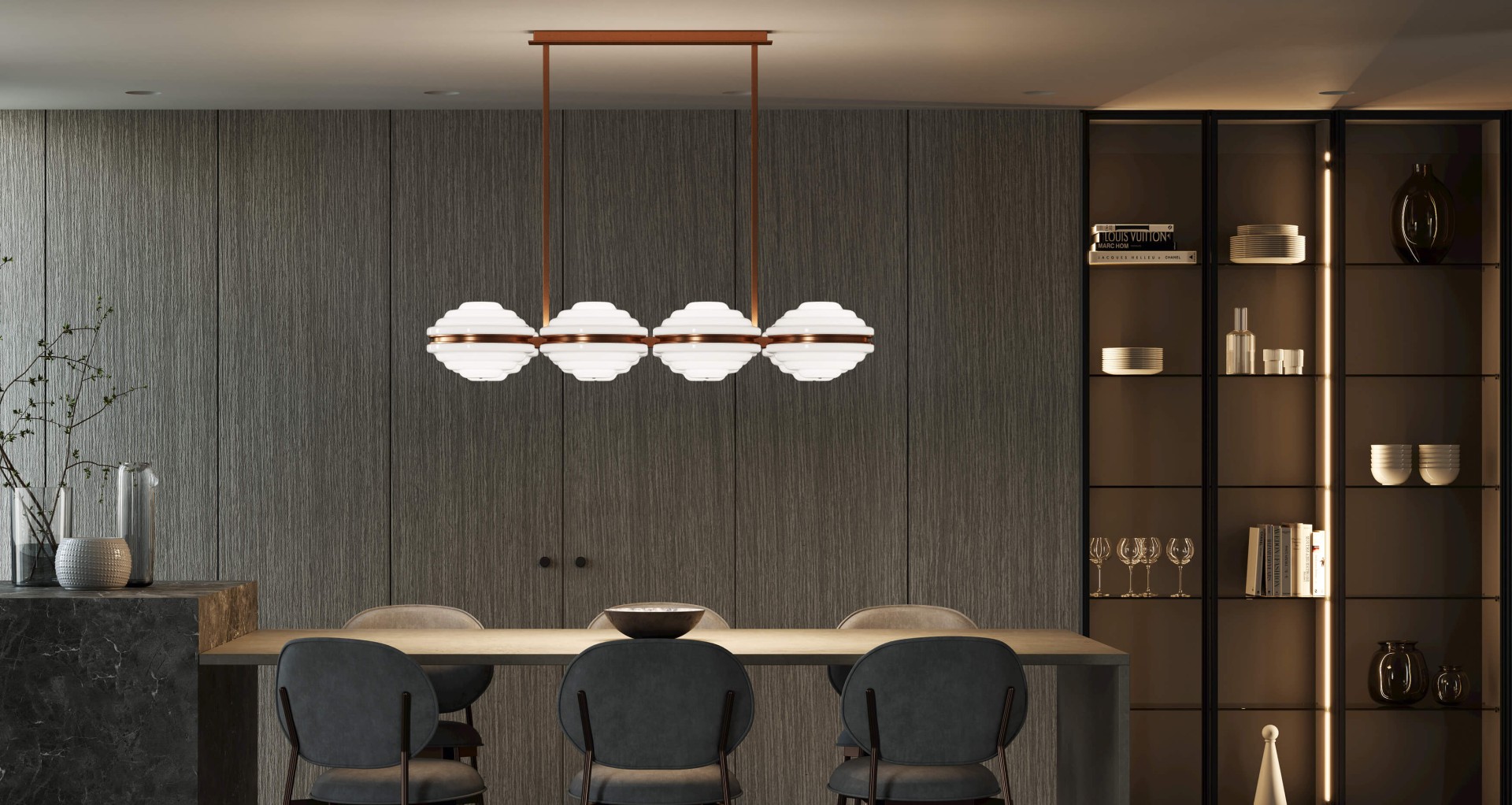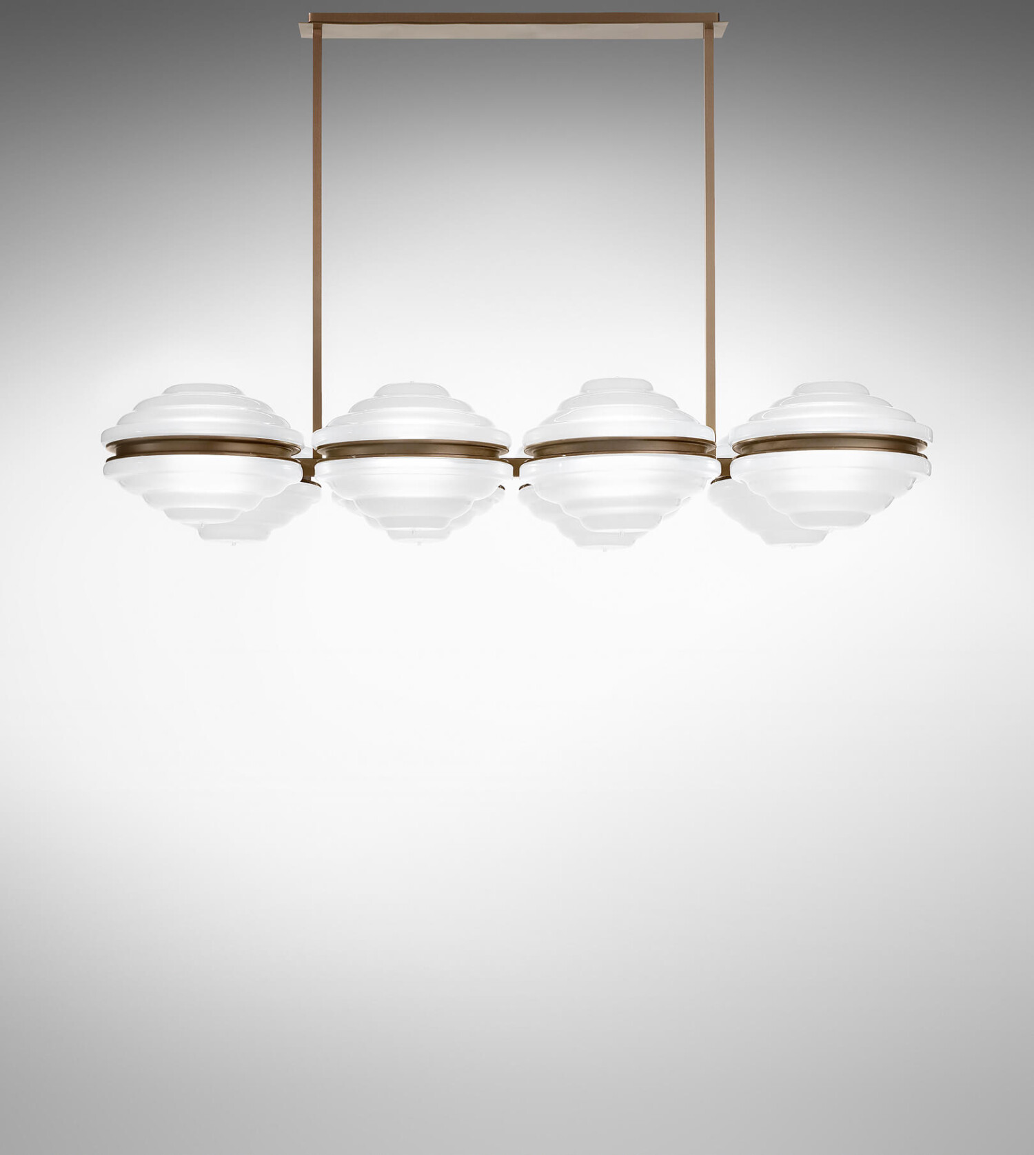 Подвесной светильник из металла с бронзовой отделкой и рассеивателями из сатинированного стекла.