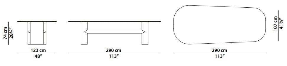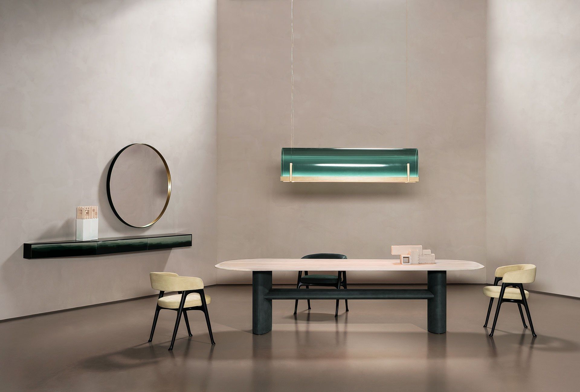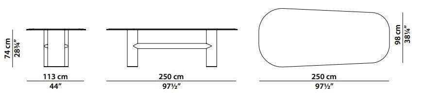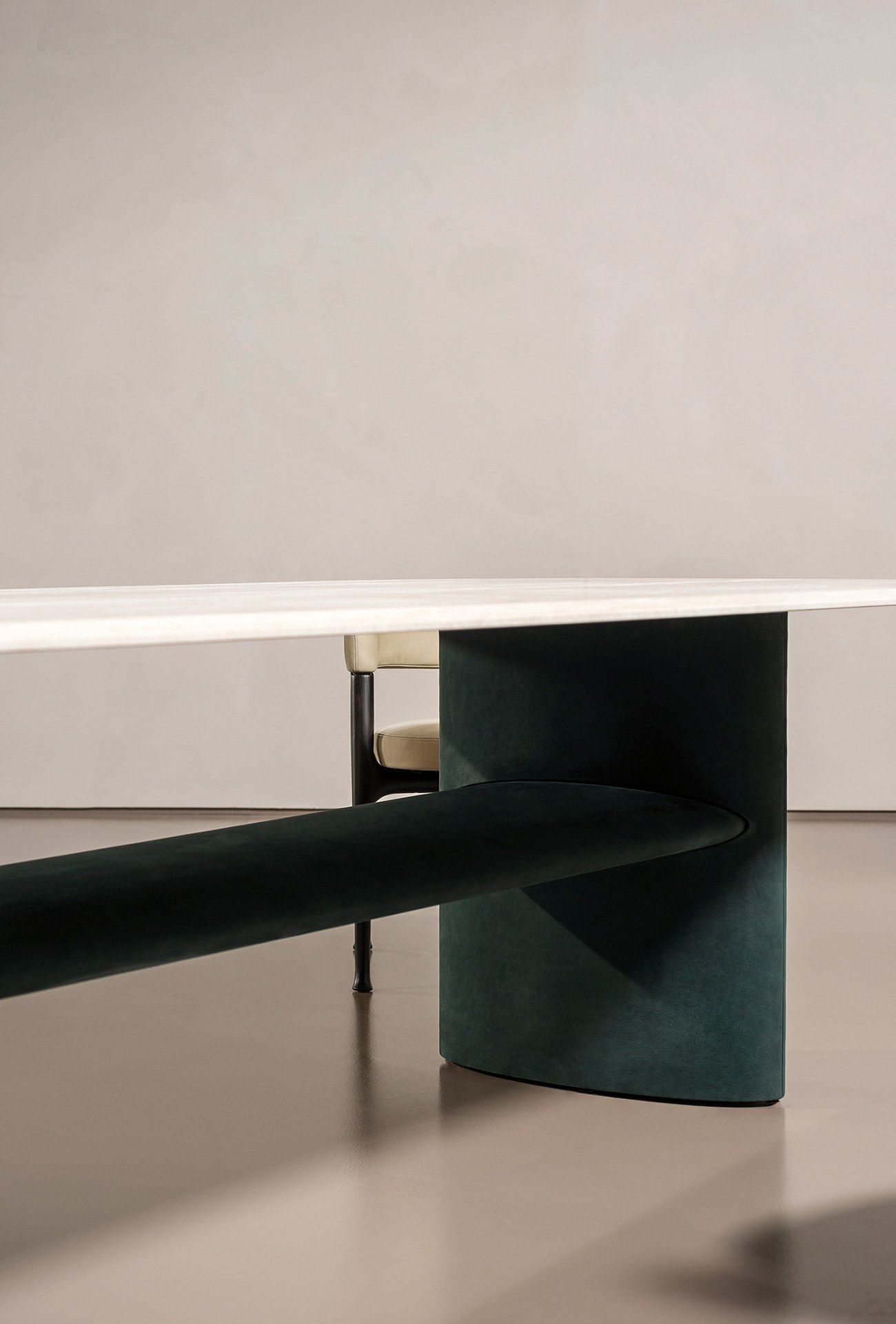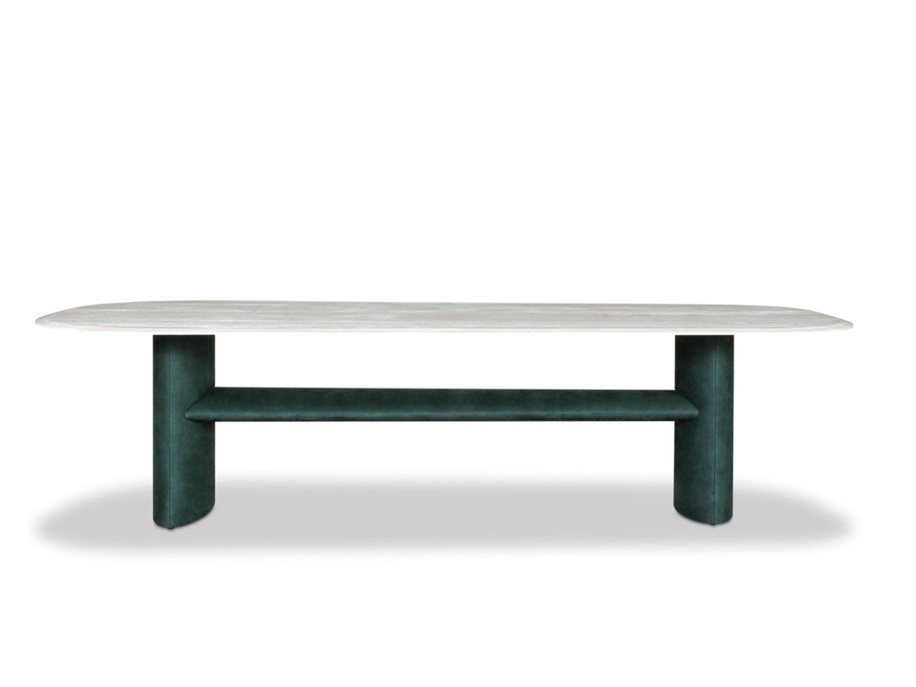 Стол с основанием из МДФ, полностью обтянутый кожей. Столешница — камень толщиной 20 мм с водоотталкивающей пропиткой, установлен на алюминиевую сотовую подложку.