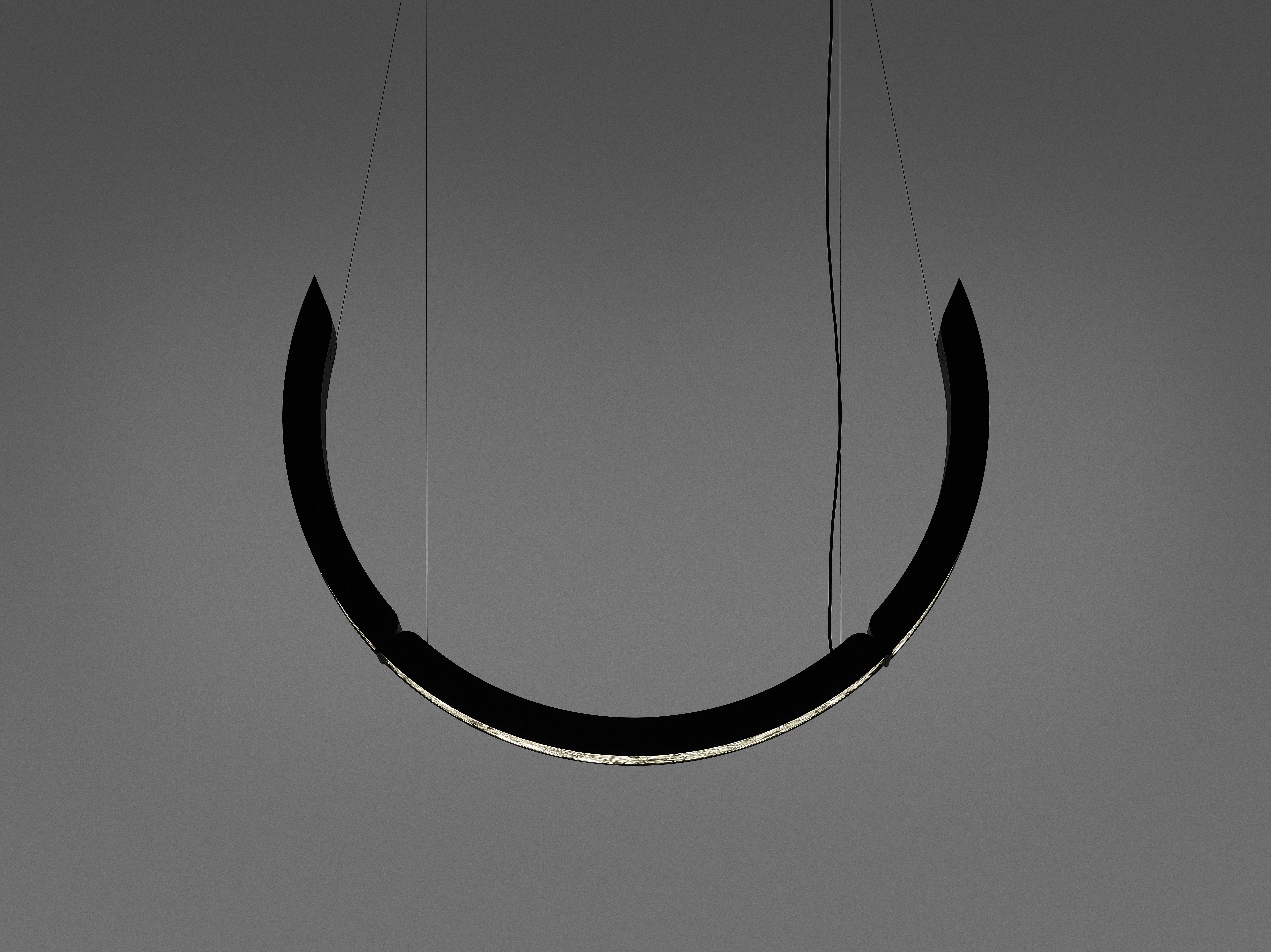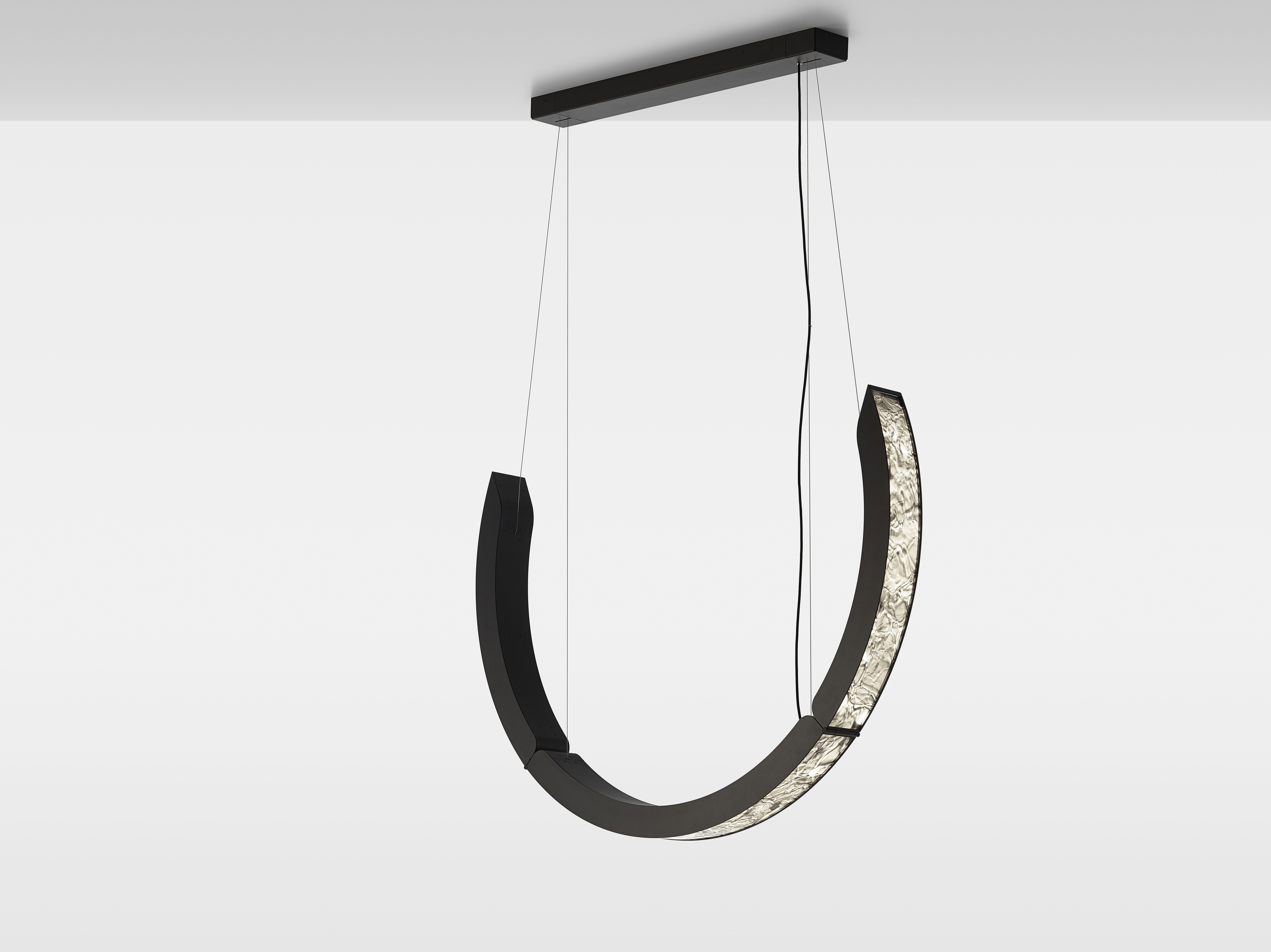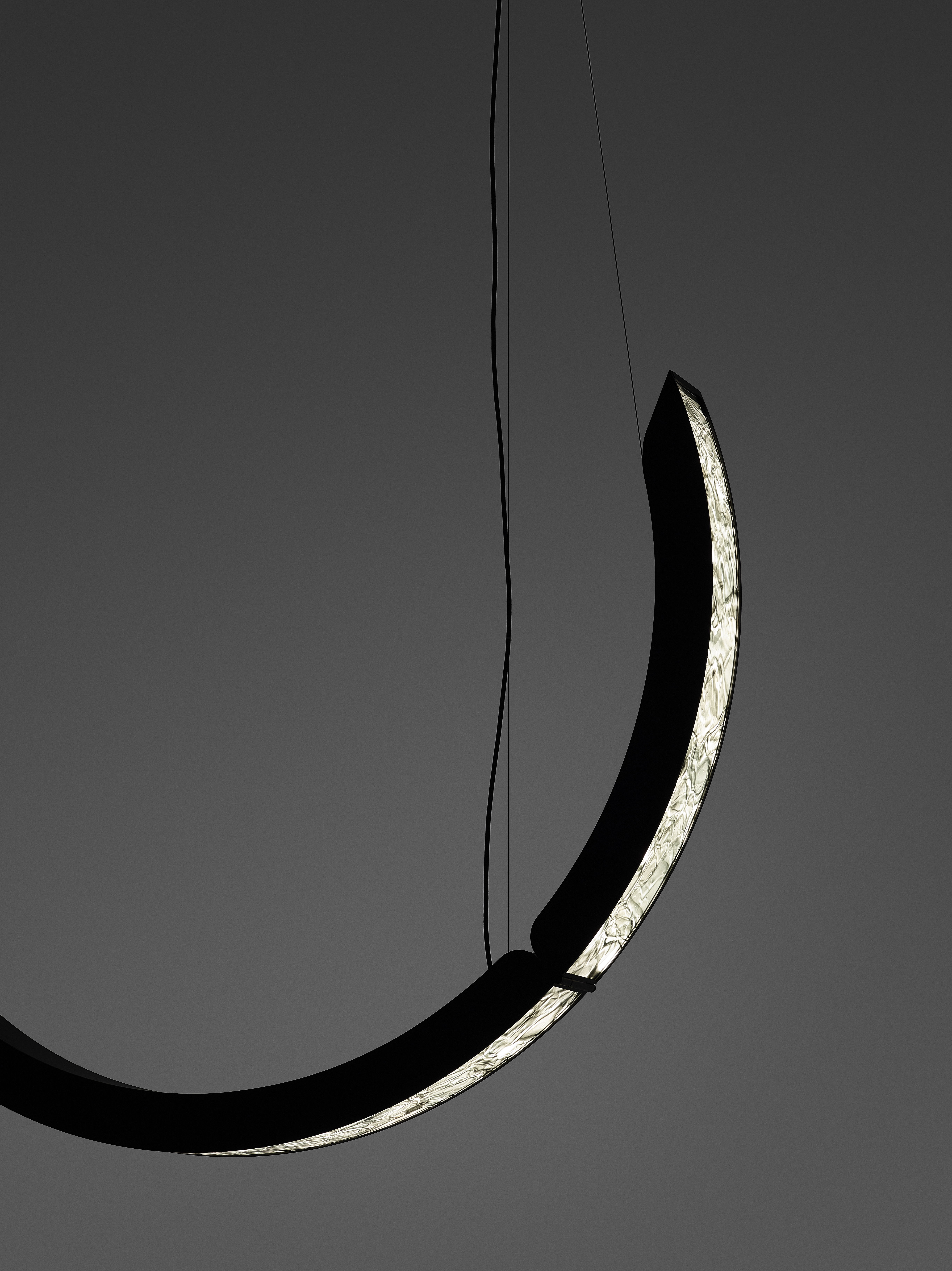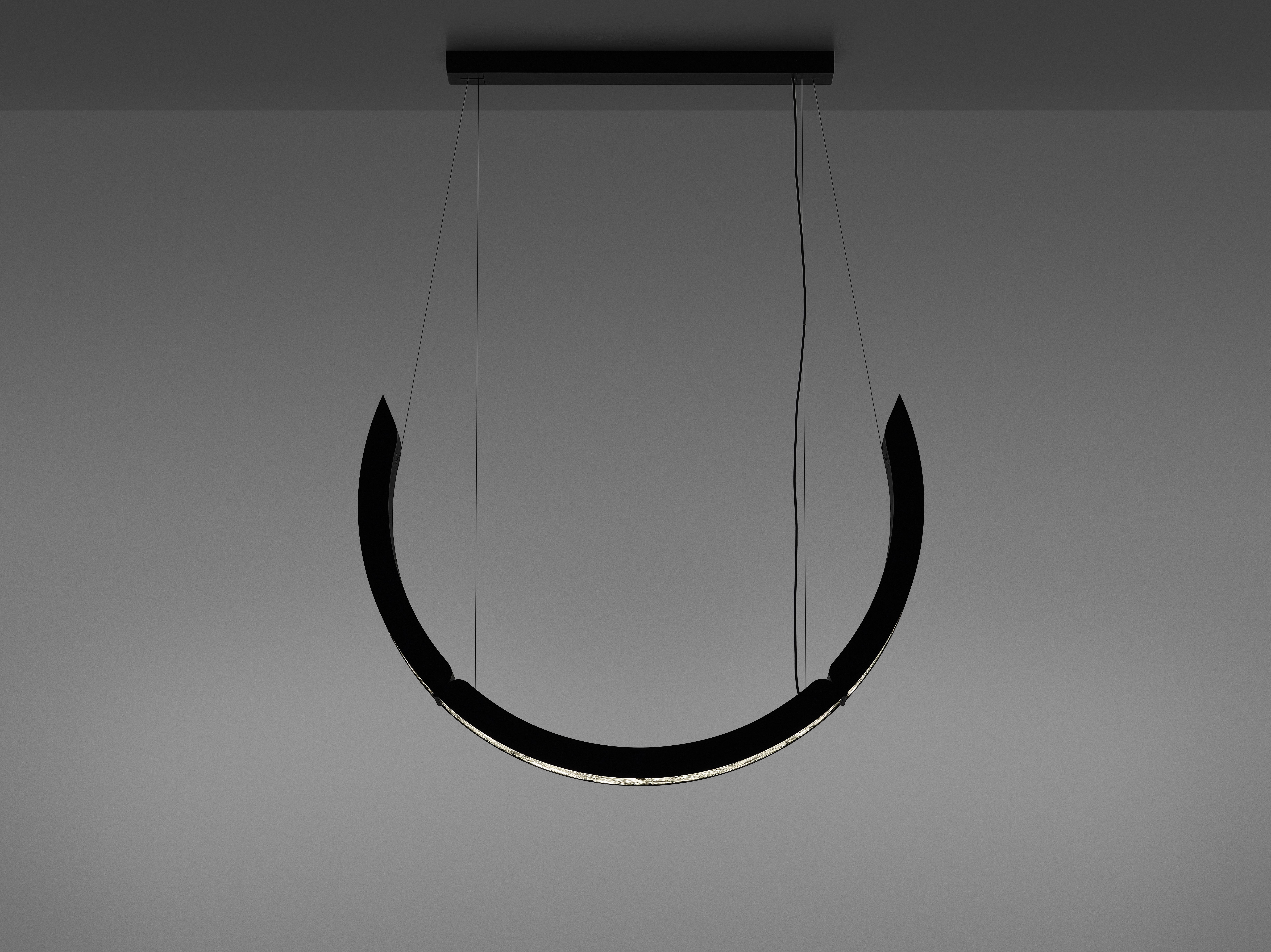 Коллекция Elo — инновационный подвесной светильник, в котором выразительная фактура BROKISGLASS сочетается с изящной алюминиевой конструкцией. Композиция построена на трёх подвижных дугах, две из которых можно фиксировать в различных положениях, формируя разнообразные сценографические решения и задавая пространству яркий архитектурный ритм.