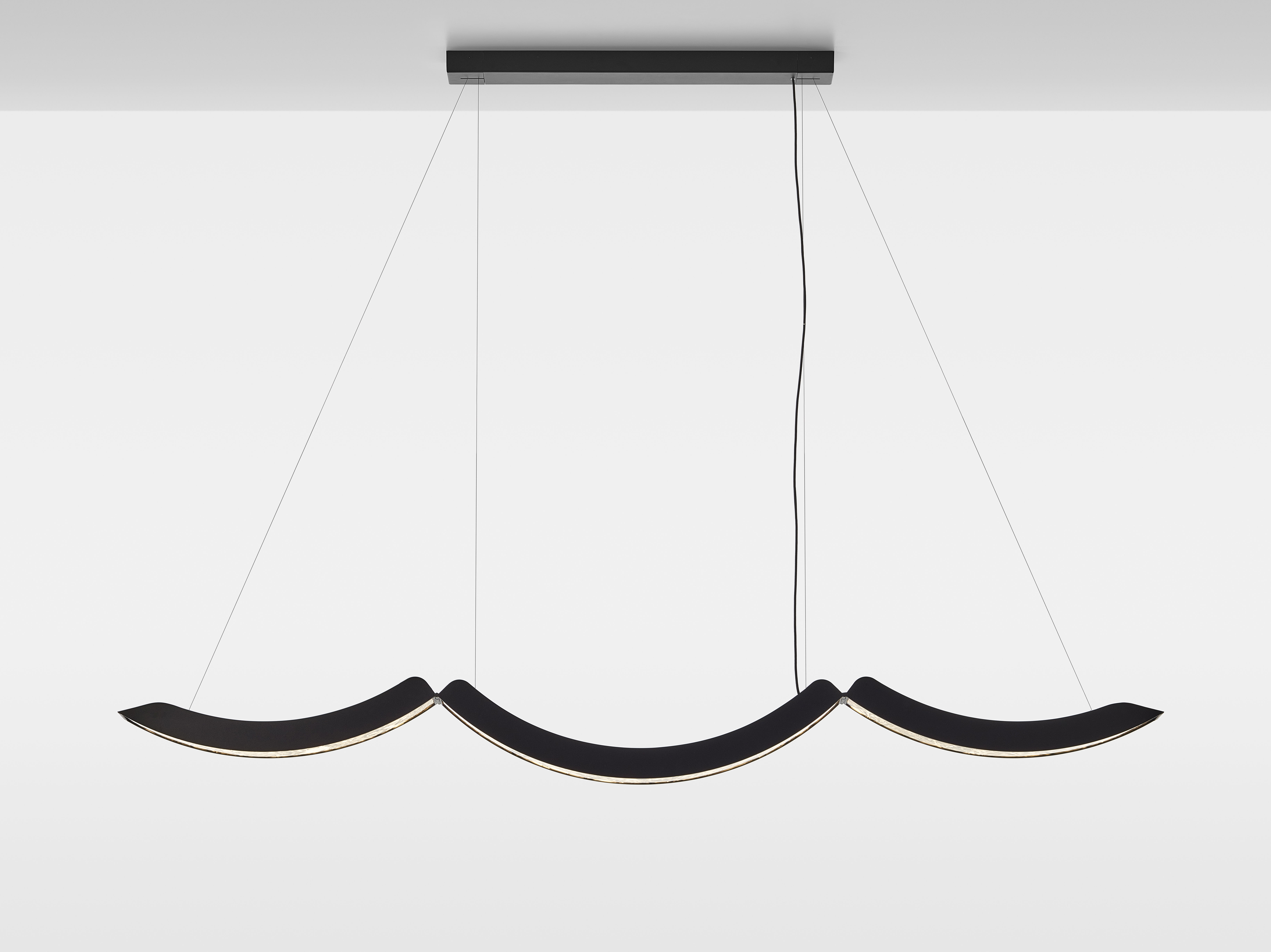 Источник света — гибкие светодиодные линии, повторяющие изгибы дуг. Такое решение подчёркивает пластичность стекла и создаёт мягкое, равномерно рассеянное освещение вне зависимости от выбранной конфигурации.