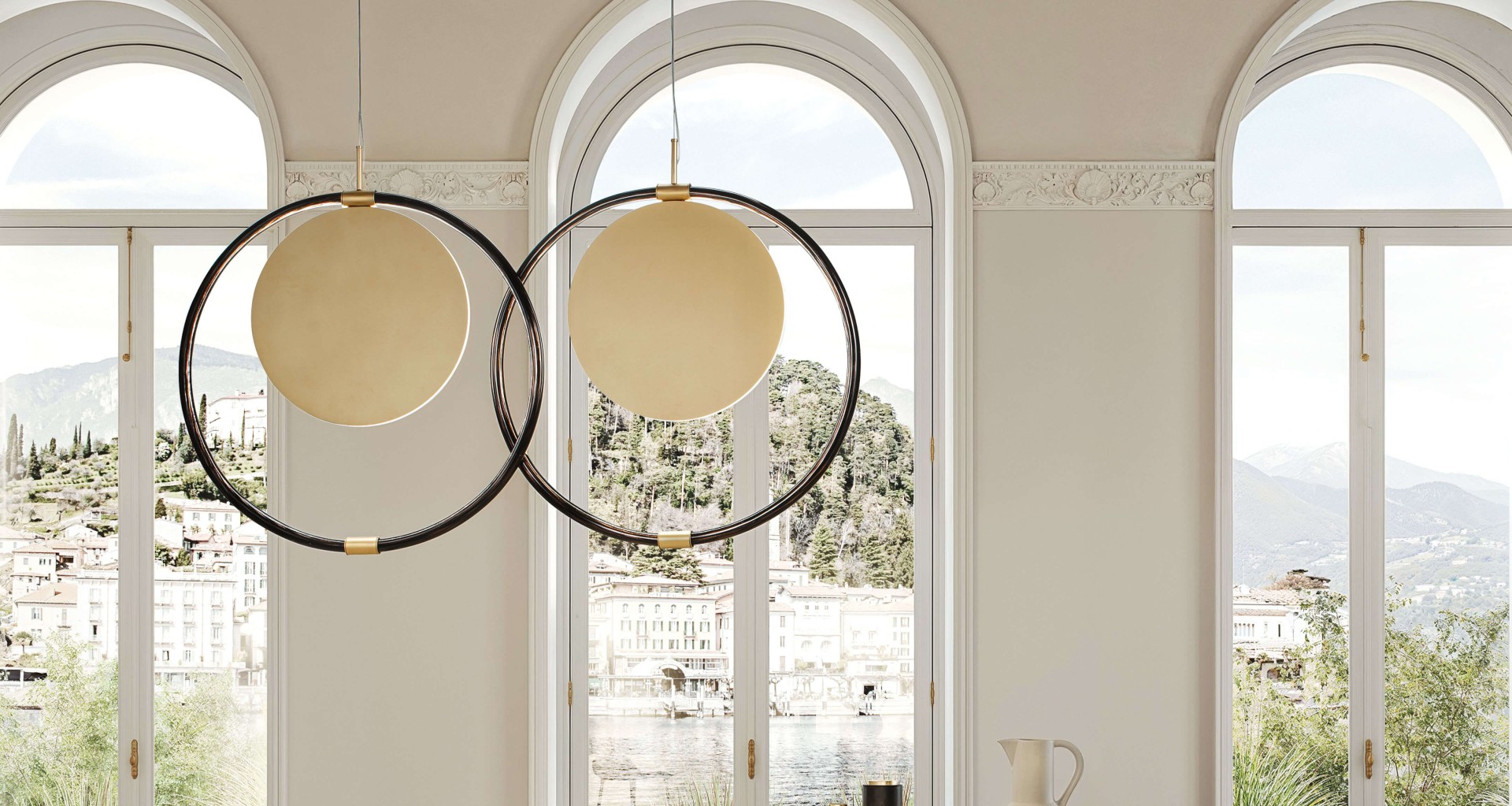 Подвесной светильник, состоящий из трубчатого круга из чёрного художественного стекла с пигментом «авантюрина». Внутренний металлический диск с матовой отделкой цвета шампанского или матовой бронзы.