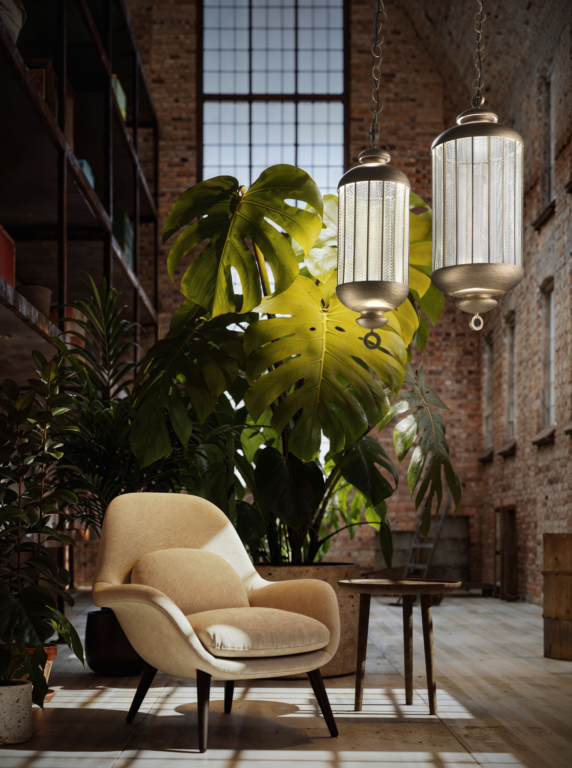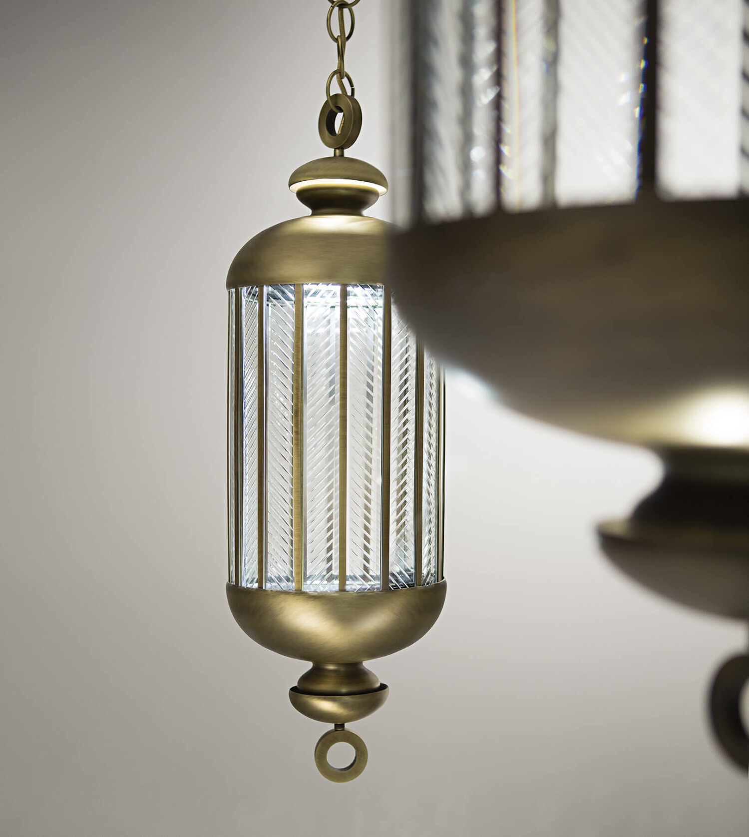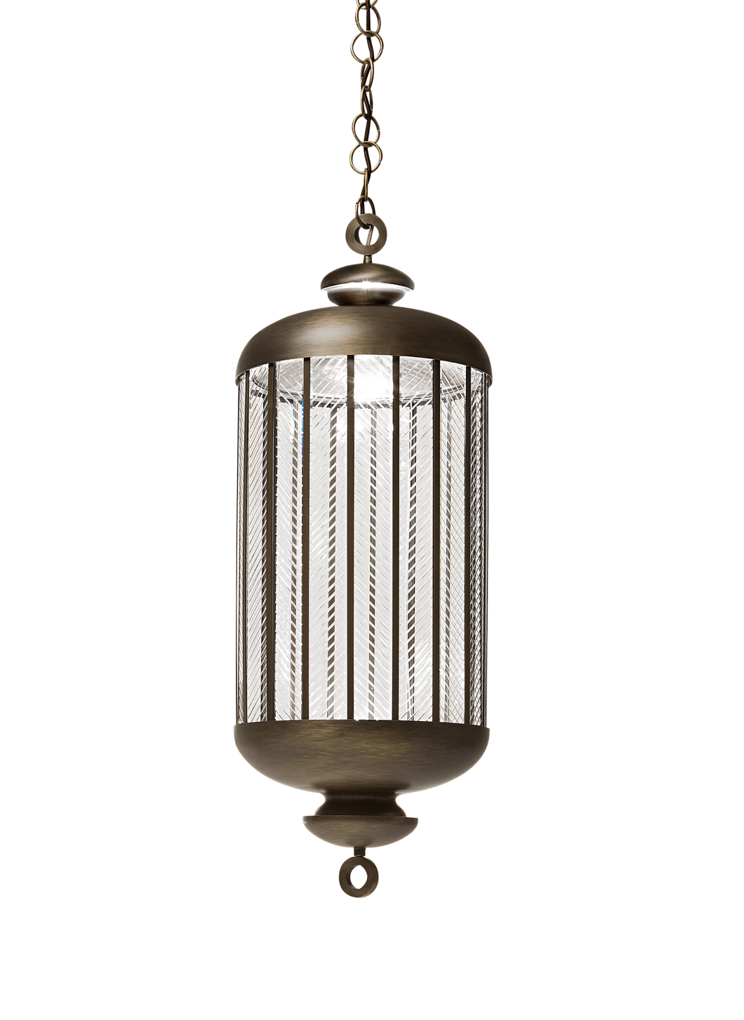 Подвесной светильник из металла с отделкой цвета серого железа, античного воронения или античного золота и резным стеклянным рассеивателем.