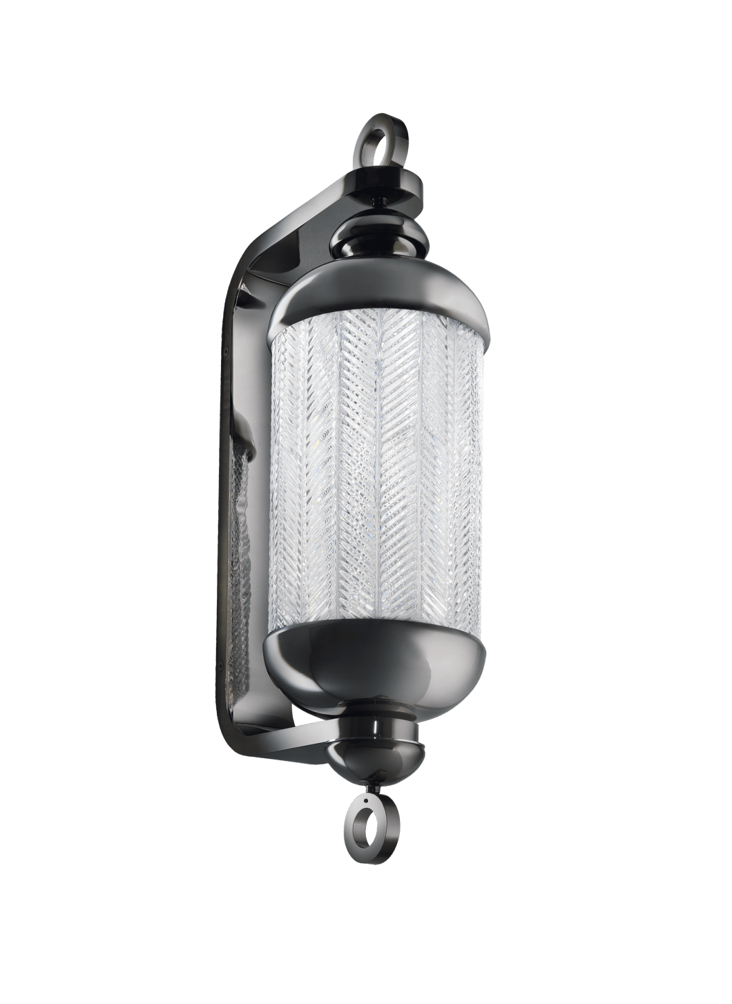 Настенный светильник из металла с отделкой цвета серого железа, античного воронения или античного золота и рассеивателем из резного стекла.