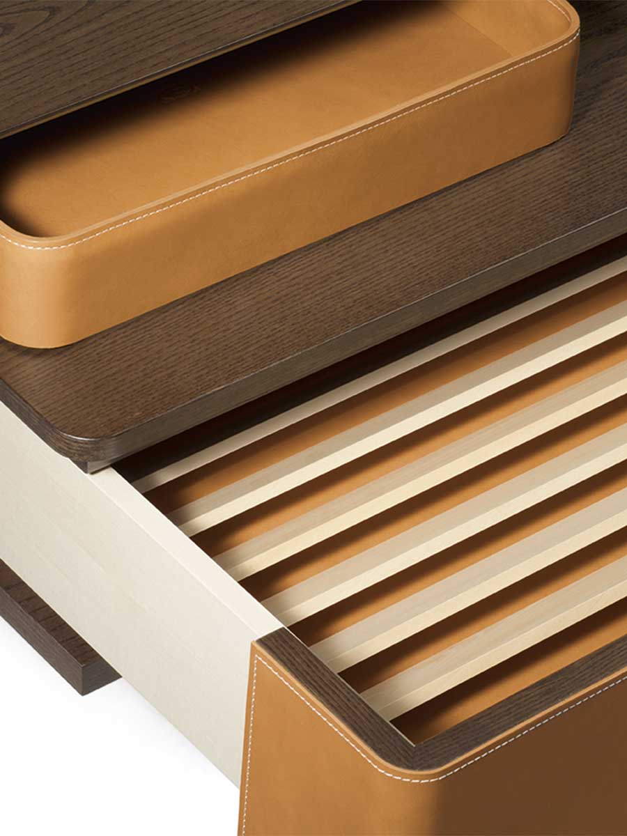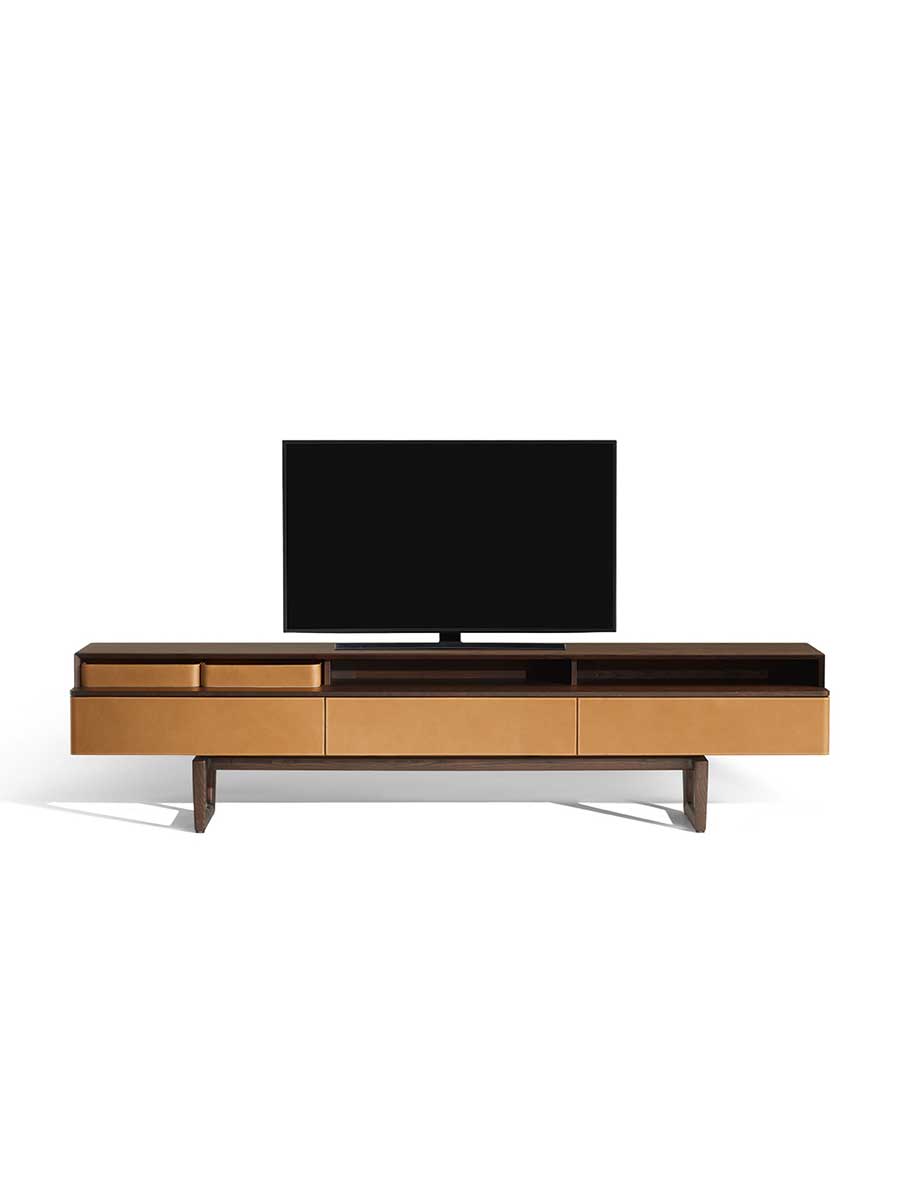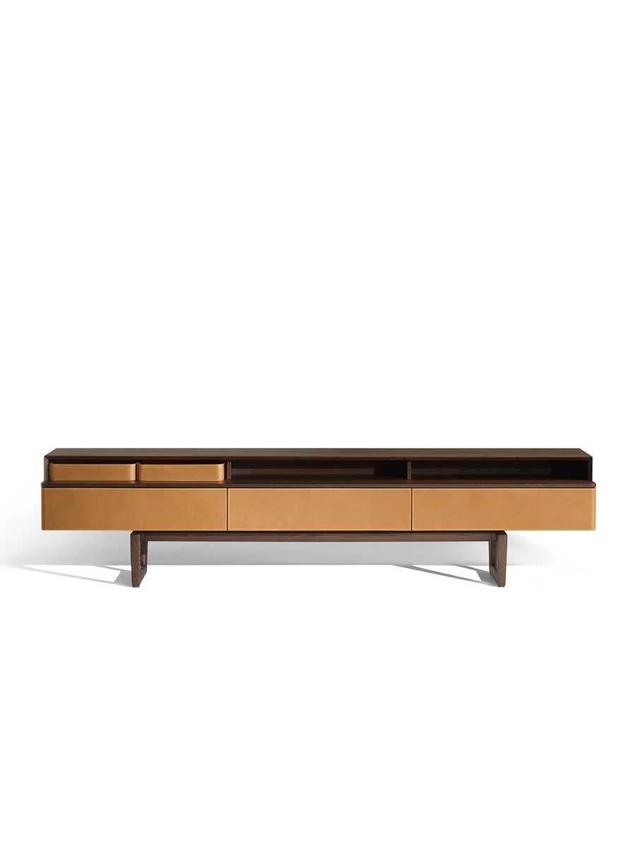 Мультимедийный шкаф Fidelio с просторной верхней поверхностью состоит из трёх открытых отделений сверху и трёх больших ящиков снизу. Ощущение открытости и визуальной лёгкости усиливается опорой в виде козловой опоры из ясеня цвета мокко с треугольным профилем. Изысканное сочетание материалов и отделки создаёт элегантные контрасты светлого и тёмного. Ящики с полностью кожаными фасадами с контрастной или тональной строчкой открывают светлую внутреннюю часть, облицованную сверхсветлым натуральным клёновым шпоном. Несущая конструкция, столешница и открытые отделения мультимедиа-тумбы Fidelio изготовлены из берёзовой фанеры и массива ясеня с отделкой шпоном ясеня, окрашенным в цвет мокко. Для защиты и улучшения внешнего вида дна ящиков предусмотрены кожаные коврики.