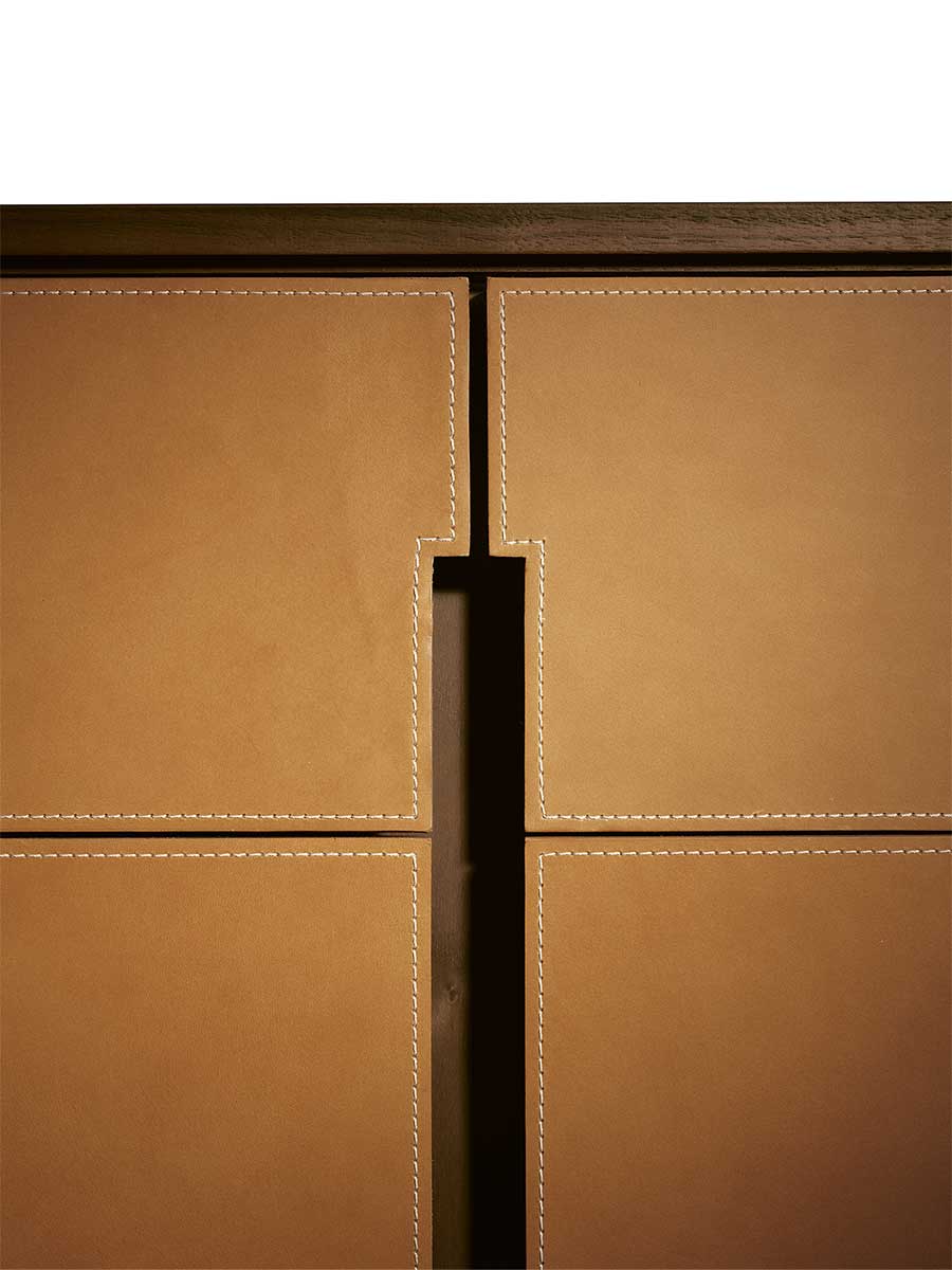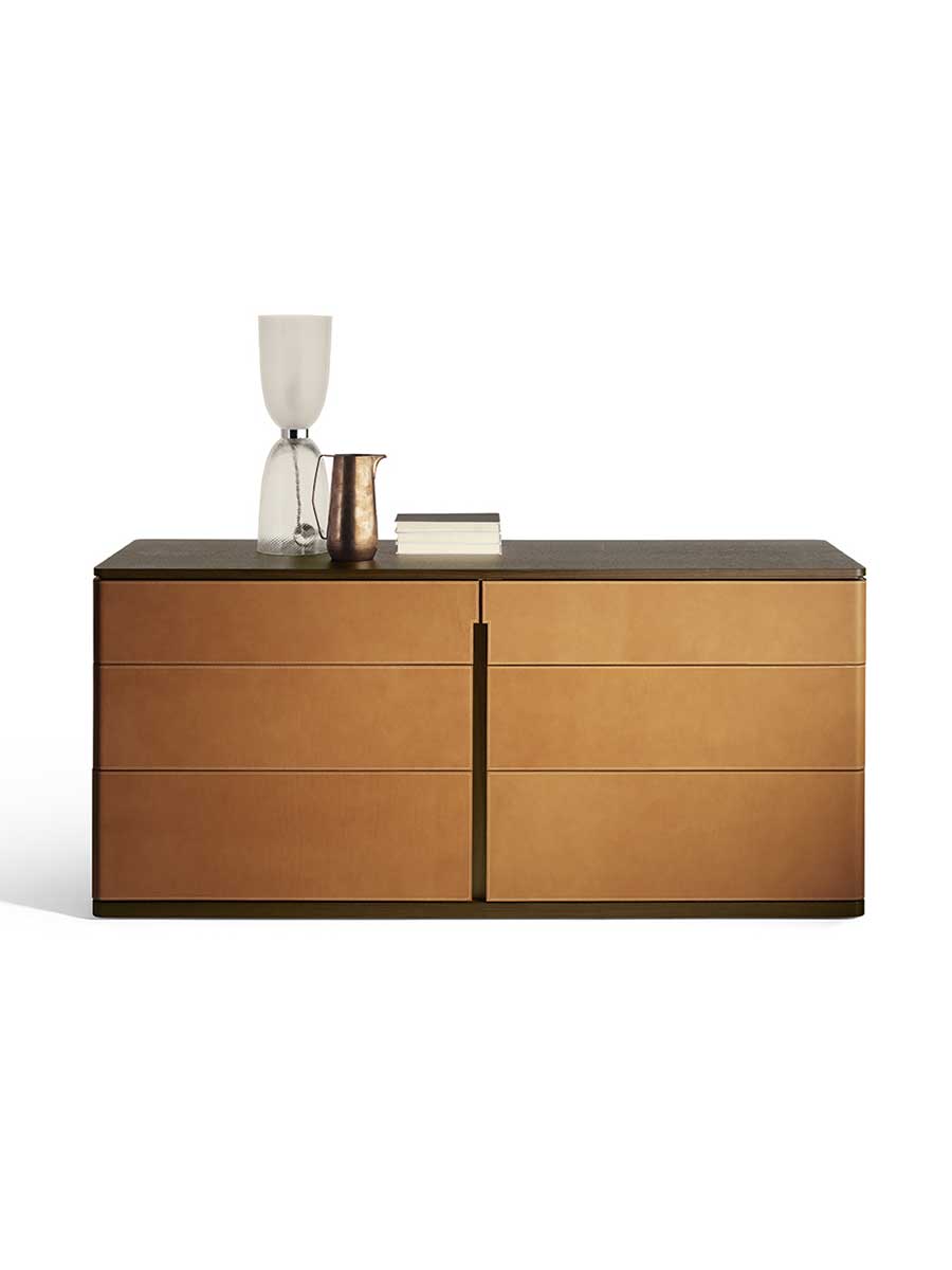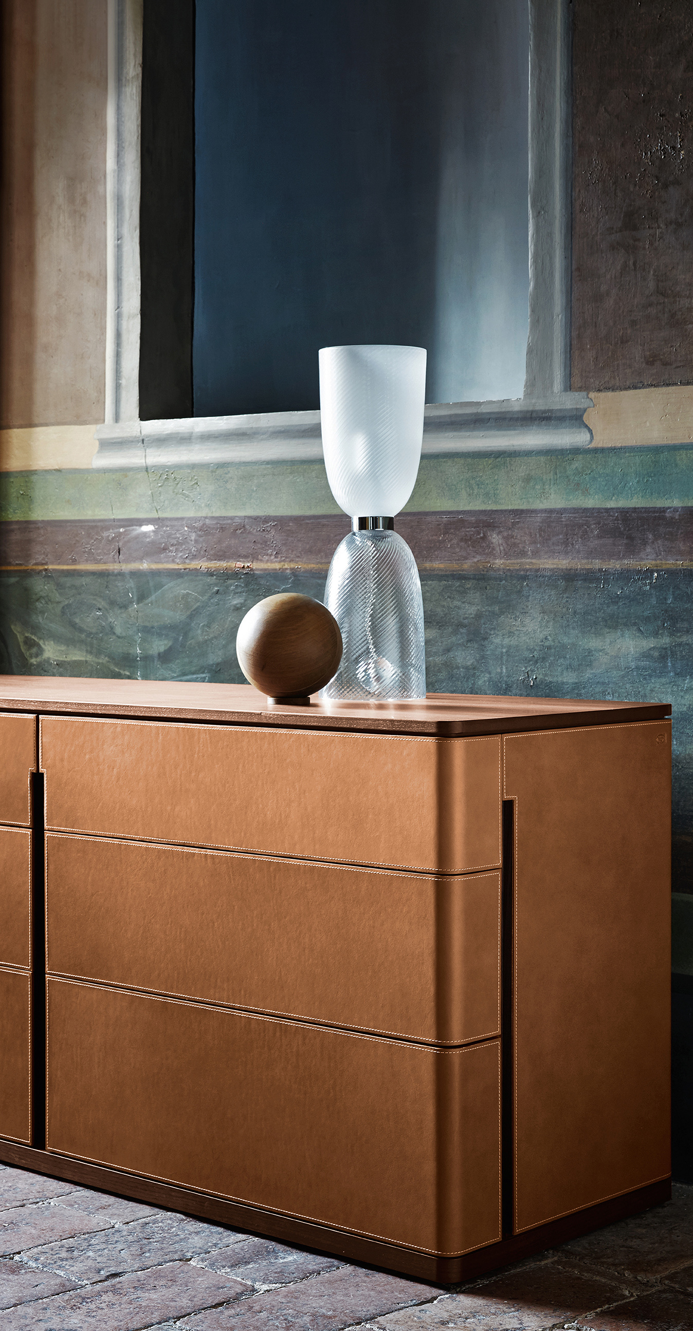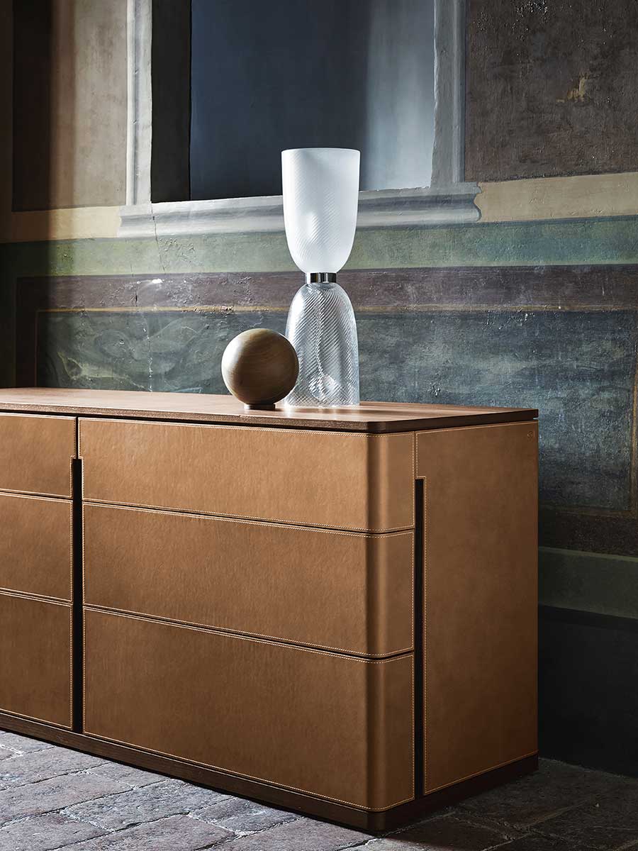 Комод Fidelio Notte имеет каркас из массива ореха Canaletto и берёзовой фанеры со шпоном ореха Canaletto. Внешние части ящиков и боковины обиты кожей с прострочкой в тон или контрастного цвета. Задняя стенка может быть отделана кожей или орехом Canaletto. Столешница доступна в отделке ореха Canaletto или мрамора в различных вариантах.