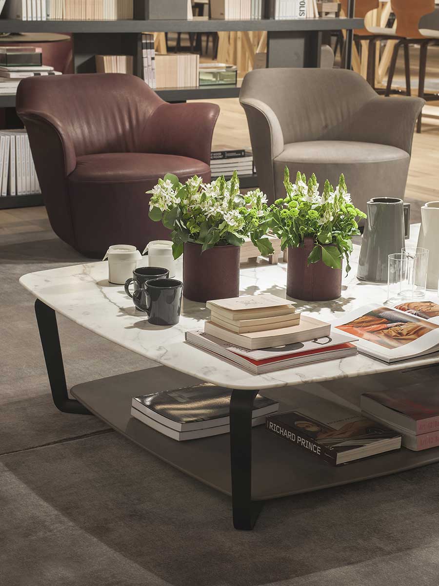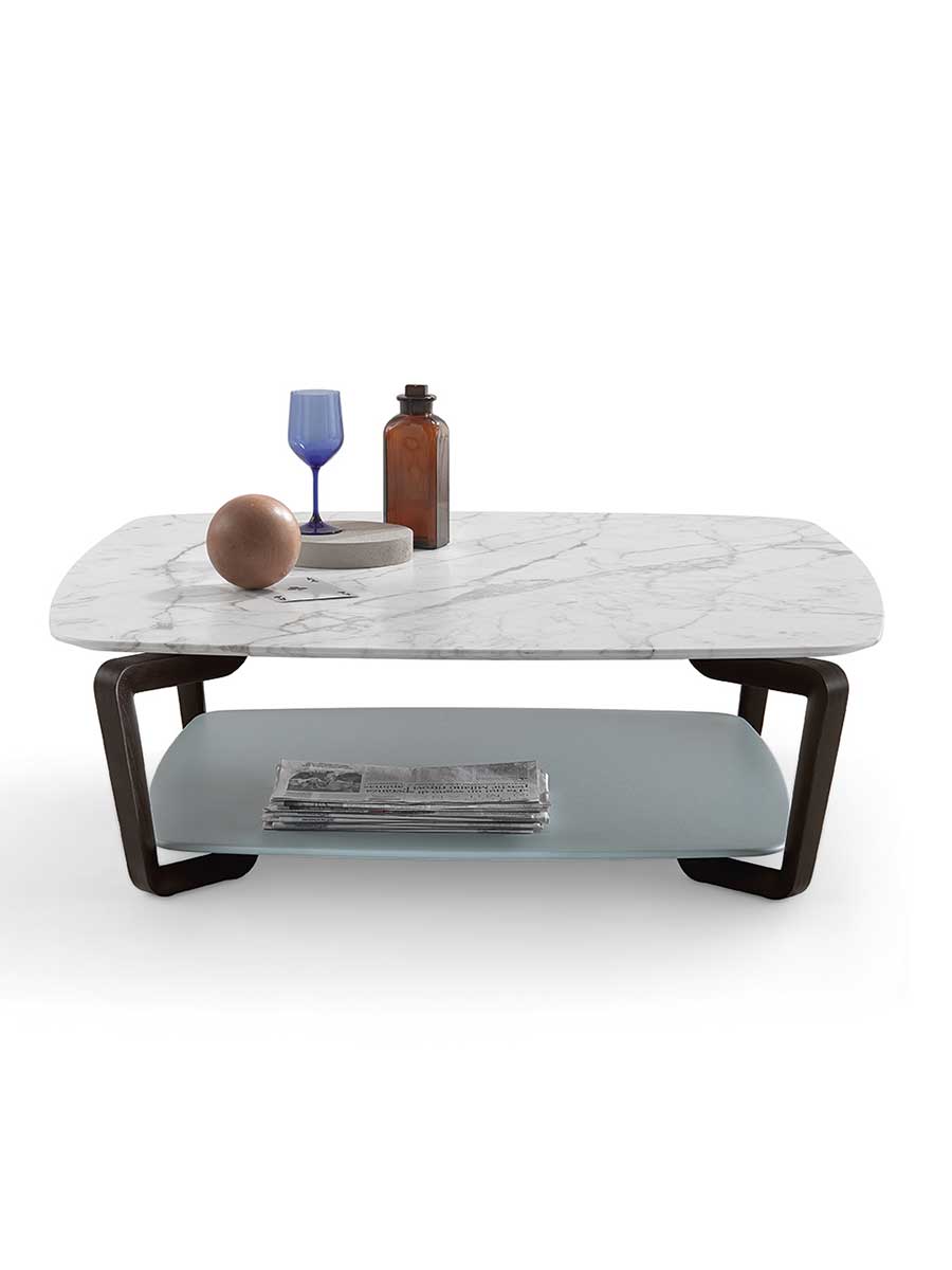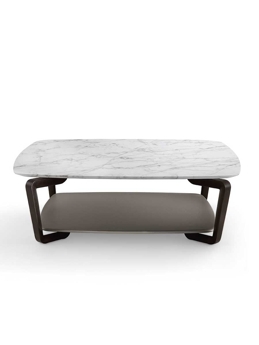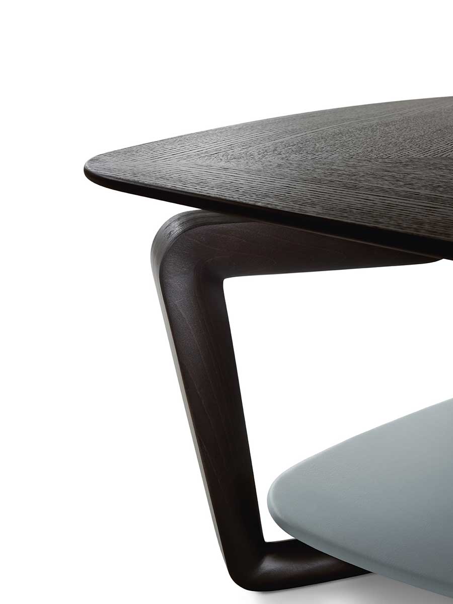 Основание двухполочного стола Fiorile изготовлено из массива ясеня, окрашенного в цвет мокка или венге, с характерным треугольным профилем. Верхняя столешница доступна в различных вариантах отделки: дерево и мрамор, а нижняя обтянута кожей Pelle Frau® SC ColorSphere®.