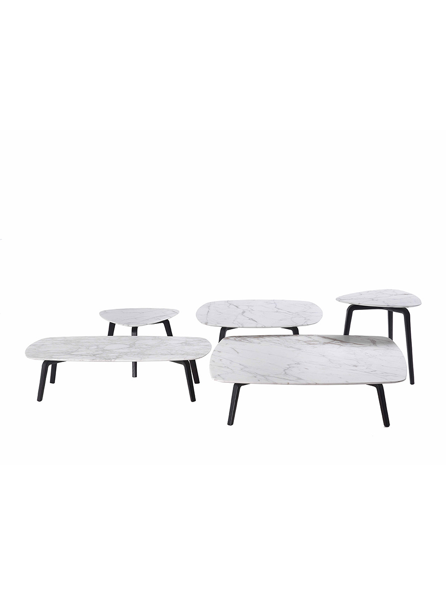 Основание треугольного приставного столика Fiorile изготовлено из массива ясеня, окрашенного в цвет мокко или венге. Столешница может быть выполнена из дерева или мрамора с различными вариантами отделки.