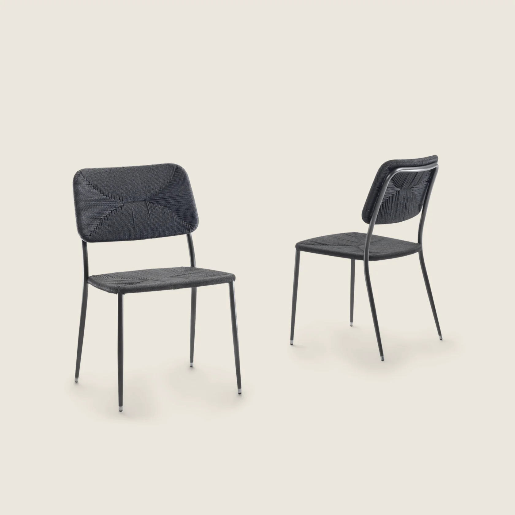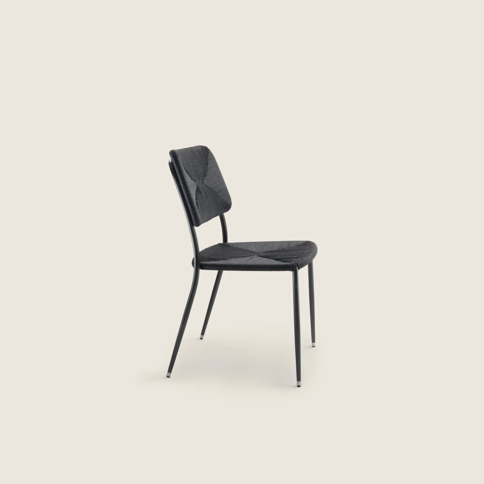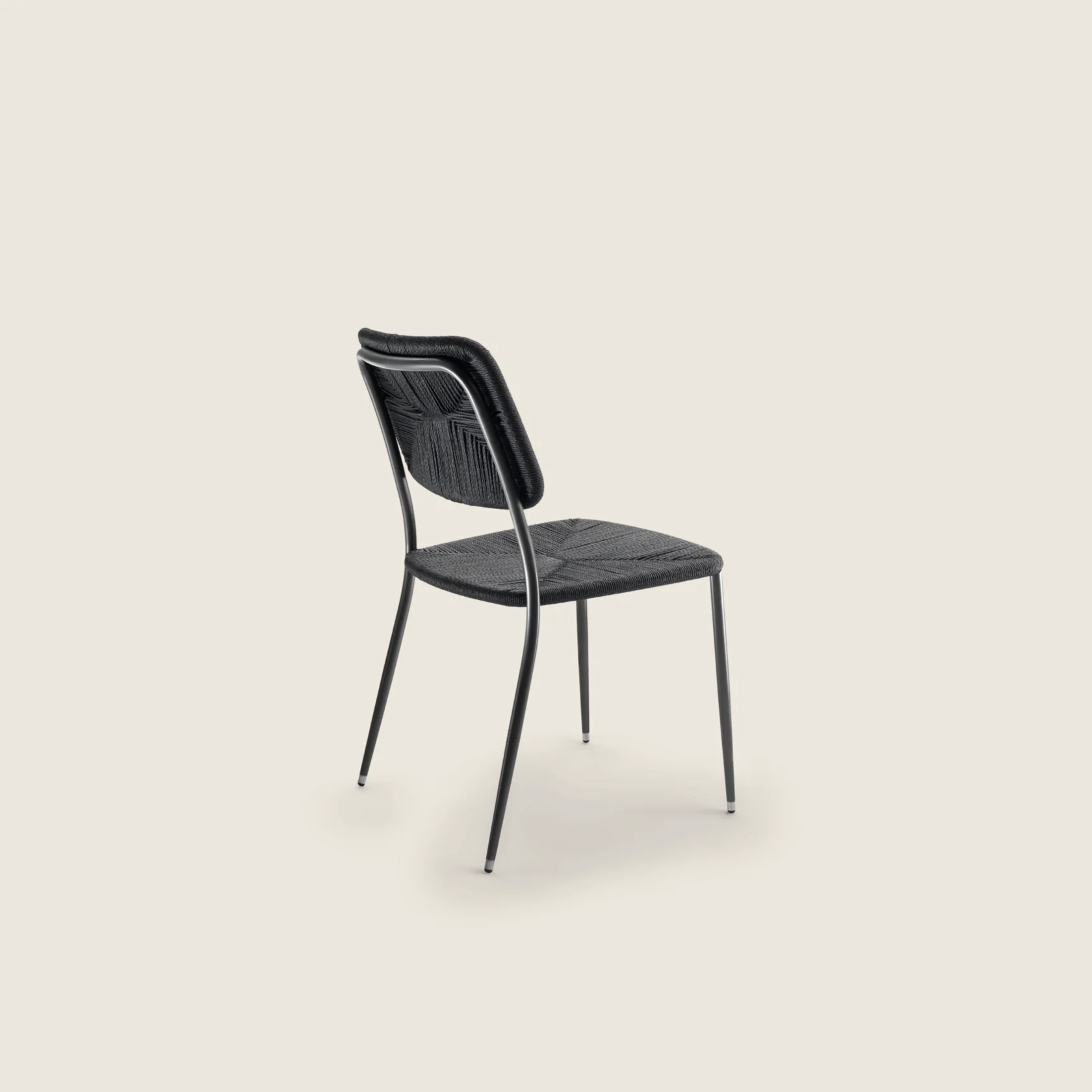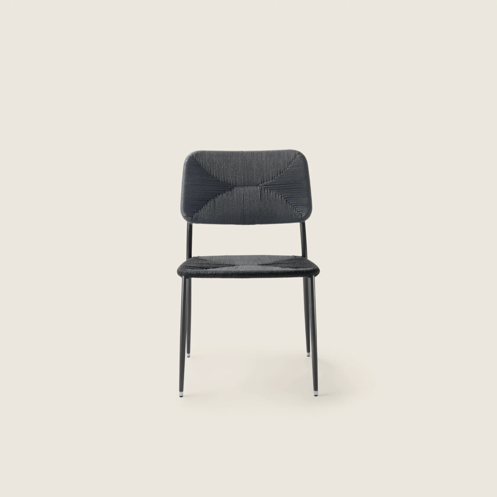 Элегантный стул с изогнутой металлической спинкой и ручным плетением сиденья. Компактный и универсальный, подходит для различных интерьеров.