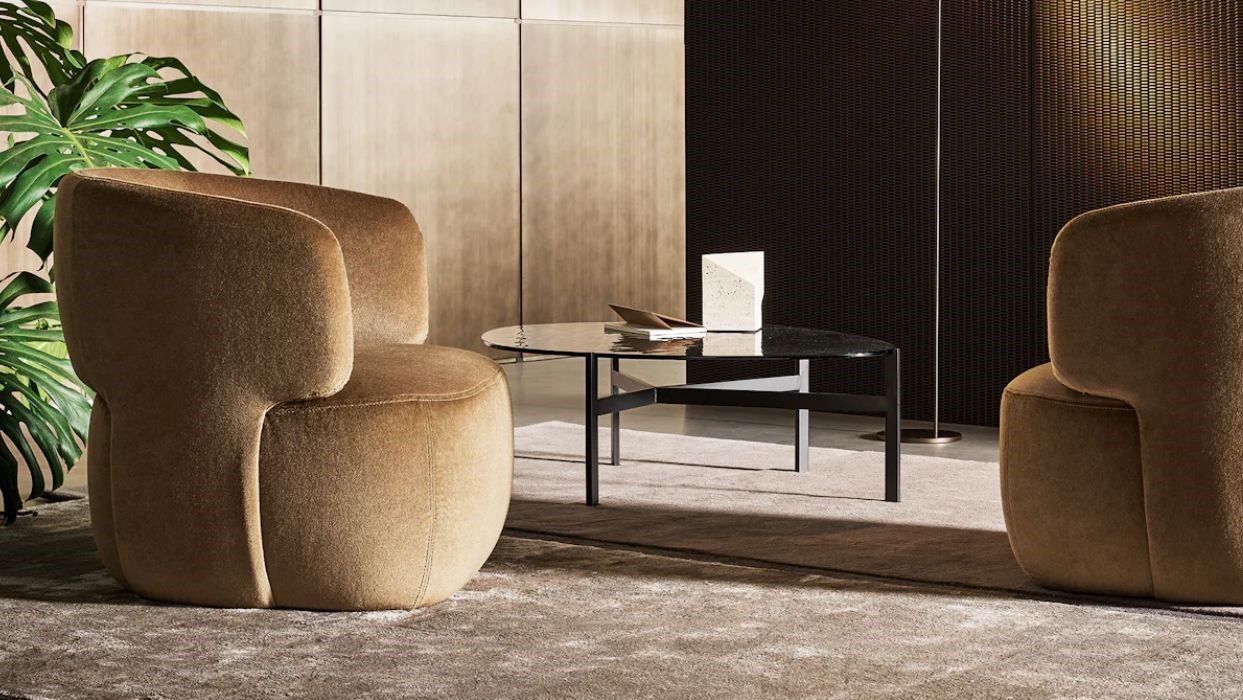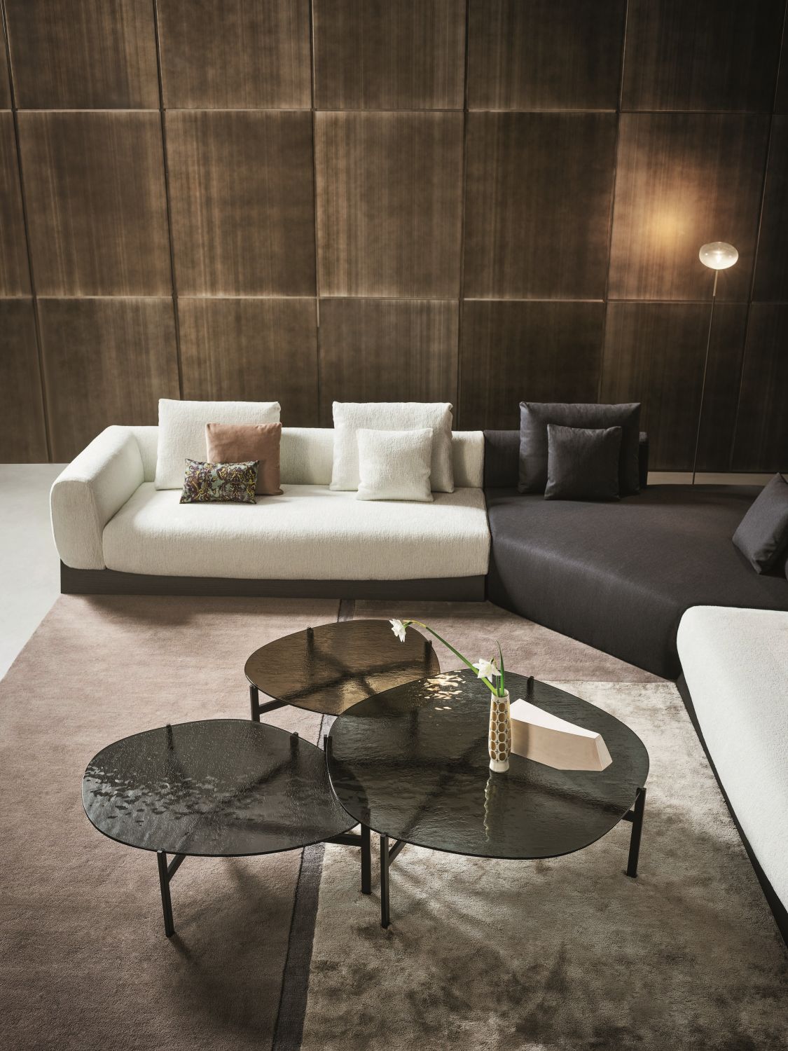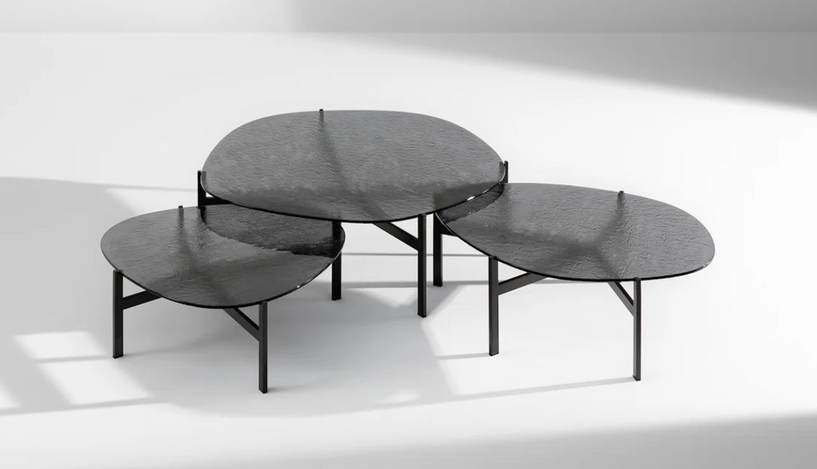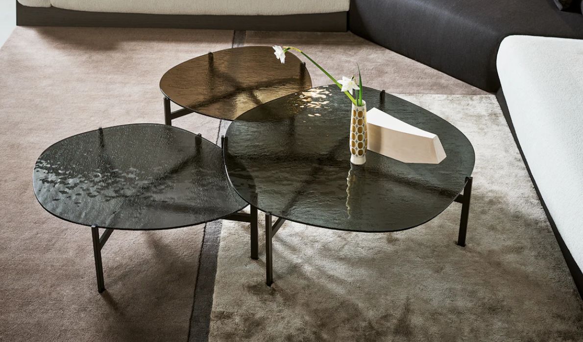 Главный акцент — столешница из литого закалённого стекла, создающая эффект водной глади. В версиях средней и низкой высоты доступны также варианты из дерева, керамики и мрамора, что делает Flac универсальным решением для интерьеров разных стилей.
