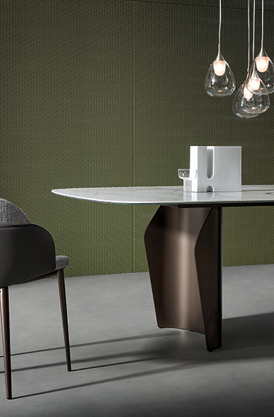 Основные черты Flame — это гармония форм, лёгкость и текучесть объёмов. Визуально парящая столешница полностью функциональна благодаря уникальной конструкции двойного основания, разработанного с учётом оптимального распределения пространства.