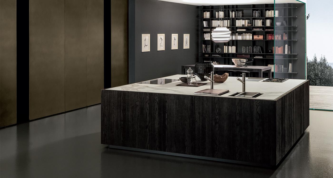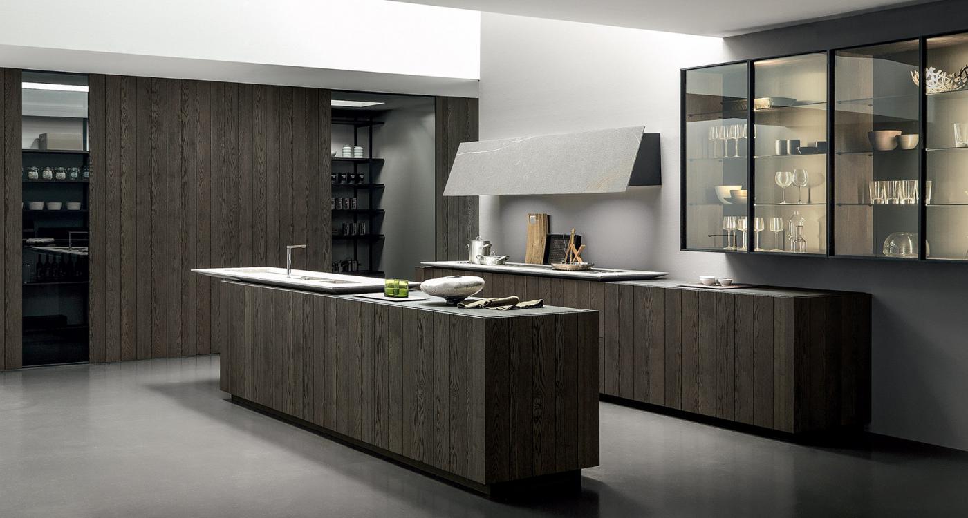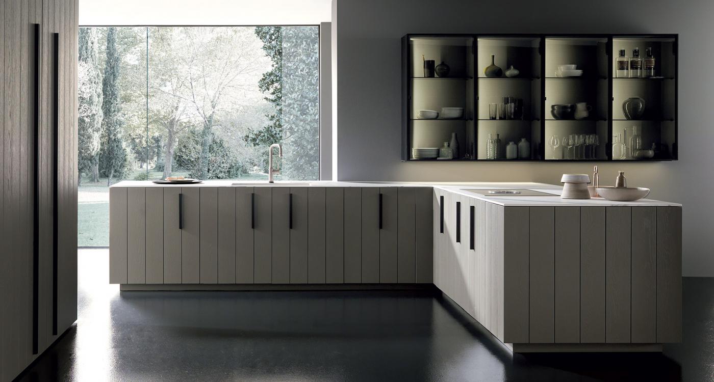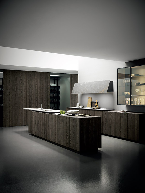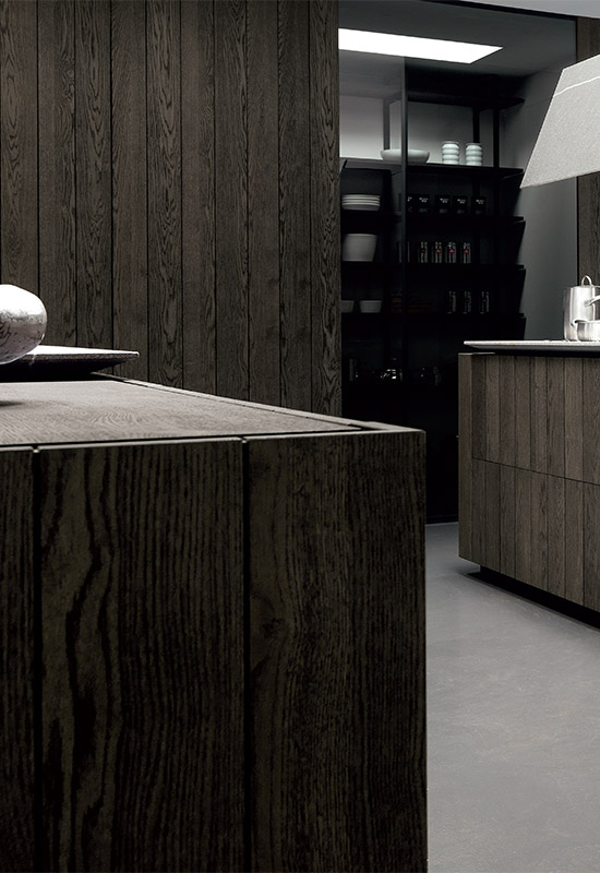 Элегантные двери толщиной 2,5 см из изысканного угольного дуба, выполненные из полос шириной 15 см, слегка приподняты над корпусом на 2 см. Эта конструктивная особенность позволяет открывать дверцу с помощью аккуратного 2-сантиметрового паза в столешнице, также выполненной из угольного дуба, добавляя интерьеру утончённую эстетику.