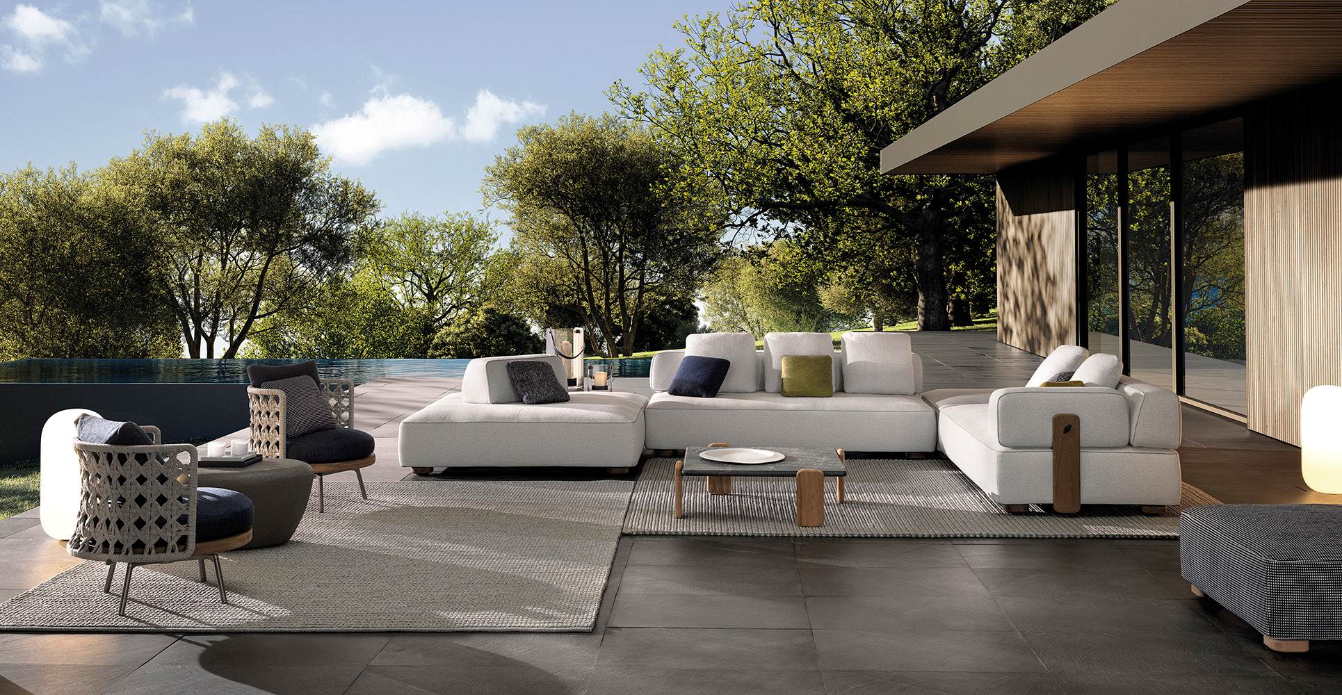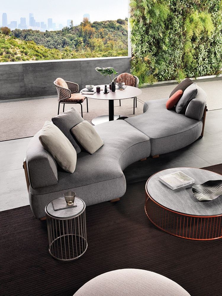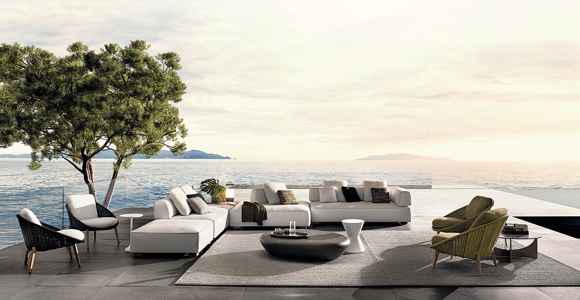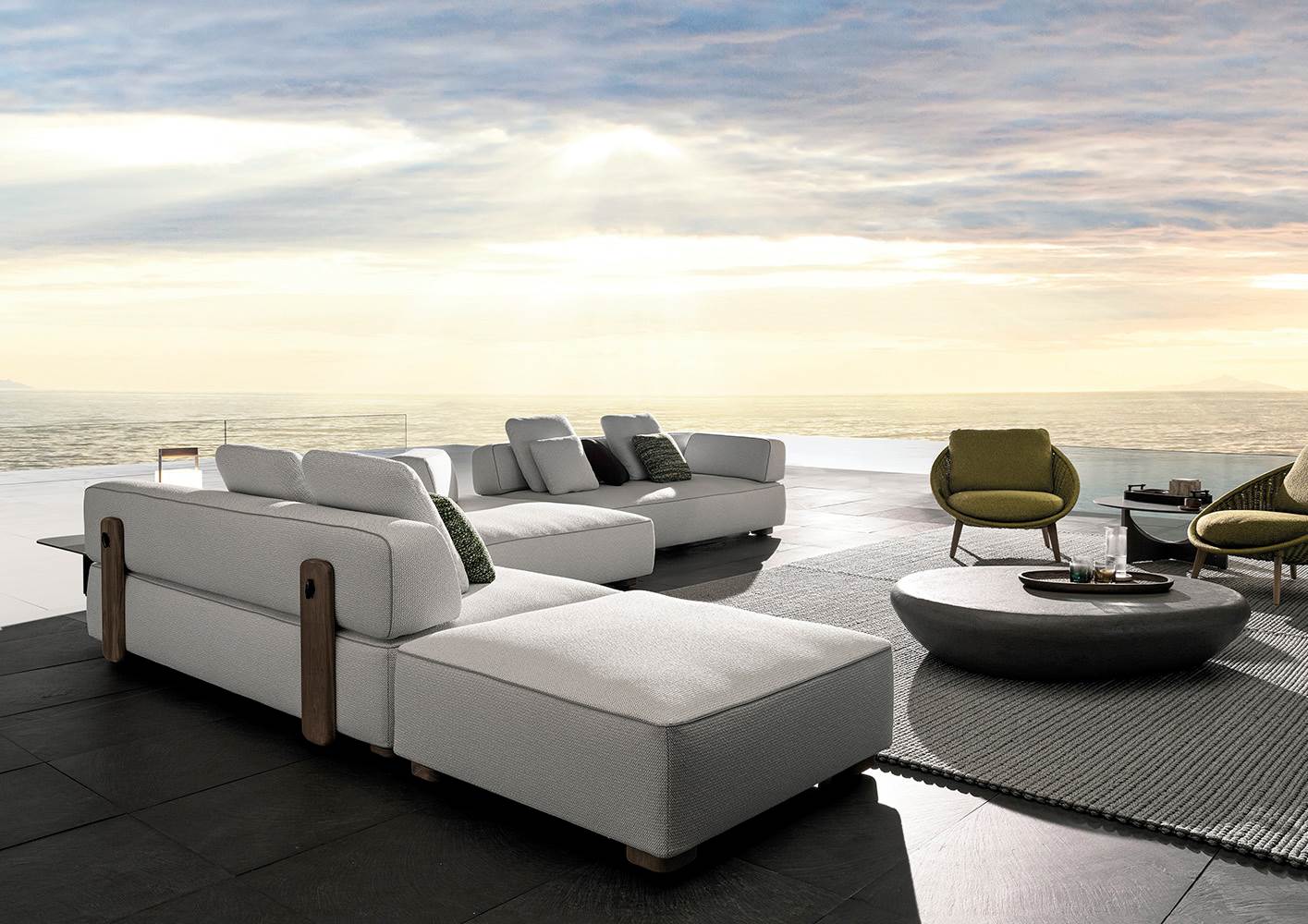Florida — один из самых универсальных уличных диванов Minotti. Его чистая геометрия и мягкие подушки делают его идеальным для террас и патио. Модули могут свободно комбинироваться, образуя как классические линейные композиции, так и угловые решения.