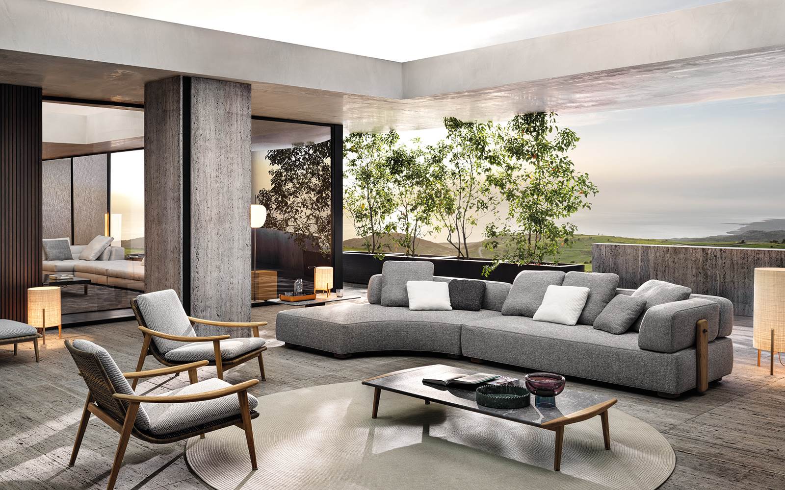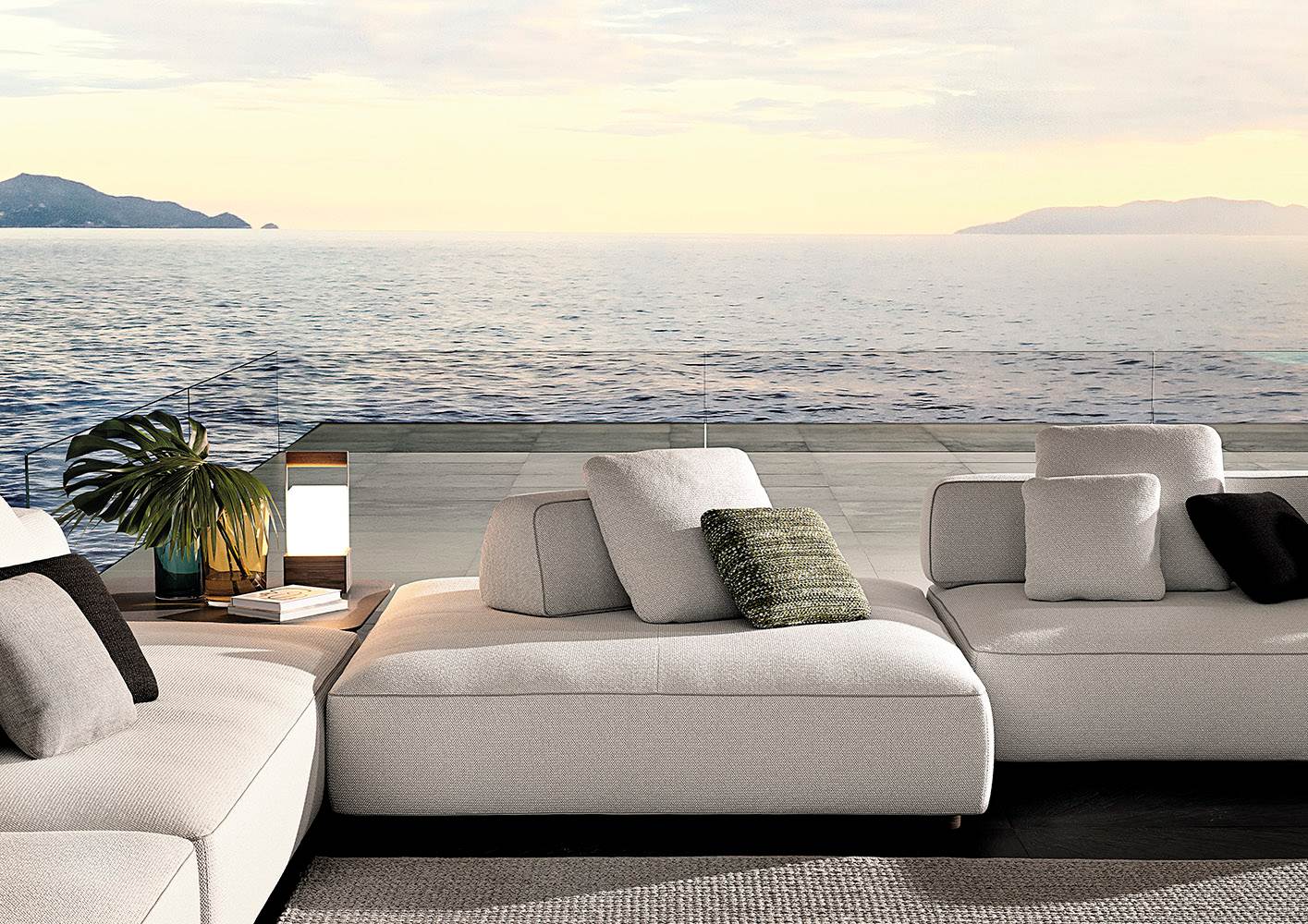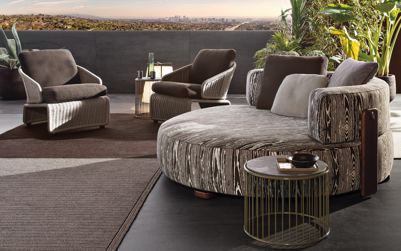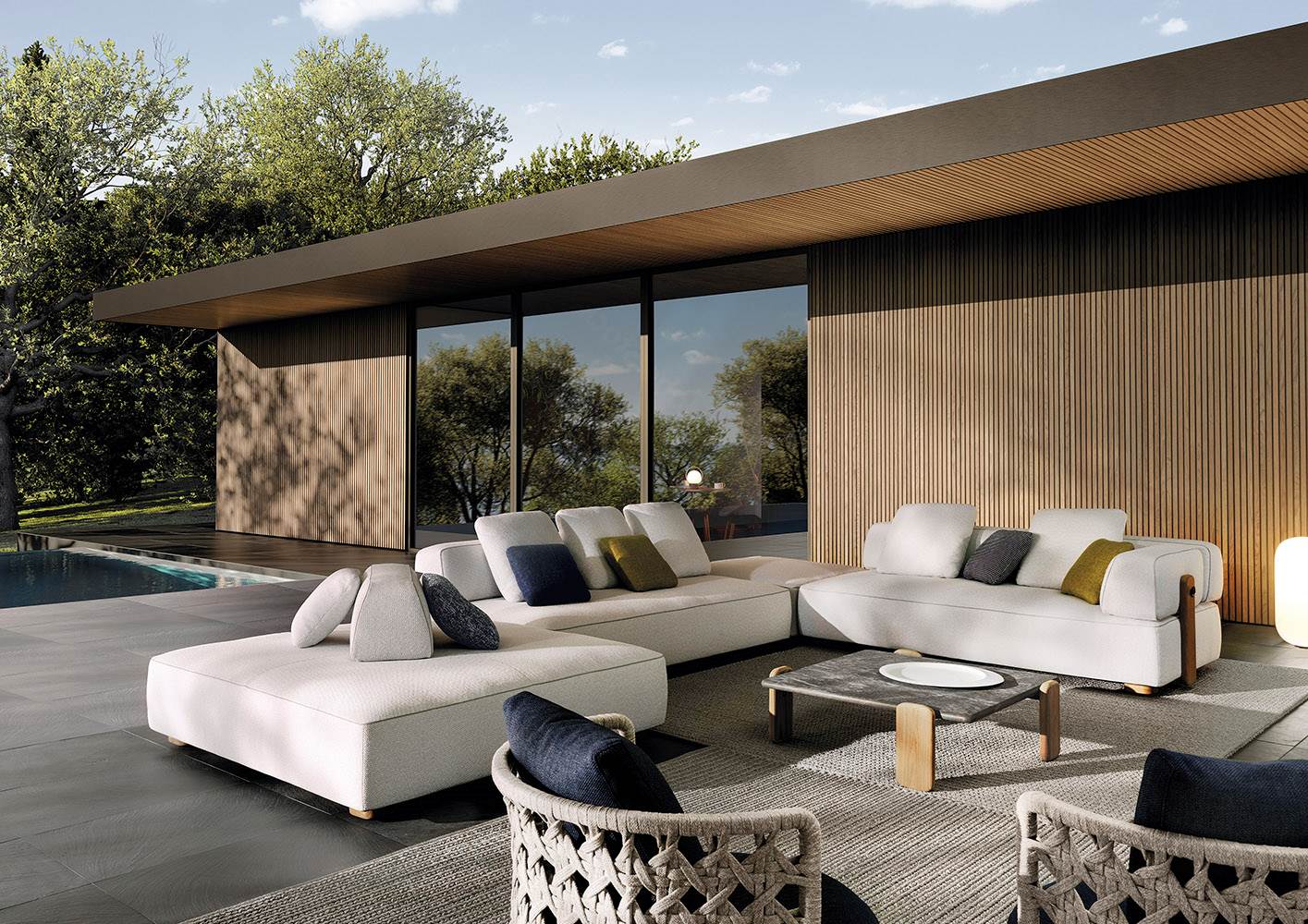 Florida — один из самых универсальных уличных диванов Minotti. Его чистая геометрия и мягкие подушки делают его идеальным для террас и патио. Модули могут свободно комбинироваться, образуя как классические линейные композиции, так и угловые решения.