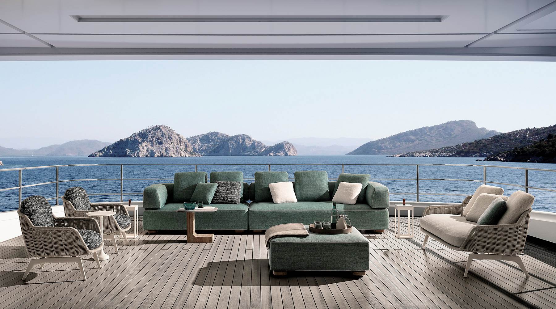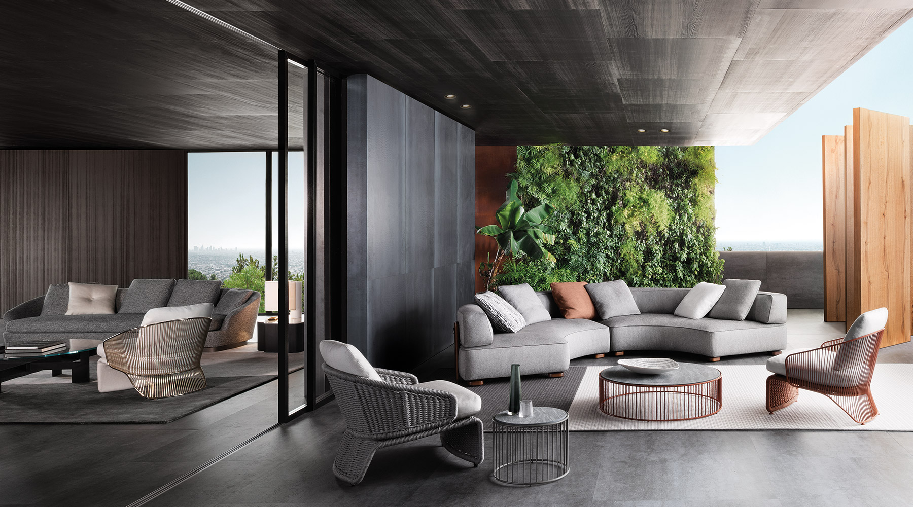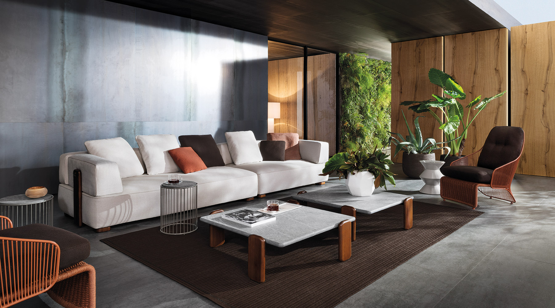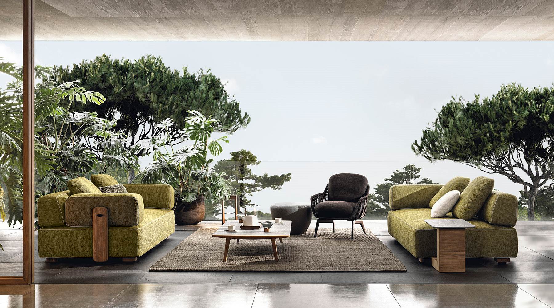 Florida — один из самых универсальных уличных диванов Minotti. Его чистая геометрия и мягкие подушки делают его идеальным для террас и патио. Модули могут свободно комбинироваться, образуя как классические линейные композиции, так и угловые решения.