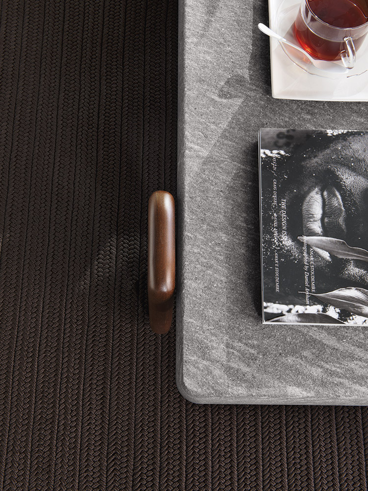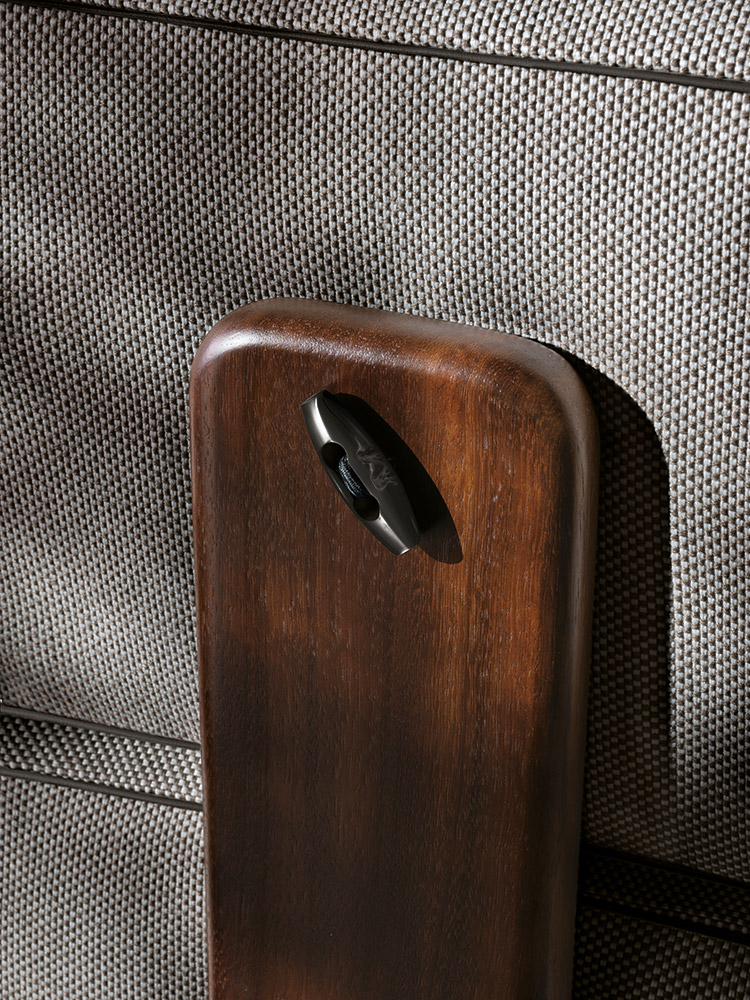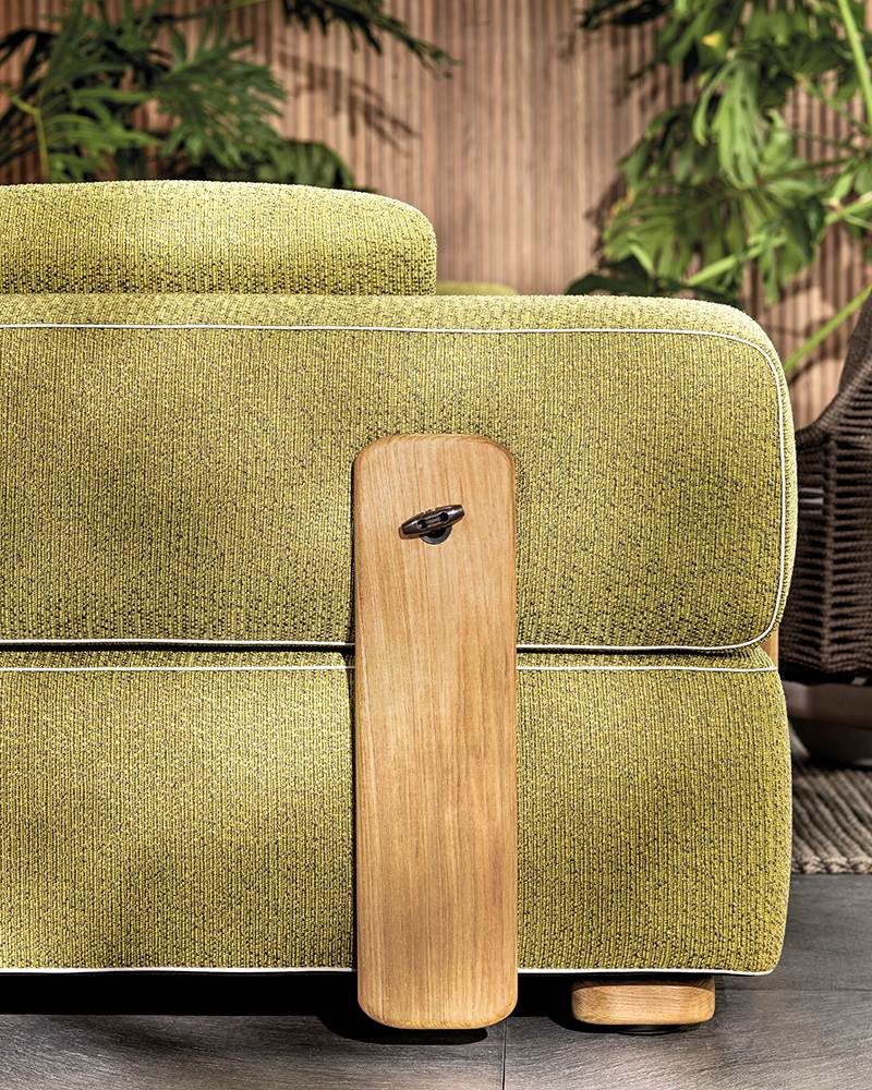 Каркас основания выполнен из окрашенного алюминия, устойчивого к атмосферным воздействиям, но в конструкции также используются вставки из массива тикового дерева. Эти деревянные детали добавляют теплоту и визуальное богатство коллекции, делая её гармоничной для использования на открытом воздухе — террасах, верандах и садах.