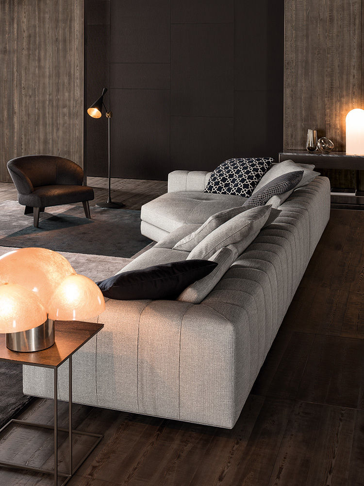 Материалы: каркас — древесина с системой эластичных ремней; наполнение — многослойный полиуретан и гусиный пух; обивка — ткань или кожа из коллекции Minotti; декоративные детали — швы с отстрочкой, подушки и спинки с "пуховым" эффектом