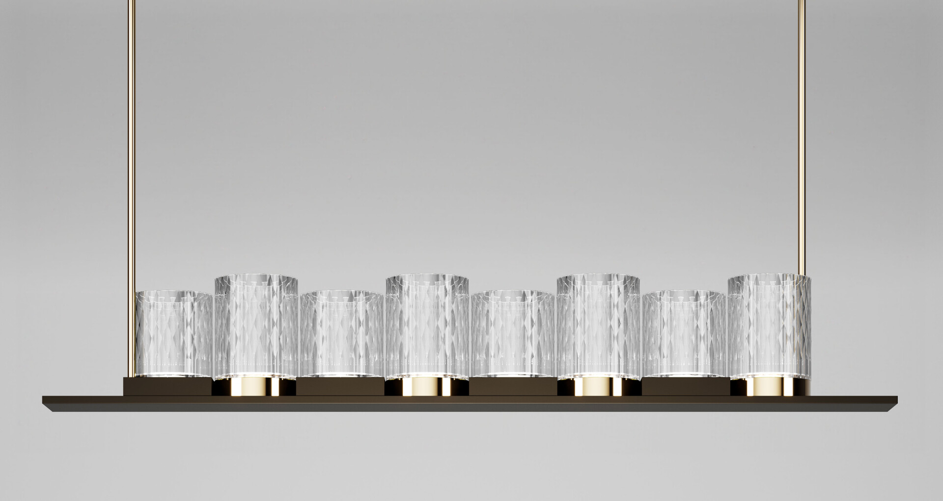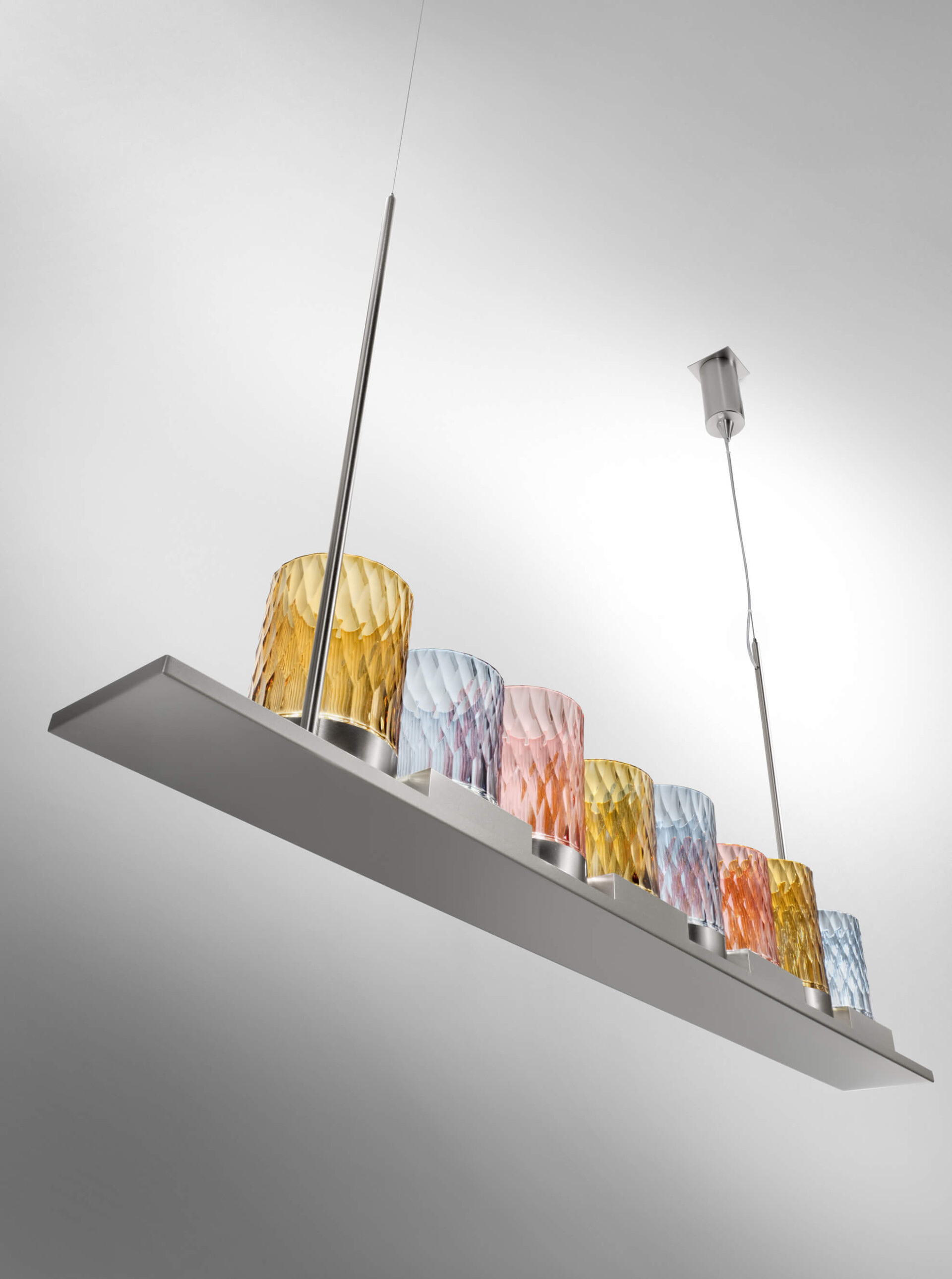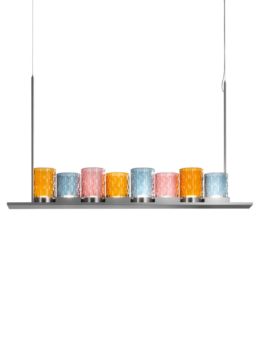 Подвесной светильник с металлической структурой из матового хрома и сатинированного серебра или светлого золота и матовой бронзы с рассеивателями из ограненного вручную хрусталя.