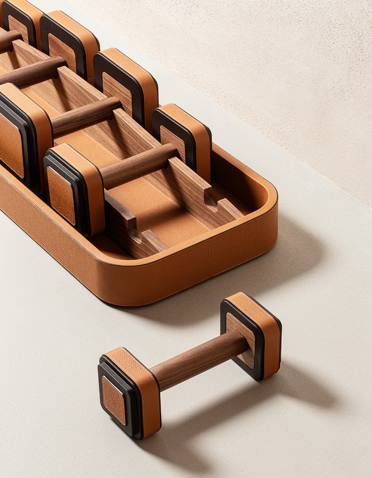 Гантели выполнены из бронзы с матовой полировкой, с кожаными вставками Pelle Frau® и рукоятками из орехового дерева.