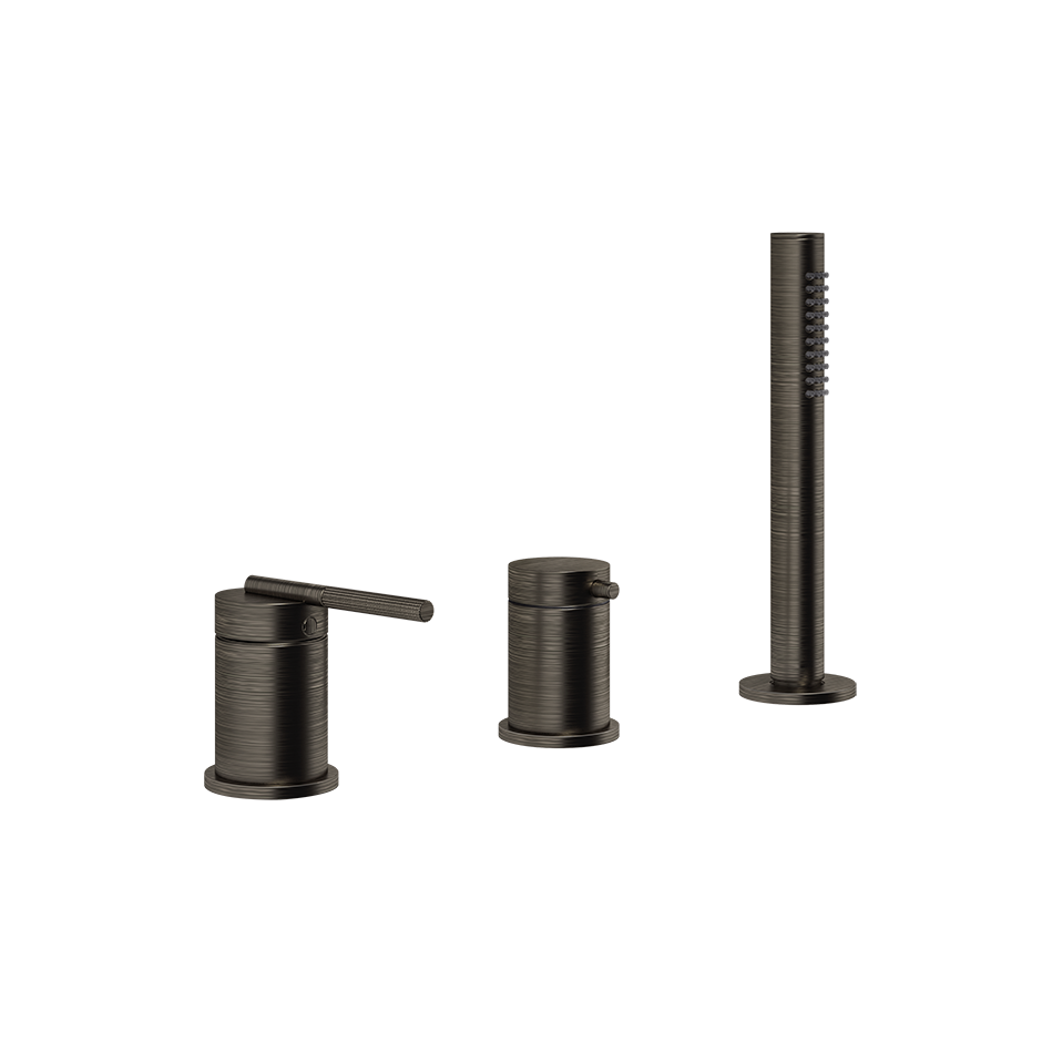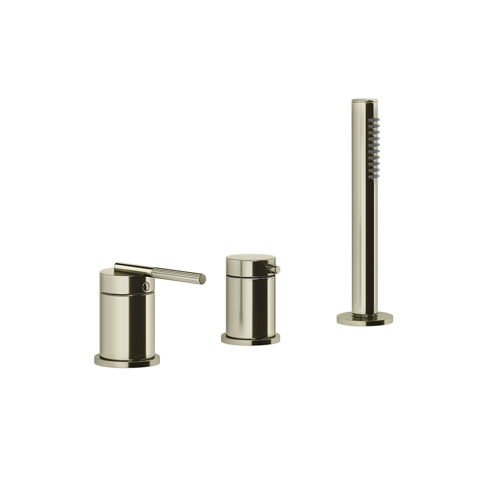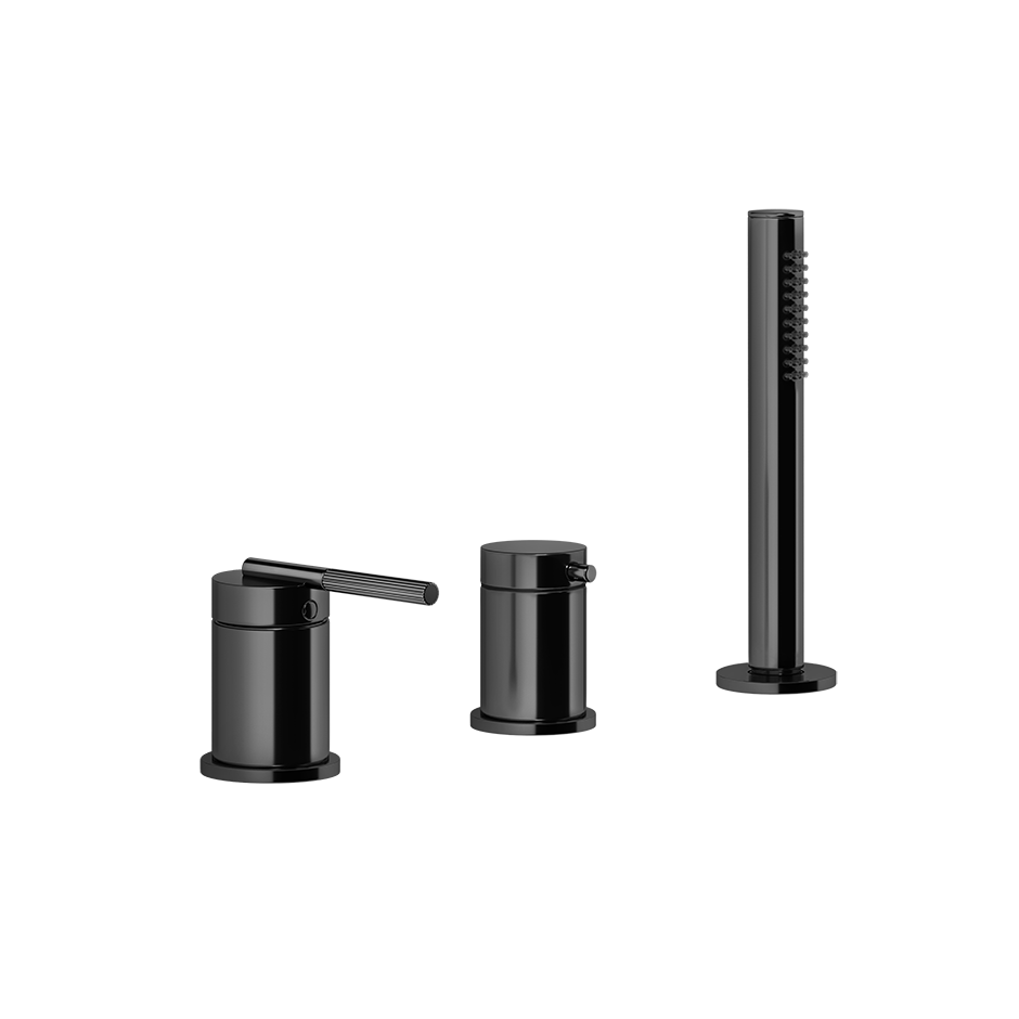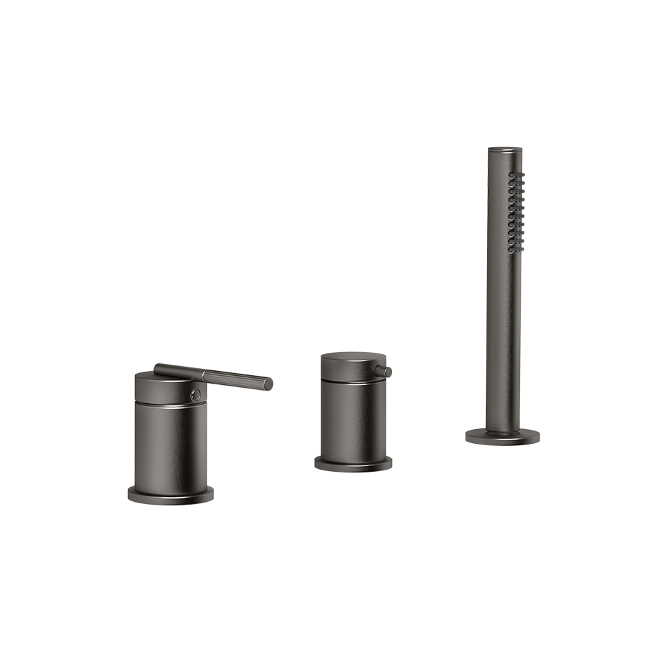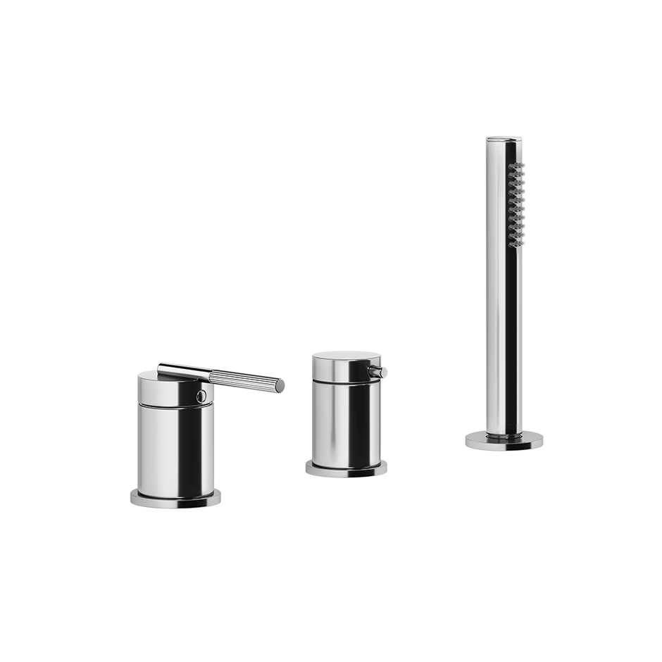 Смеситель для ванны на три отверстия с переключателем, гибким шлангом длиной 1,50 м и ручным душем с защитой от известкового налета. Подходит для использования с переливом.