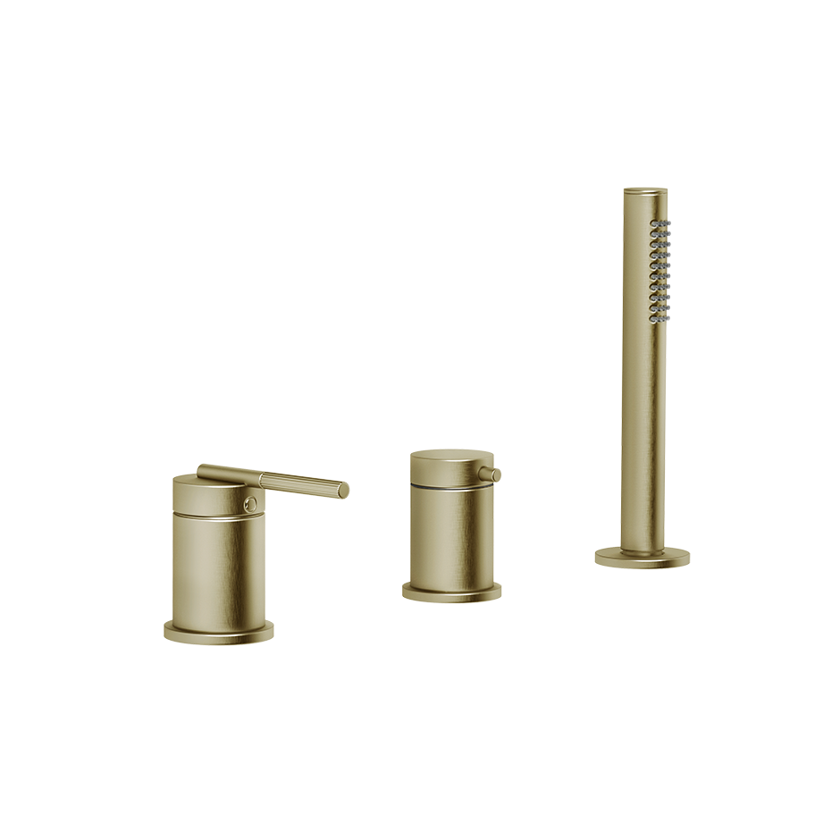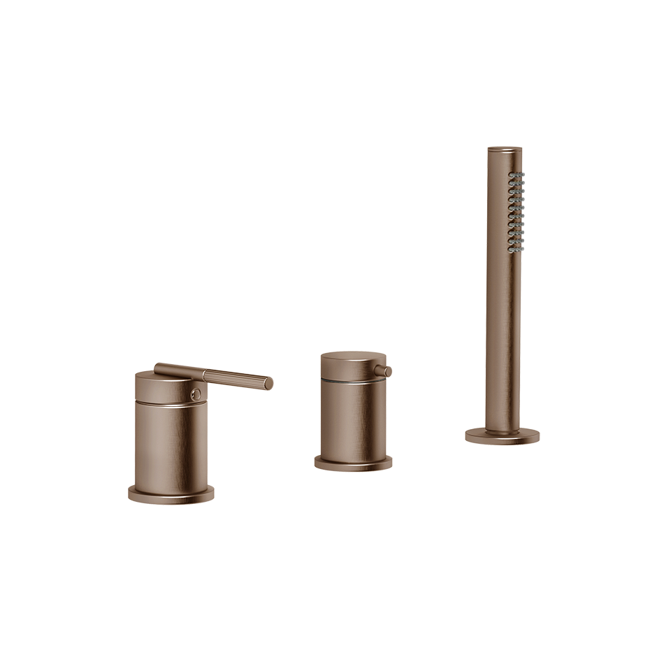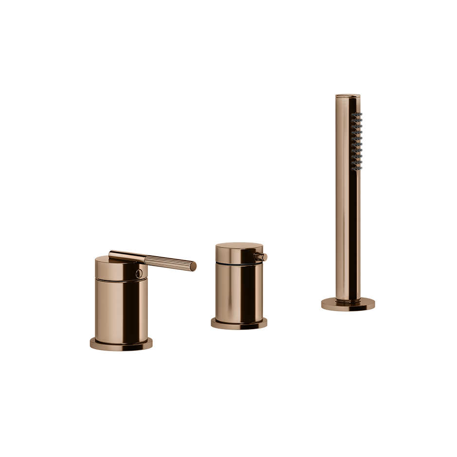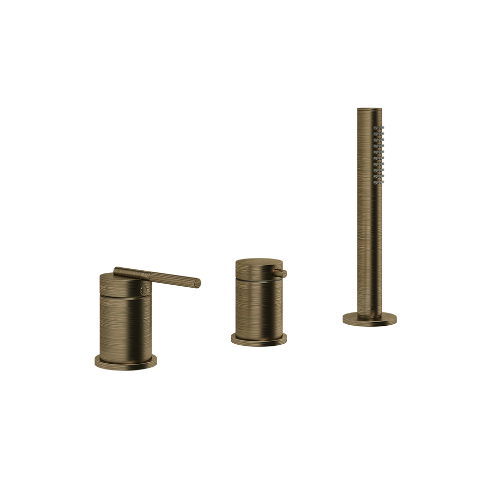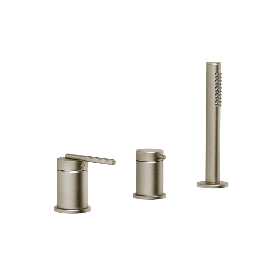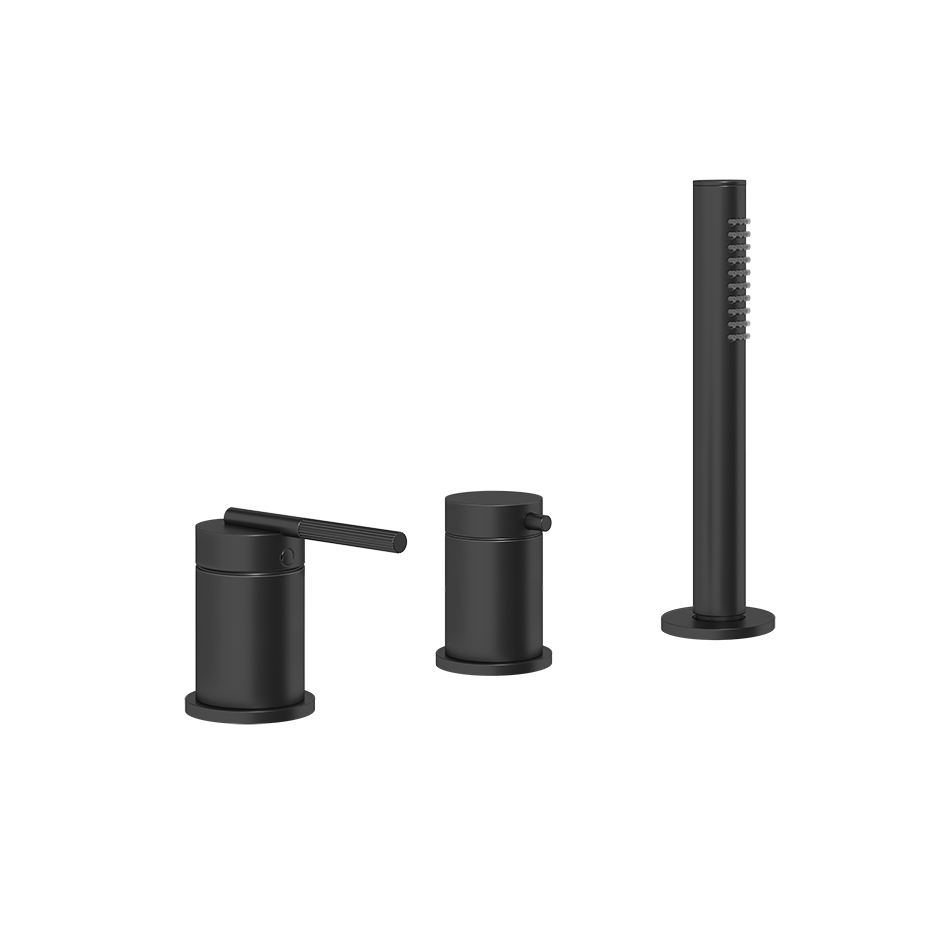 Смеситель для ванны на три отверстия с переключателем, гибким шлангом длиной 1,50 м и ручным душем с защитой от известкового налета. Подходит для использования с переливом.