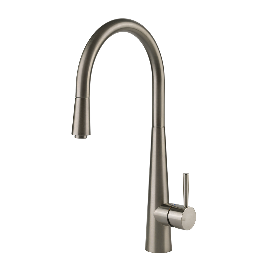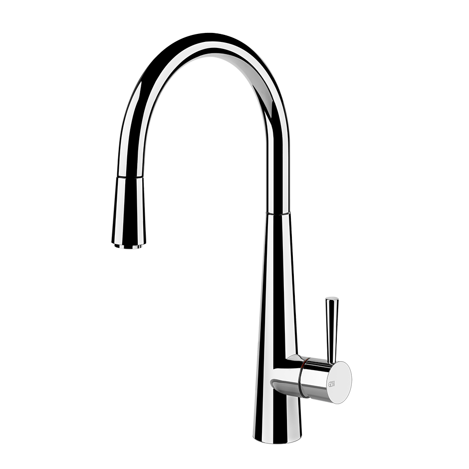 Смеситель для раковины с поворотным изливом и выдвижным ручным душем с одной форсункой.
