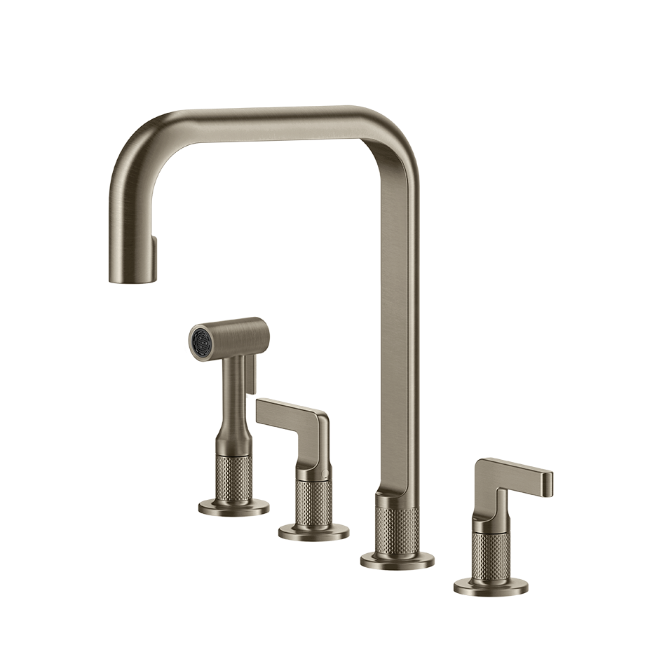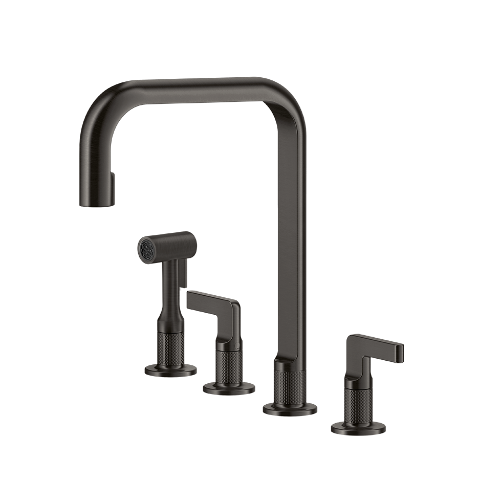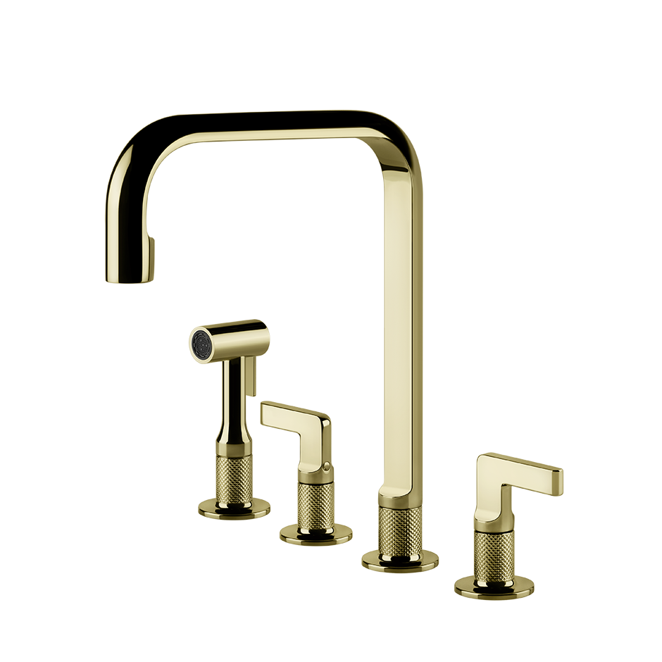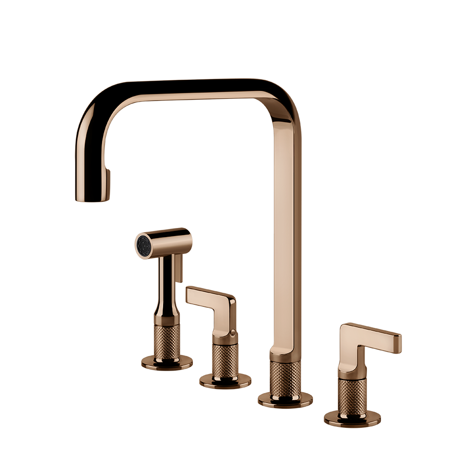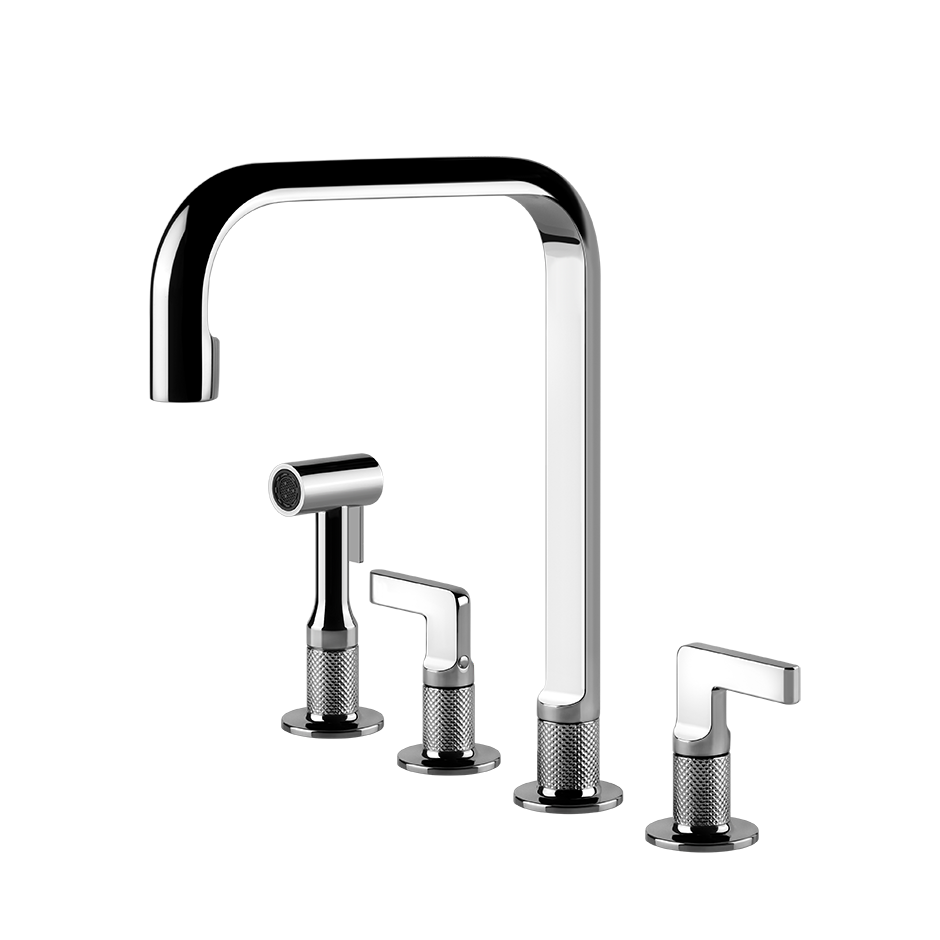 Четырехпозиционный смеситель с поворотным изливом и выдвижным ручным душем с одной форсункой
