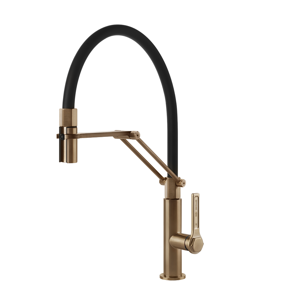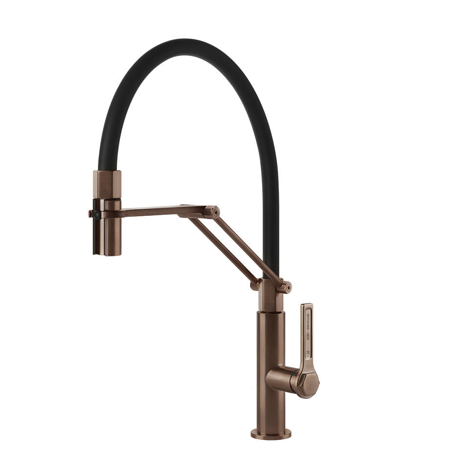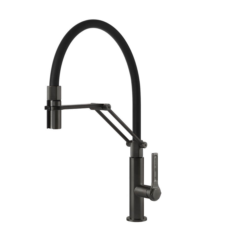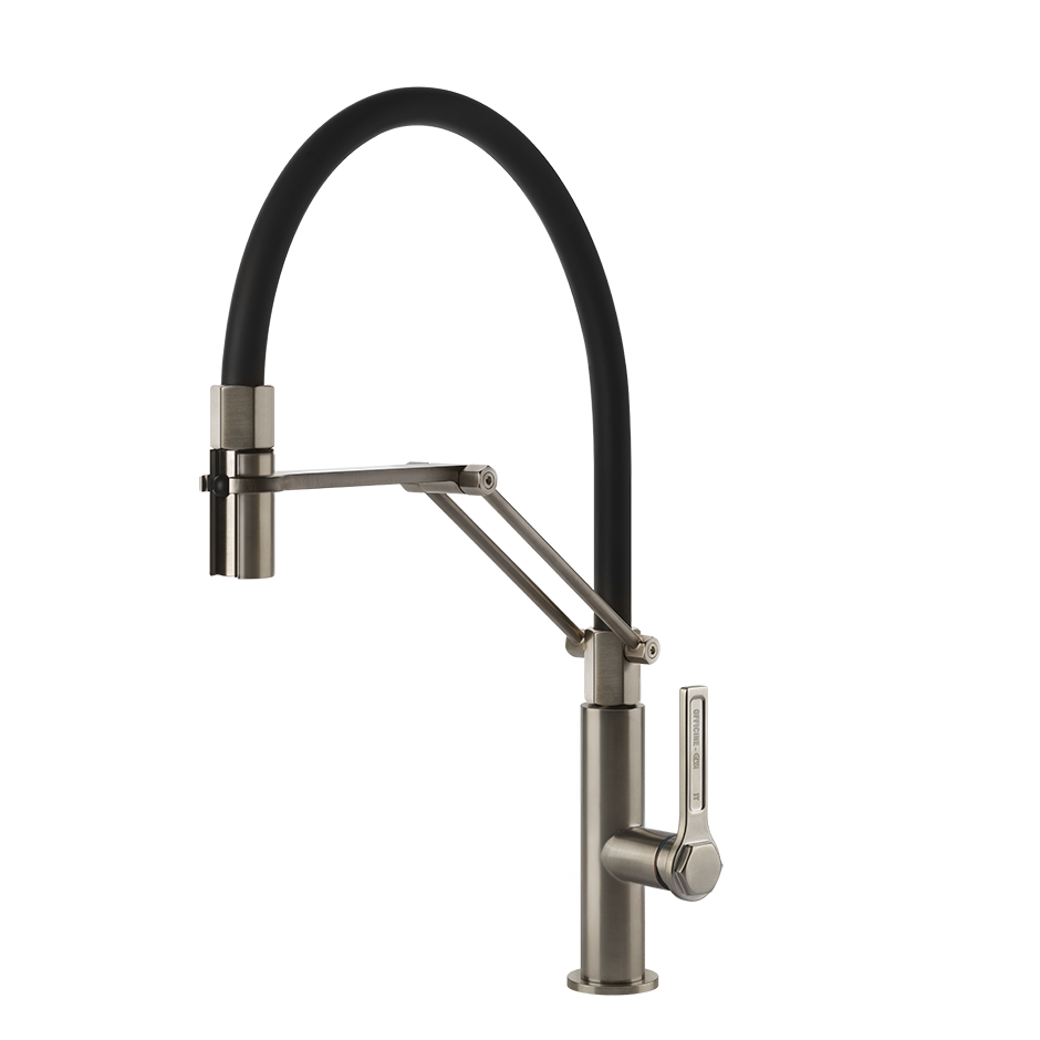 Полупрофессиональный смеситель для мойки с поворотным изливом и выдвижным ручным душем с двумя форсунками.