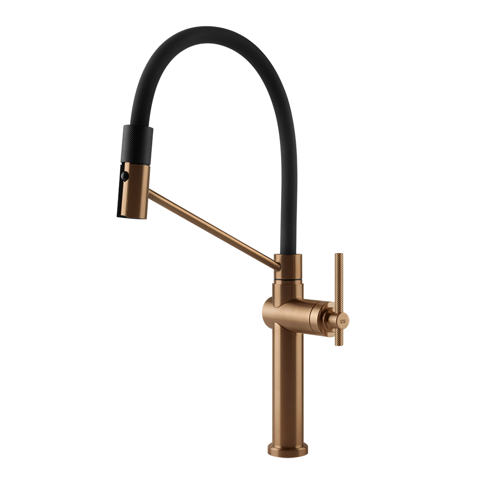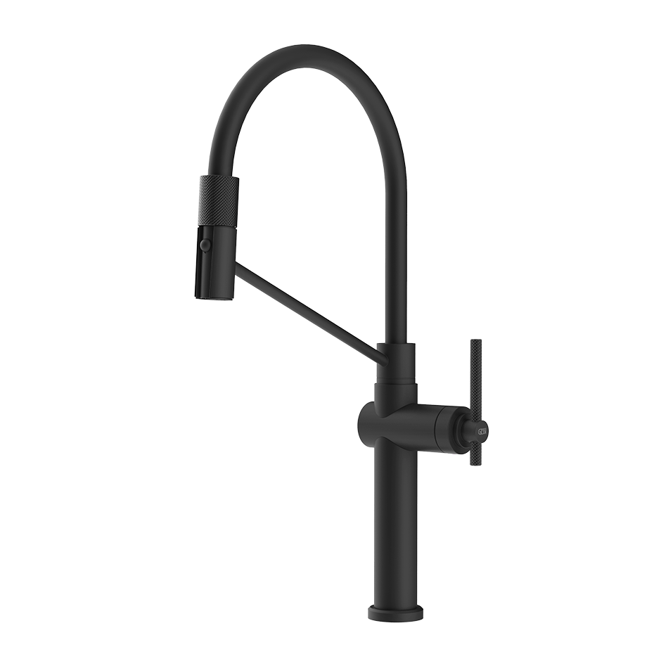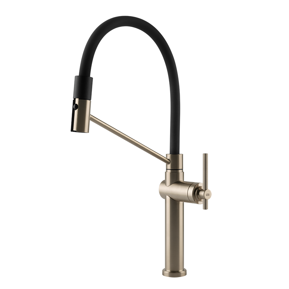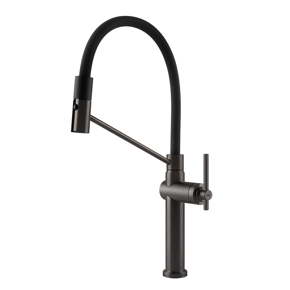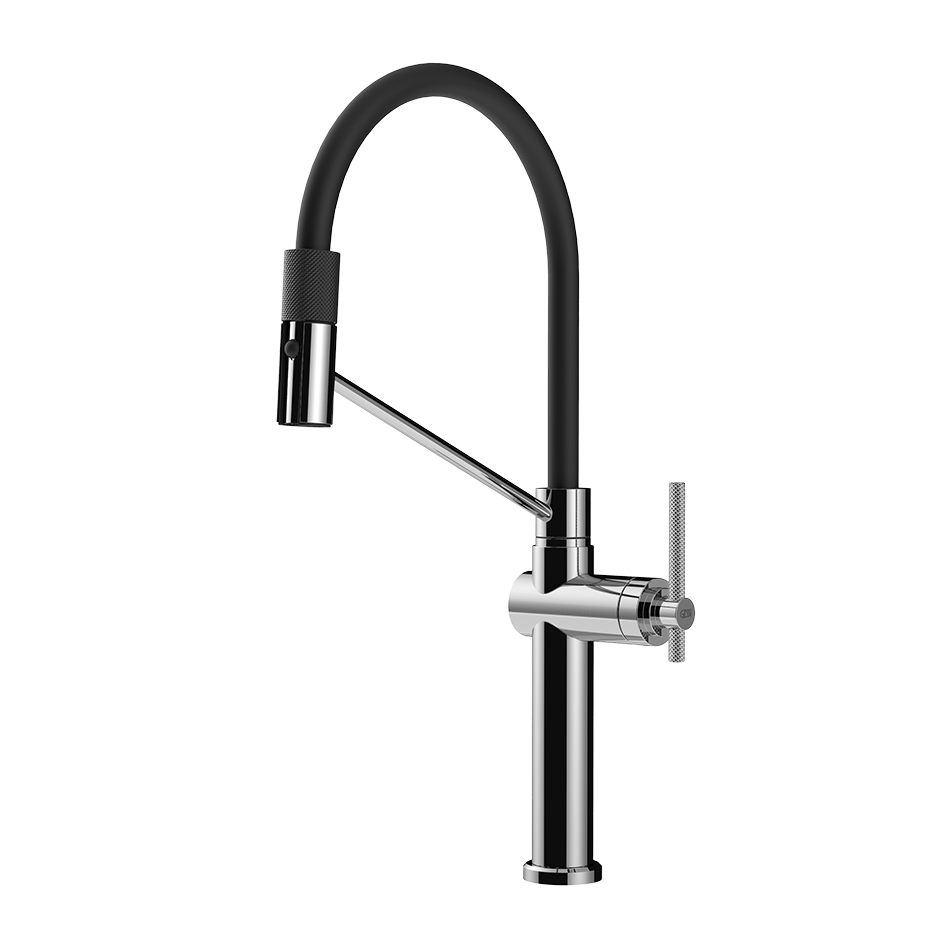 Полупрофессиональный смеситель для мойки с поворотным изливом и выдвижным ручным душем с двумя форсунками.
