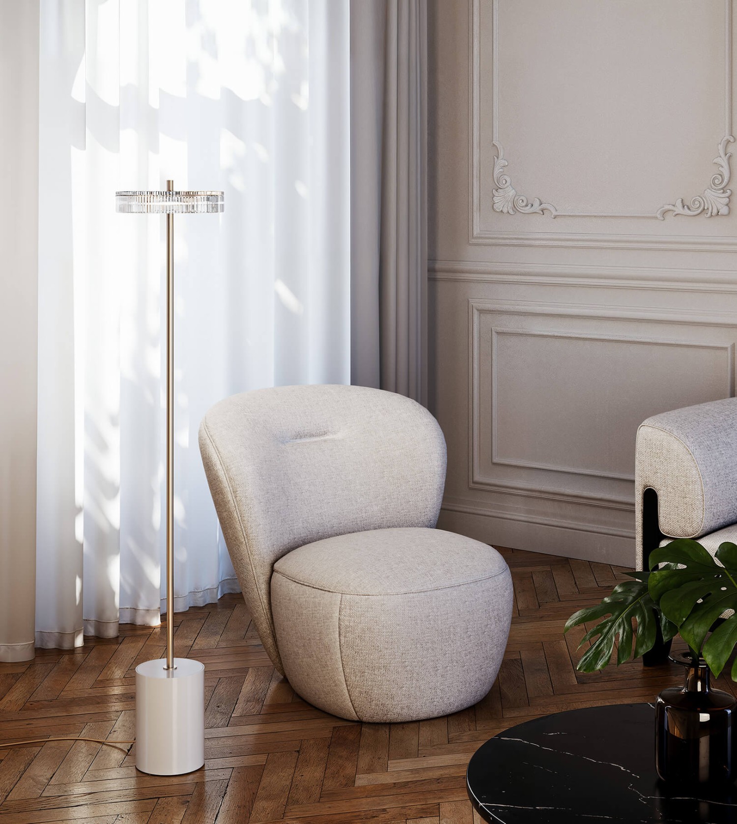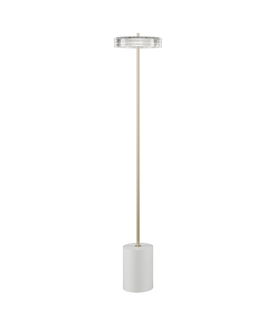 Напольный светильник с металлическим каркасом с матовой отделкой цвета шампанского или кортеновской стали, глянцевым белым металлическим основанием и абажуром из ограненного хрусталя.
