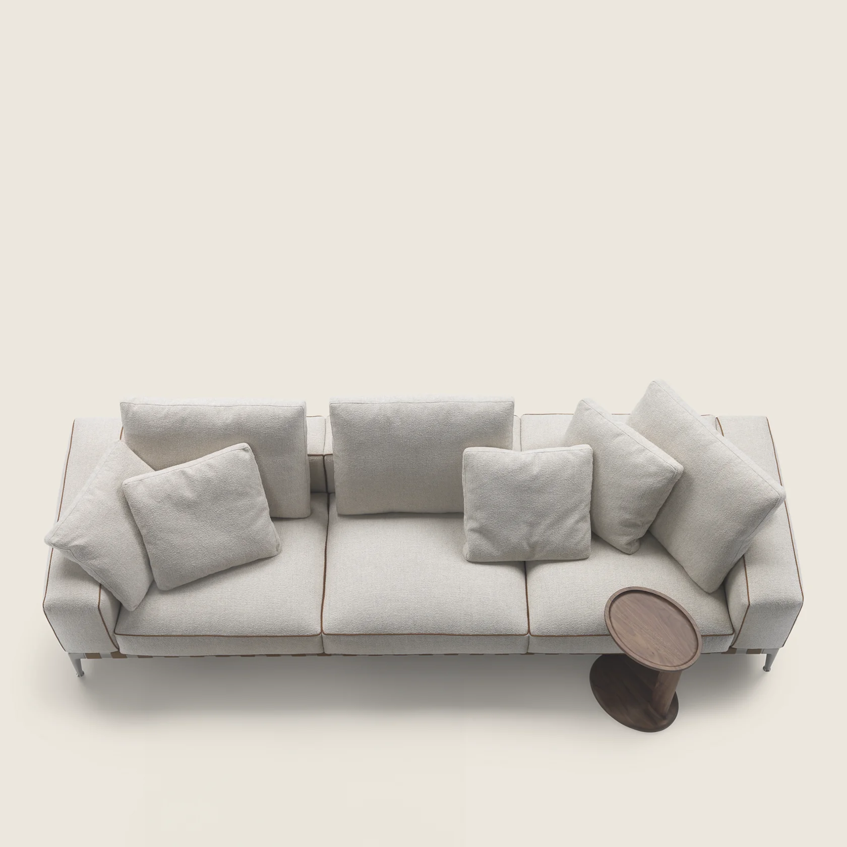 Металлический каркас с отделкой из кожи на видимых частях эластичных ремней, поддерживающих подушки сиденья. Ножки из алюминия с хромированной отделкой. Обивка съемная, доступна в ткани или коже.