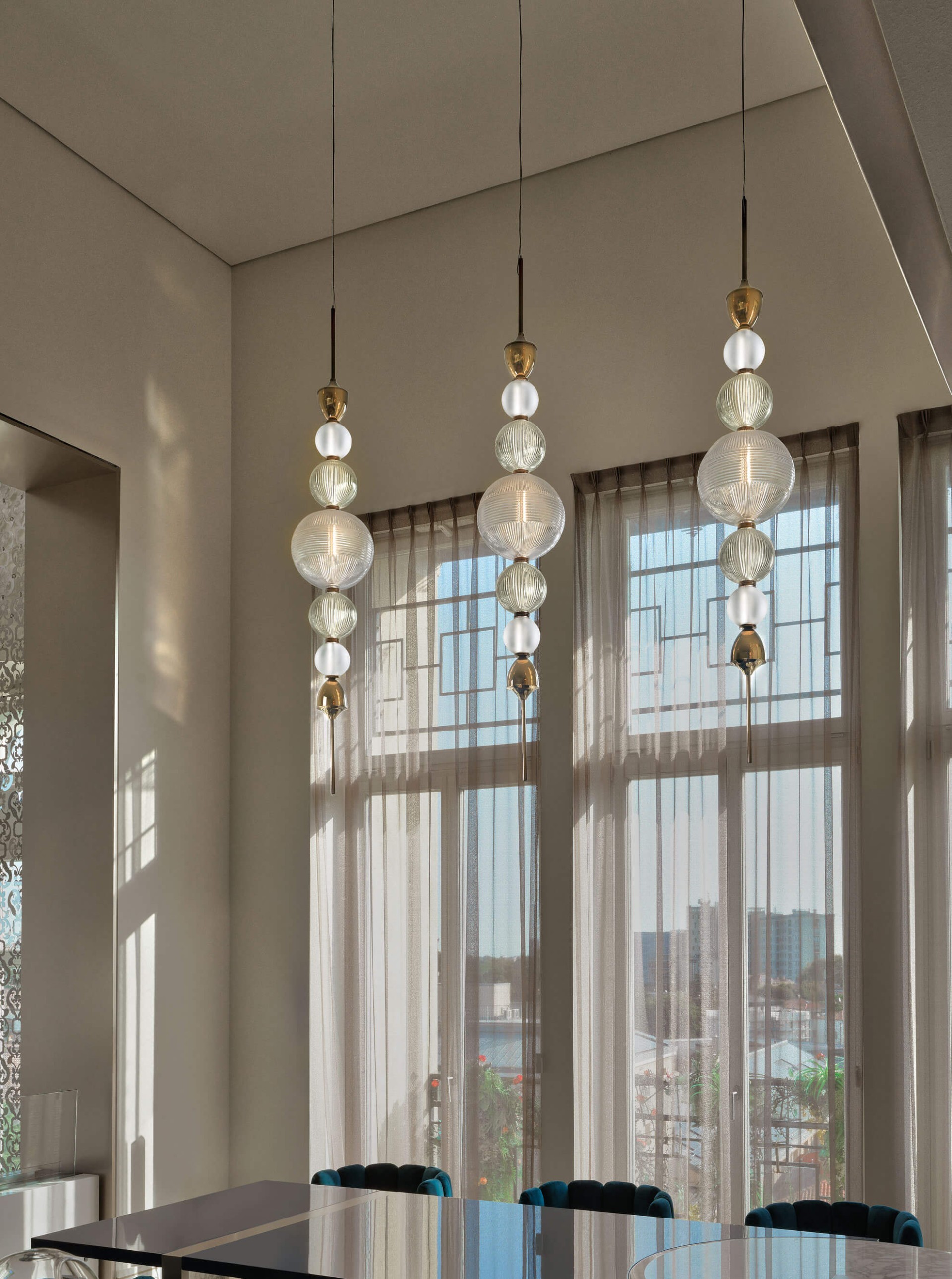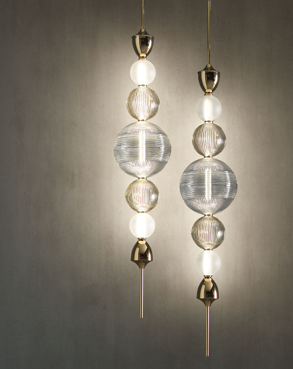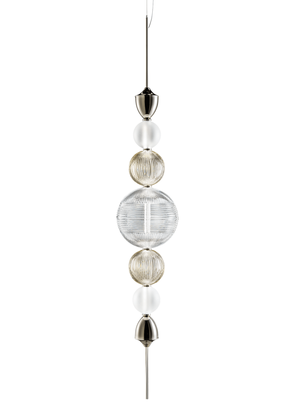 Подвесной светильник с металлическим каркасом с отделкой из светлого золота или никеля и рассеивателем из выдувного хрусталя ручной работы.