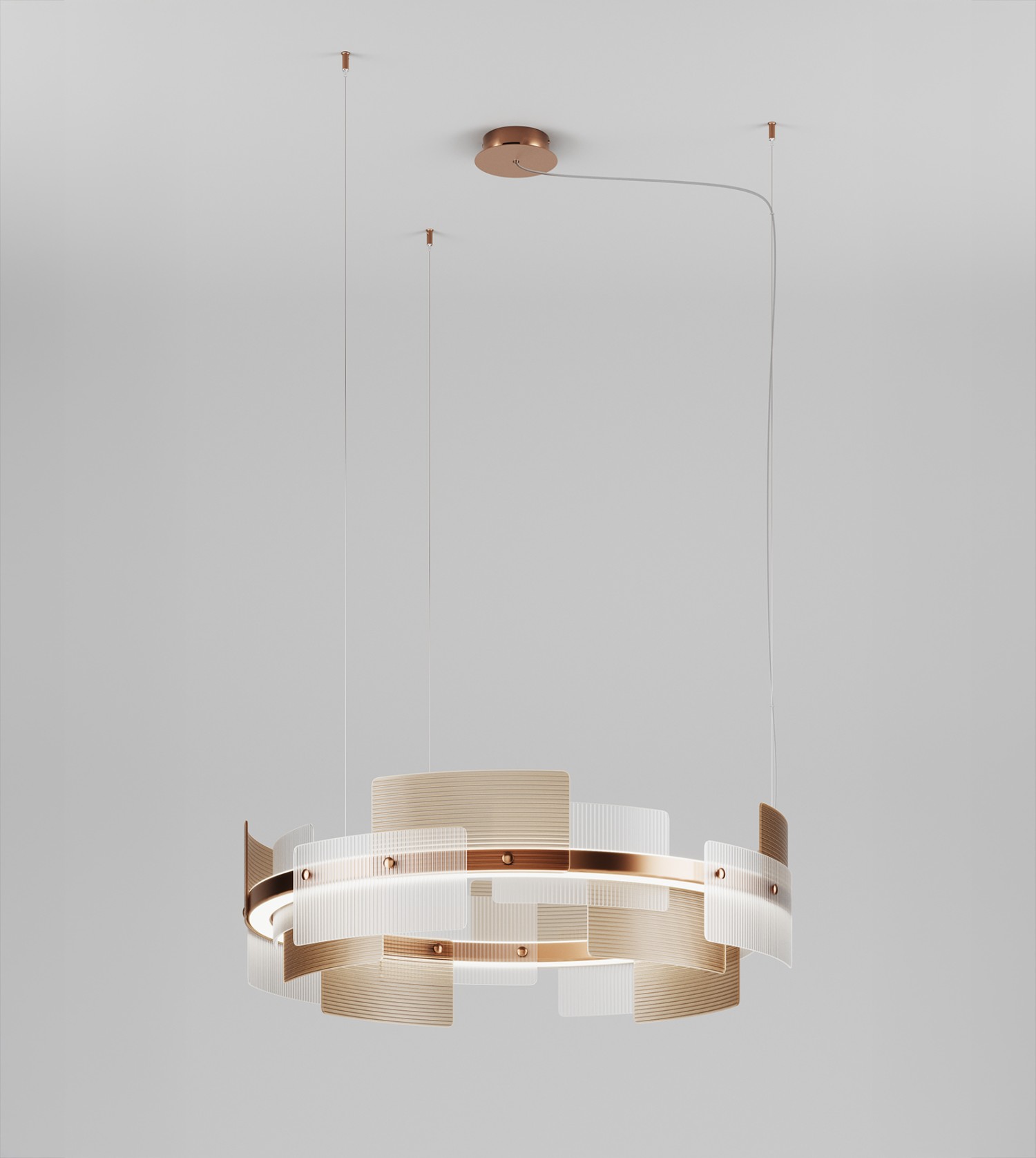 Подвесной светильник доступен в матово-сером металлическом каркасе с микроребристым сатинированным белым и дымчатым сатинированным стеклом или в металлическом каркасе цвета сатинированной бронзы с микроребристым сатинированным белым и сатинированным тиковым стеклом. Рассеиватели из опалового метакрилата.