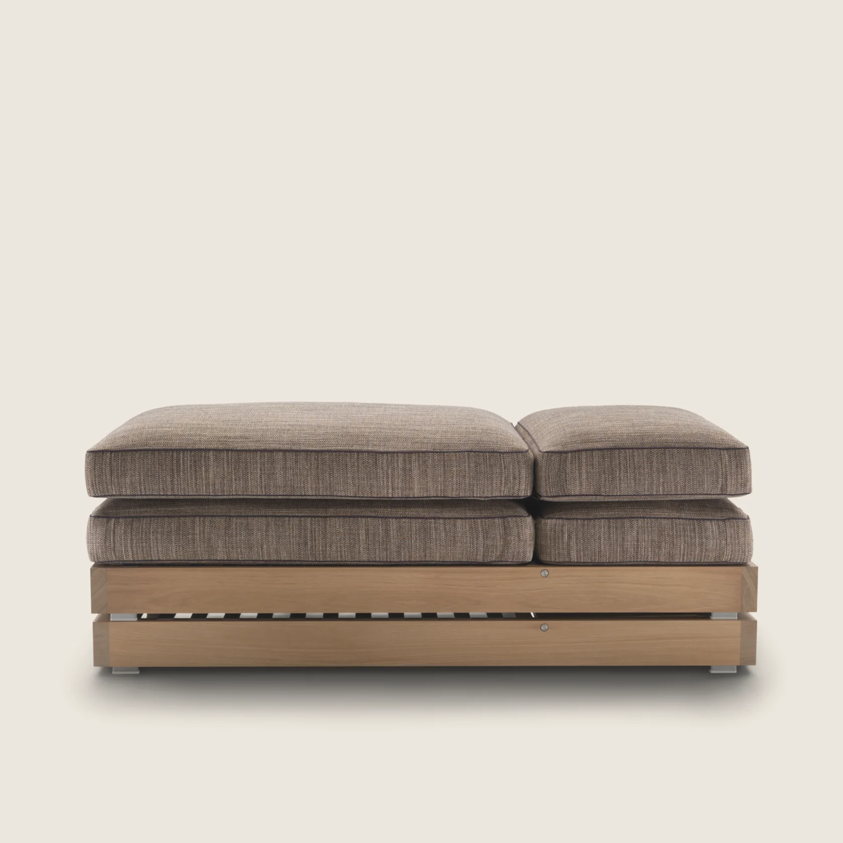 Каркас из массива ироко с различными отделками; алюминиевые ножки; подушки с водоотталкивающей обивкой.