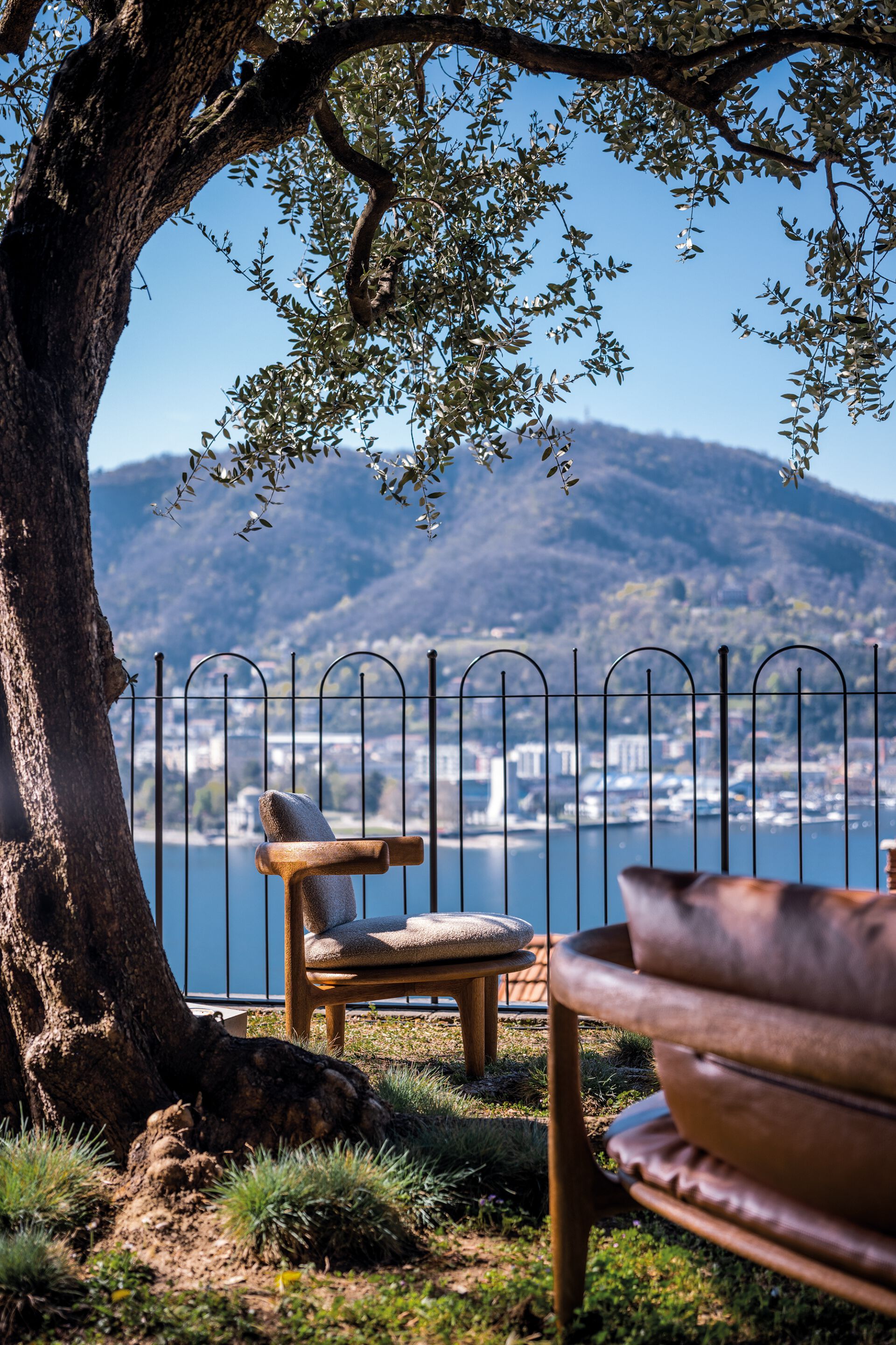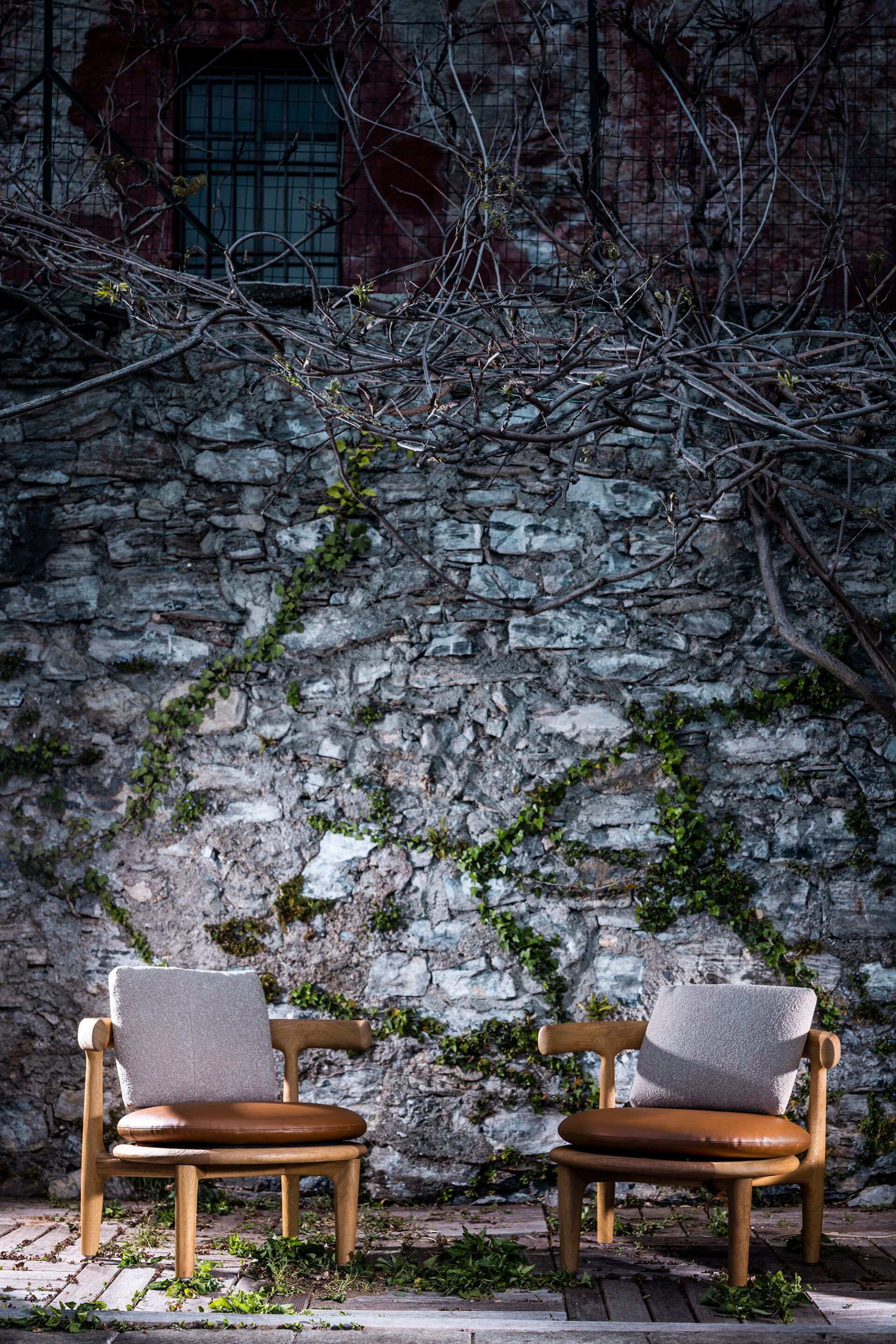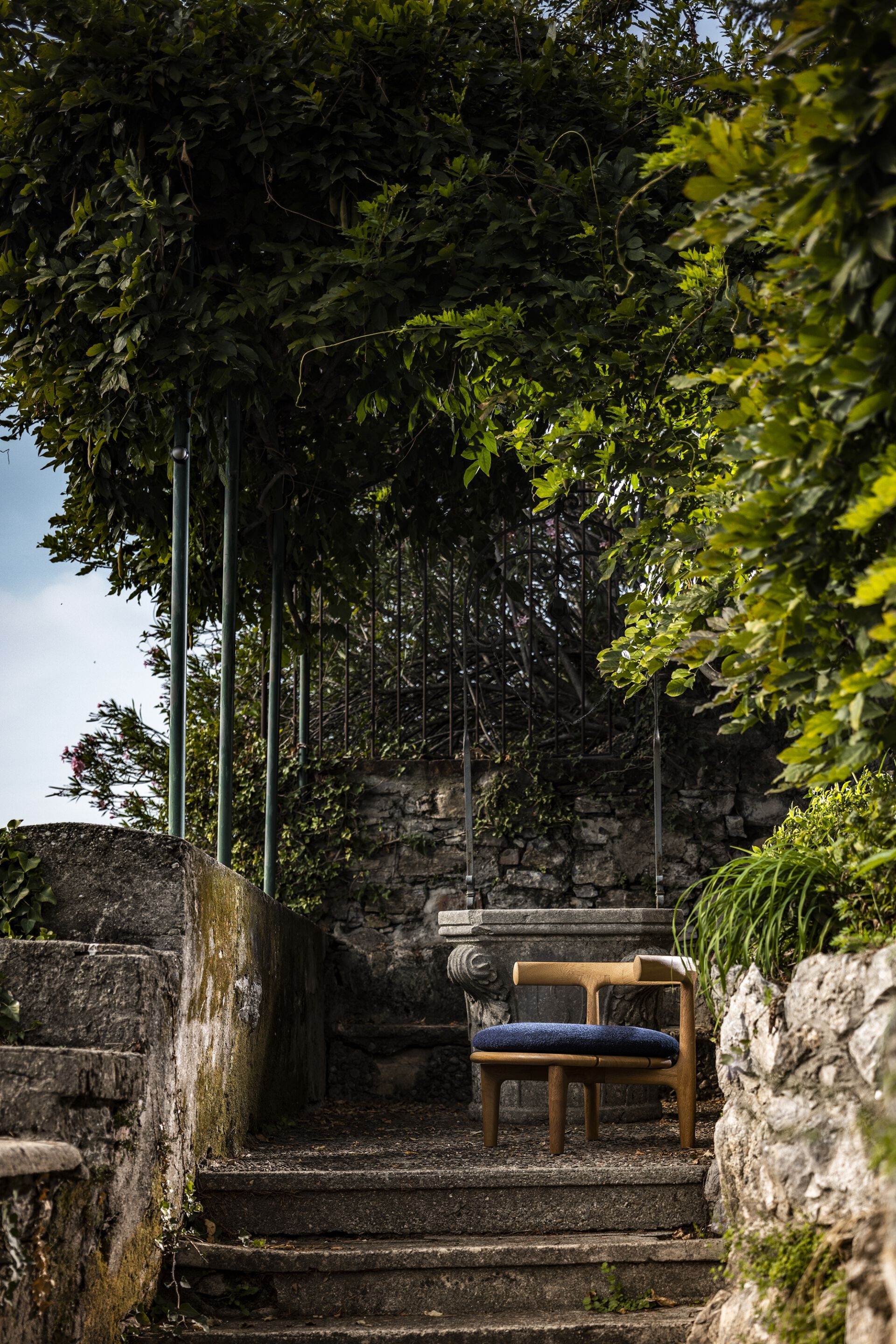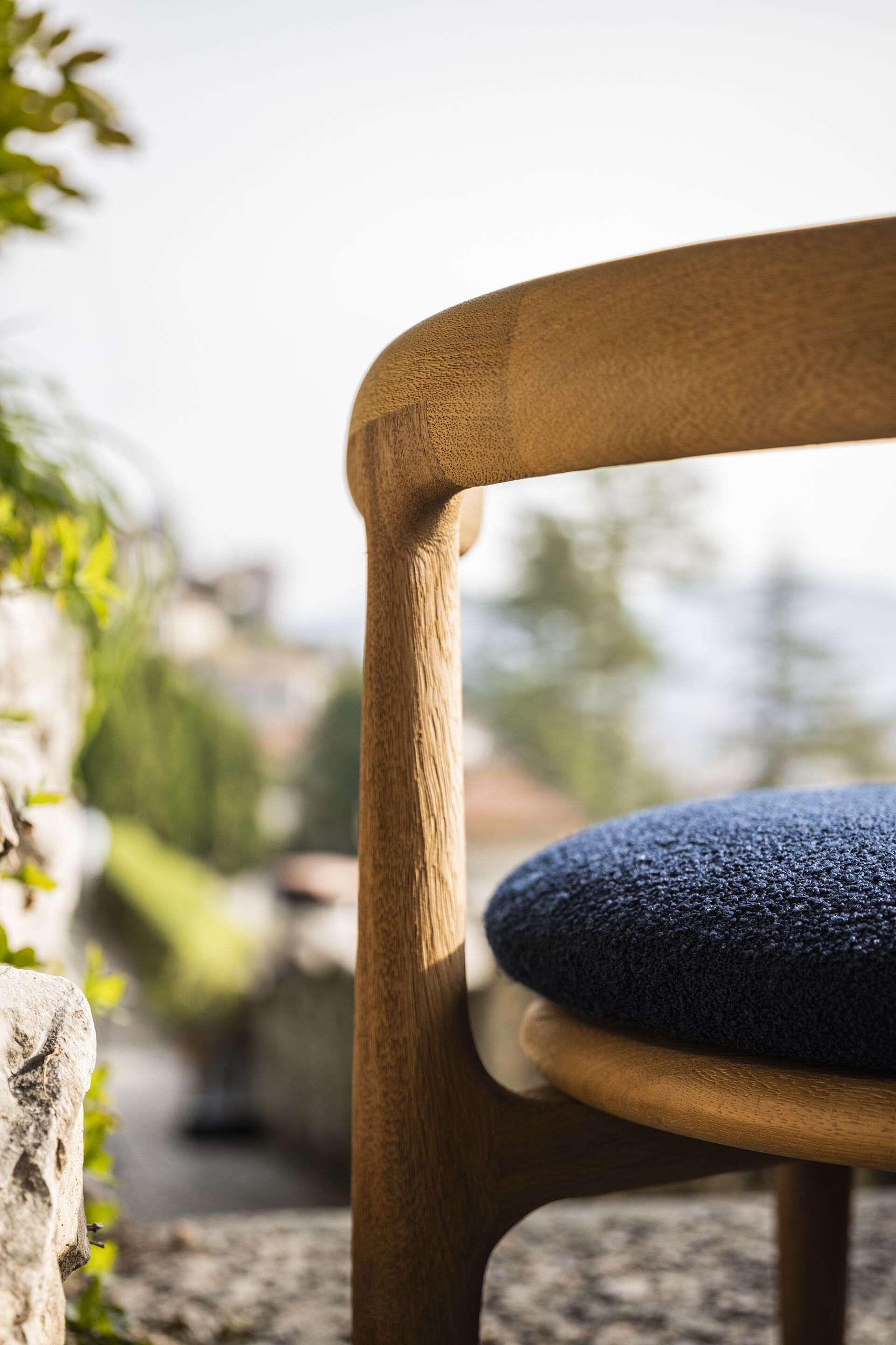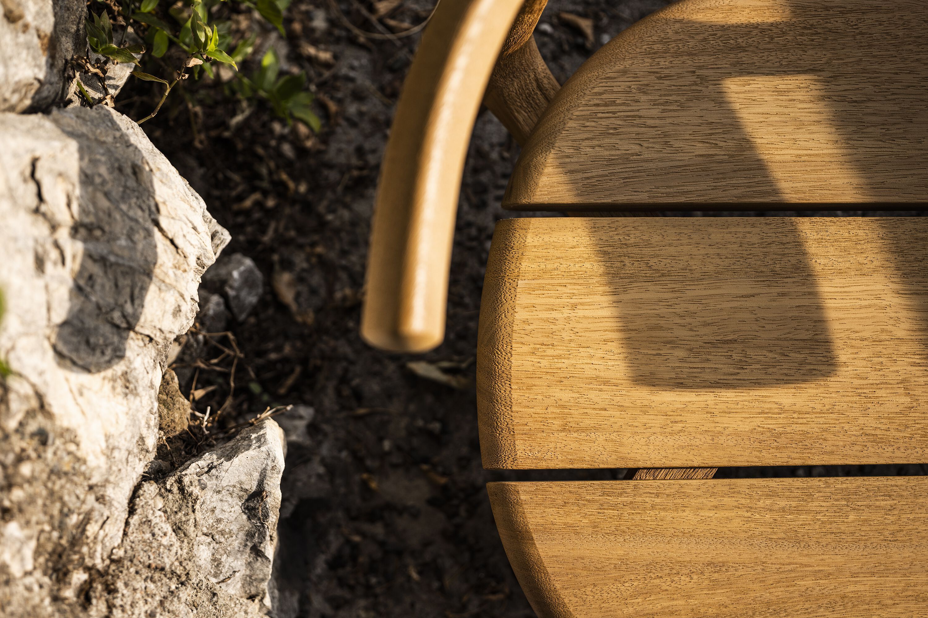 Himba — стул для сада из ироко с интегрированной кожаной подушкой. Каркас из пескоструйного массива ироко с масляной отделкой. Съемные сиденья и декоративные подушки с уникальной плотностью полиуретановой пены, подходящей для уличных условий. Нижняя часть покрыта нескользящей резиновой тканью.