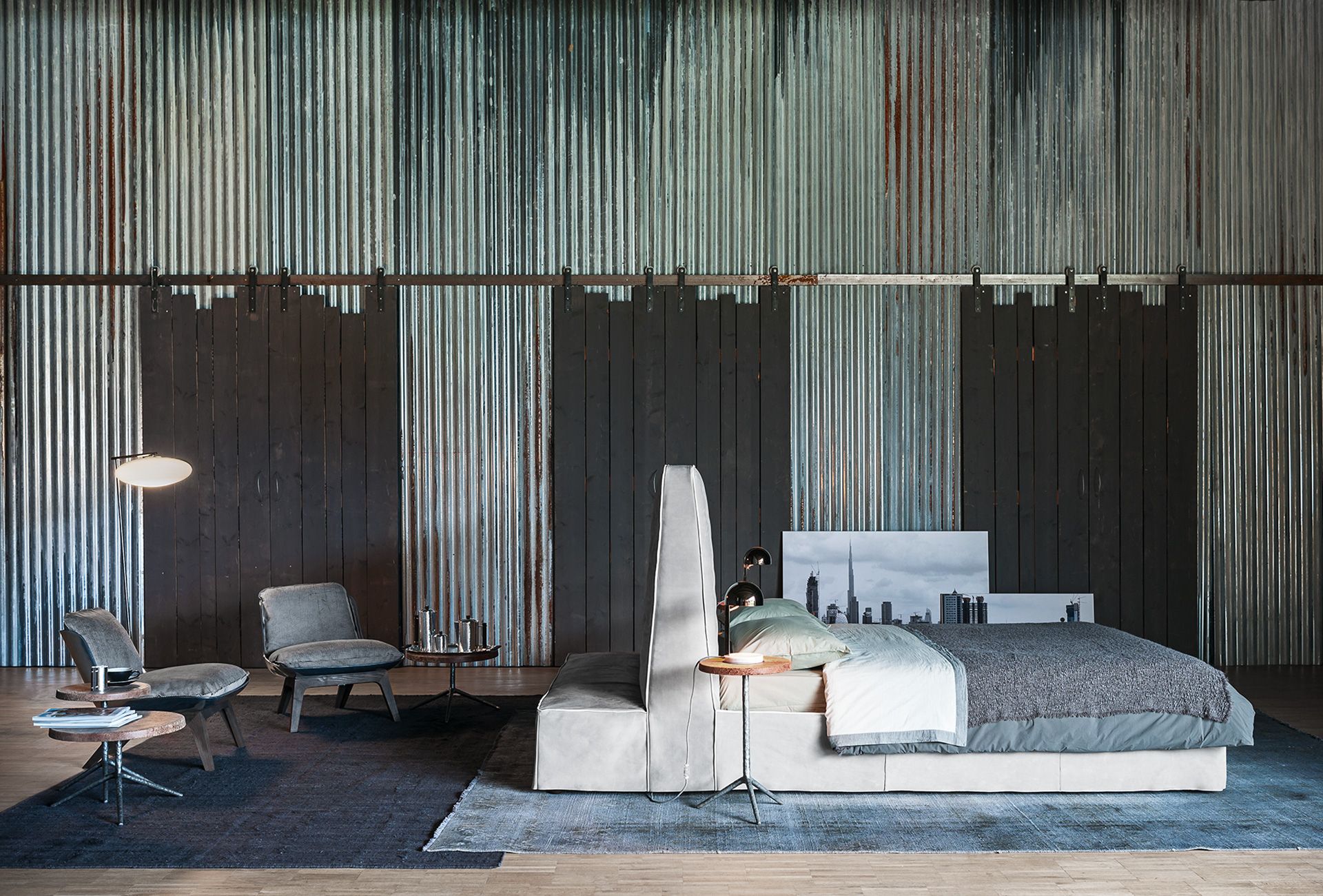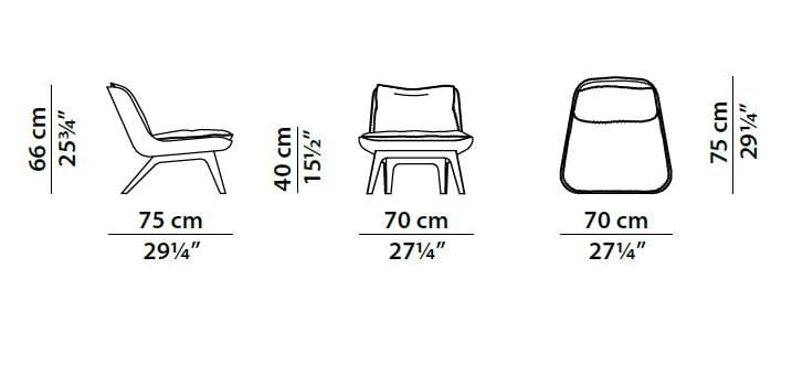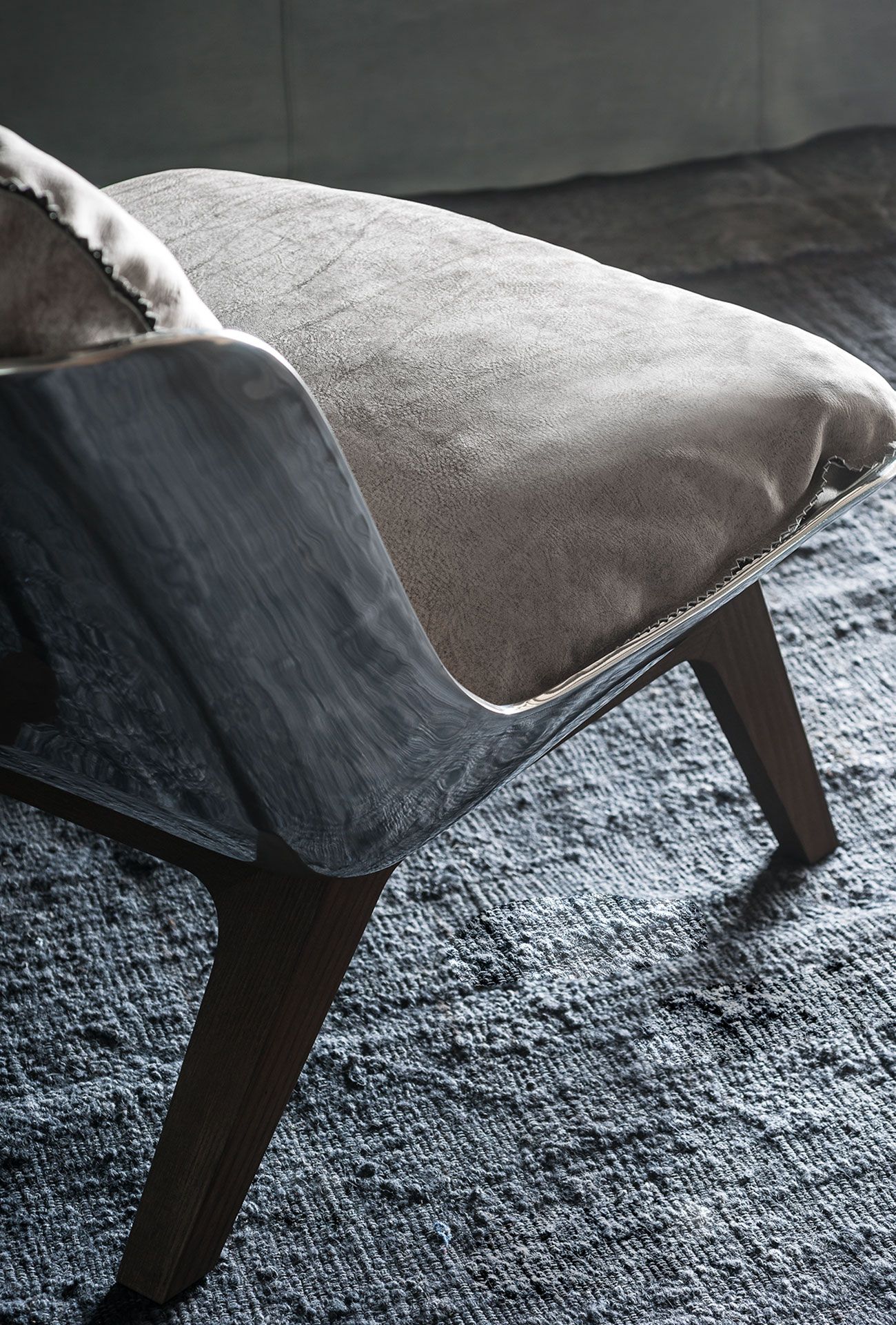 Нижняя часть выполнена из массива ясеня, тонированного под орех, с блестящей отделкой. Корпус толщиной 7 мм отлит из полированного алюминия. Подушки — из пуха и полиуретана разной плотности. Кожаная обивка с декоративной строчкой. Модель доступна только в мягкой коже.