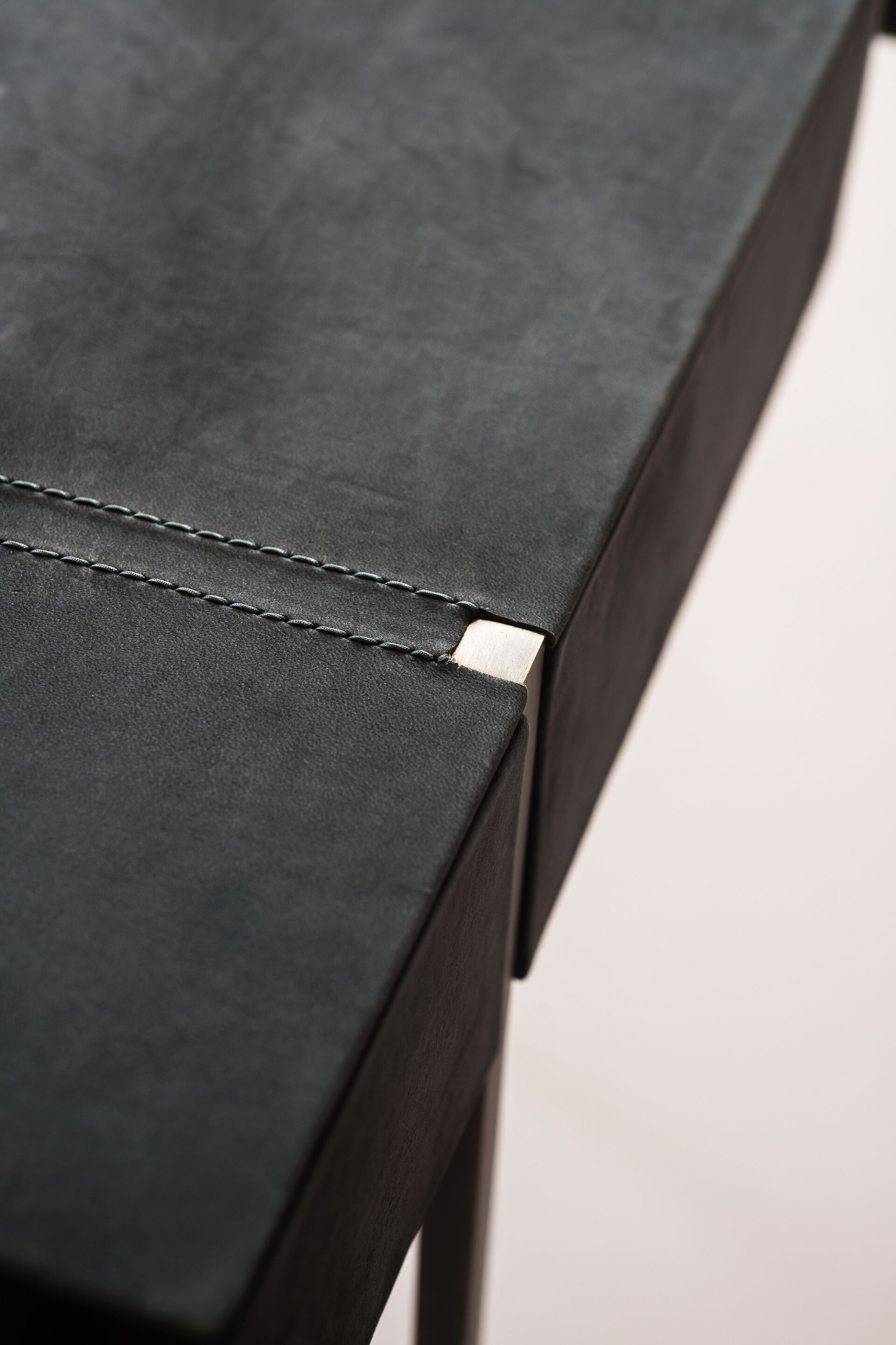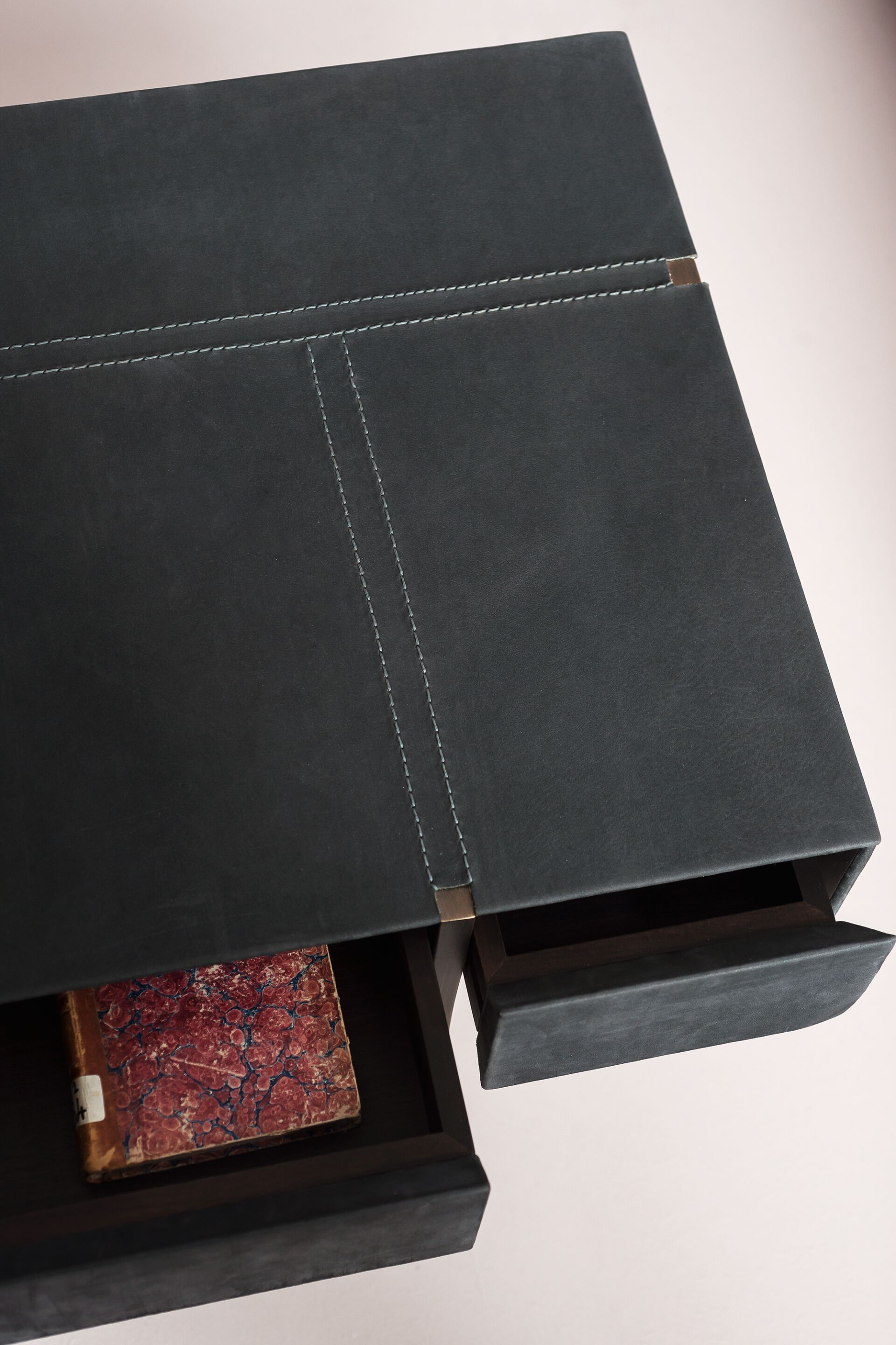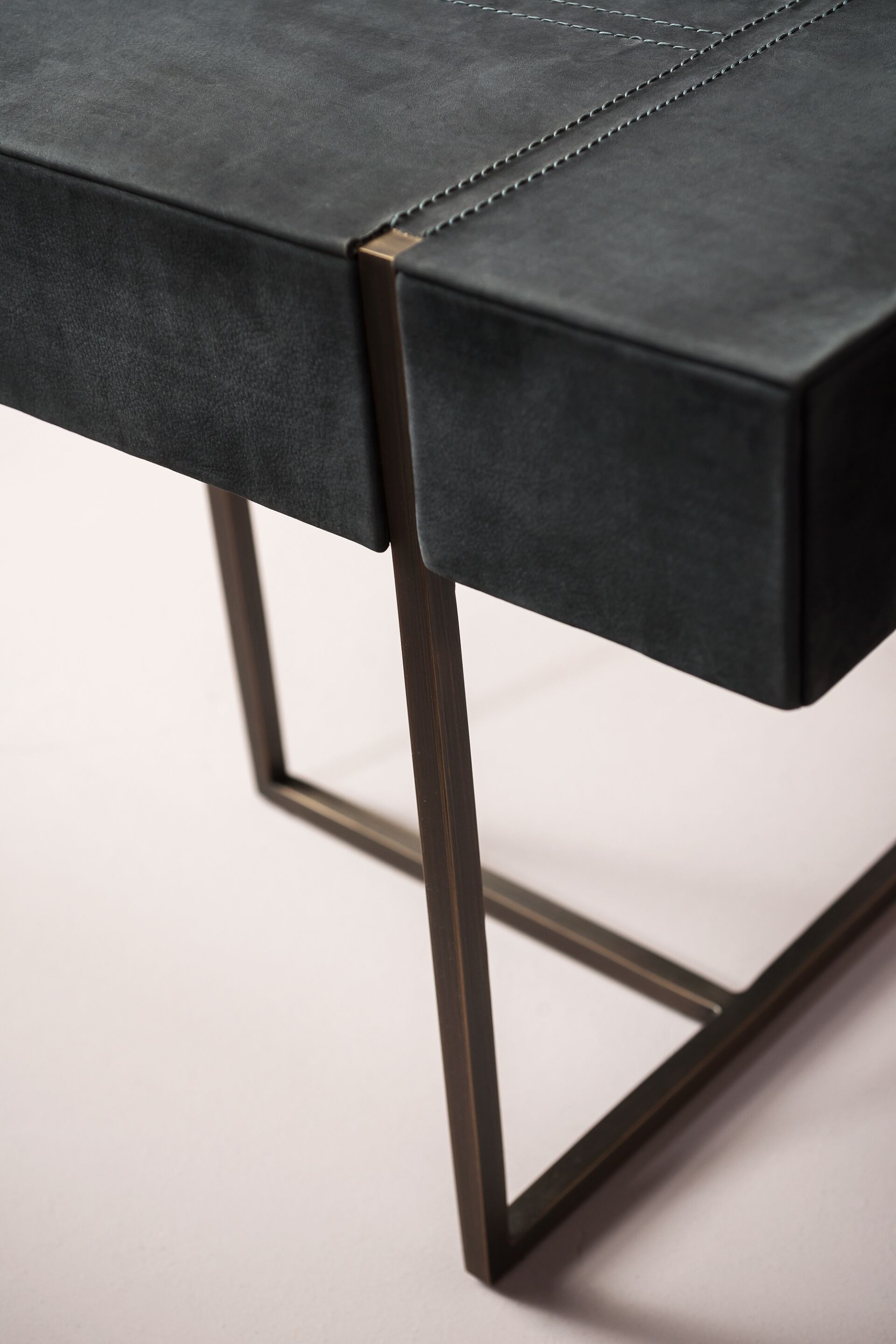 Тумбочка Icaro с основанием из металла с сатинированным латунным покрытием, ручной отделкой или с сатинированным никелированным покрытием с матовой отделкой. Структура из МДФ с фанерой канадского ореха. Внешняя структура из алюминиевых листов, покрытых кожей. Ящики из массива канадского ореха.
